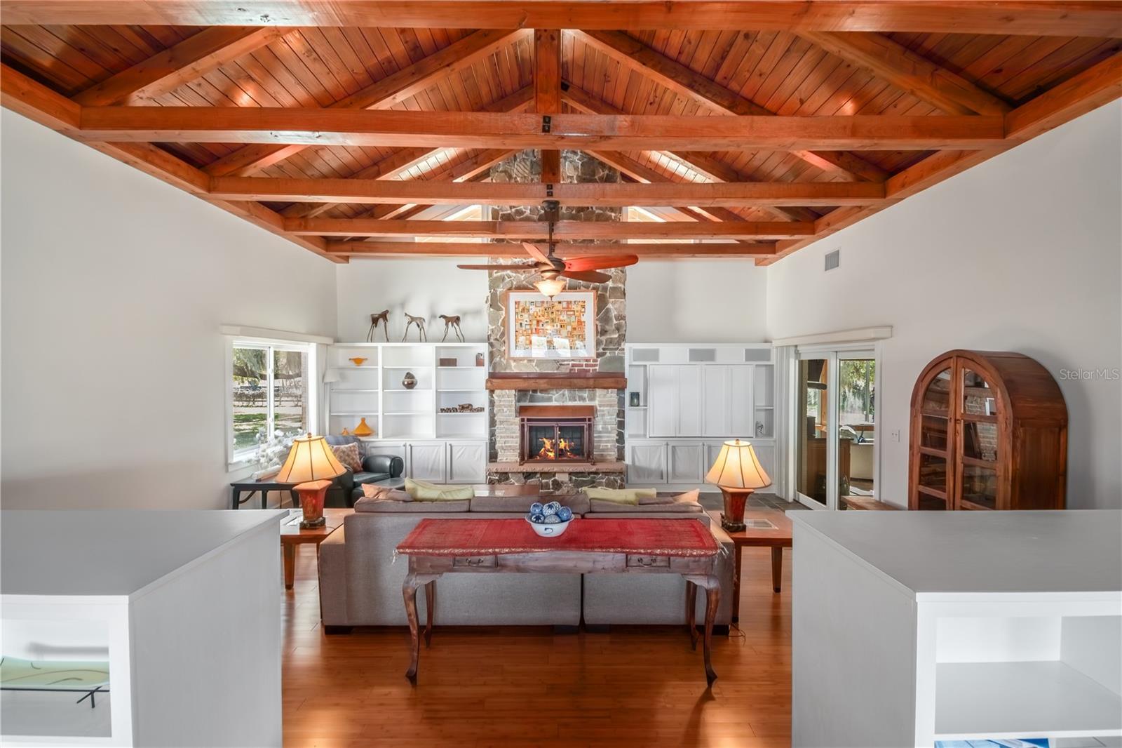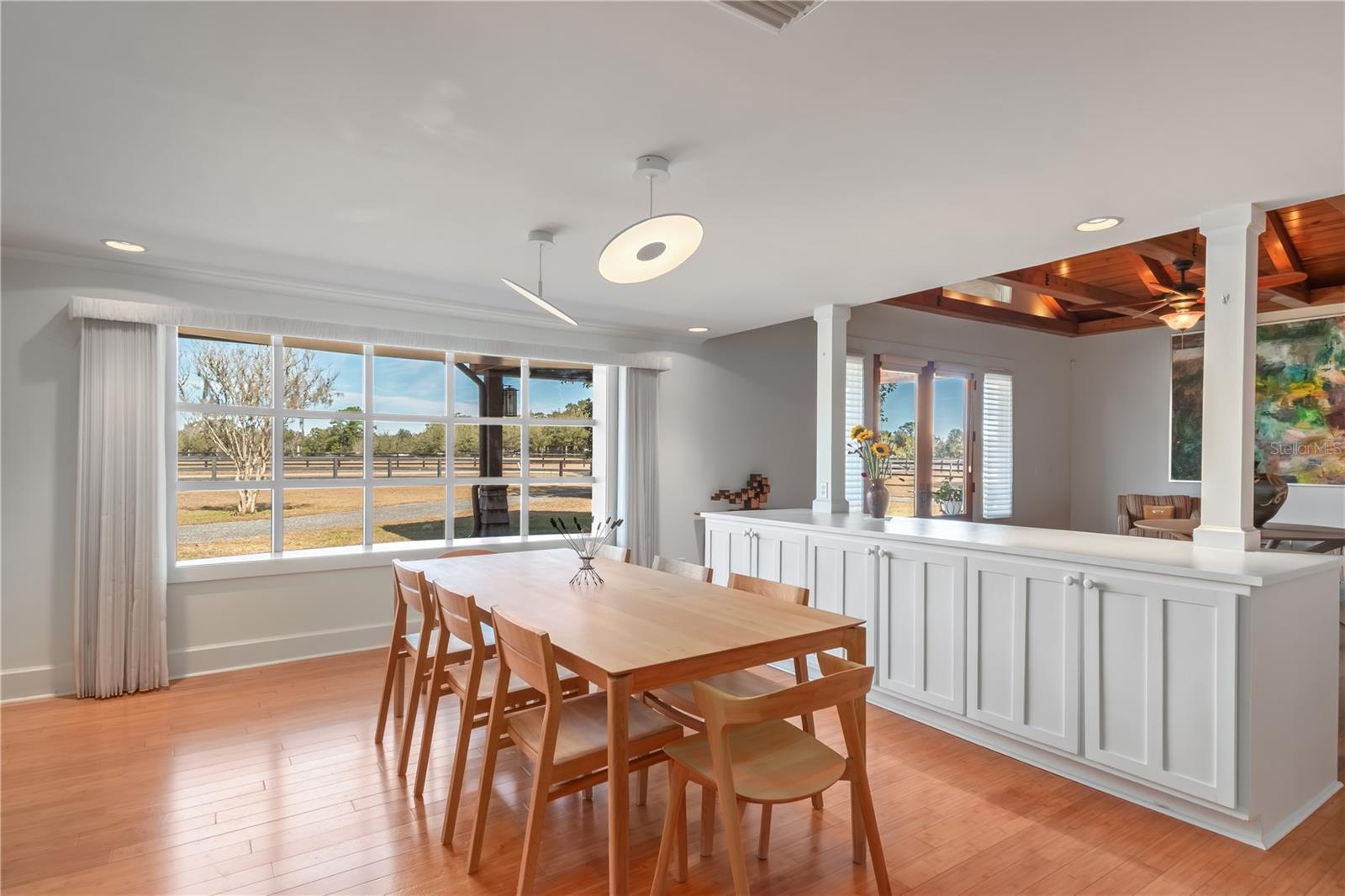 Tucked away on 12-acres of countryside, this thoughtfully designed equestrian estate blends comfort, functionality, and peace of mind. Surrounded by larger properties that enhance privacy, this farm features a perimeter riding lane and is secured with 3-board and diamond mesh no-climb fencing. Whether you’re a serious equestrian or simply seeking a quiet country retreat, this farm offers it all. As you enter the gate, the paved driveway splits allowing you to follow back towards the barn or towards the home’s circular driveway with portico. Offering a total of 4-bedrooms and 3-baths, the home has been fully renovated with over 3,100 sq ft of space with bamboo and tile flooring running throughout. The heart of the home is an open great room, which features 18’ beamed ceilings and a large wood-burning fireplace framed in stone and flanked by custom built-ins. The kitchen is a cook’s dream with hickory cabinetry, granite counters, a stainless gas range with pot filler, and custom pantry storage, including pull-out shelving and lazy Susans. A large island seats six, while the adjoining butler’s pantry/laundry area features a second full sink and abundant cabinetry. A private guest suite rests to one side of the home with its own private bath, offering ideal in-law or visitor accommodations. The primary bedroom is spacious and serene, with built-ins under a picture window, dual walk-in closets with custom drawers and shelving, and a luxurious en-suite featuring dual vanities, soaking tub, walk-in shower (steam-ready), and skylight. Two additional guest bedrooms share a full bath, and are located on the same side of the home as the primary bedroom. Off the kitchen, the three-sided windowed sunroom expands your living space with a cathedral ceiling, 2 wine fridges, built-ins, 9.1 surround sound, and panoramic views of the back pasture. Step onto the large, covered open-air room with 18’ ceilings and a wall-mounted TV—perfect for relaxing or entertaining and the private back yard. The center aisle barn has six stalls, grooming stall, wash rack with tankless hot water, AC tack room, feed area, mounted fans, copper gutters, and metal awnings. Two additional barn structures provide six more stalls /run-outs across three bays each, with mats, fans, electric, and water, ideal for turnout or overflow. The entire property is equipped with solar– three PV systems totaling 20.5KW (owned outright)—which deliver significant utility savings. The home, barn, and sheds are fully wired, with cameras, power outlets, and water spigots thoughtfully placed throughout. Additional features include an outbuilding with massive flex space / storage and a climate-controlled section with mini-split, laundry, sound system, and lots of possibilities. The tree studded property has great ground and is the ideal location. Located just 10 minutes from Sweet Dixie South, 15 minutes from HITS, and 20 minutes from WEC, this farm is ideal for those looking to get the most out of Horse Country!
