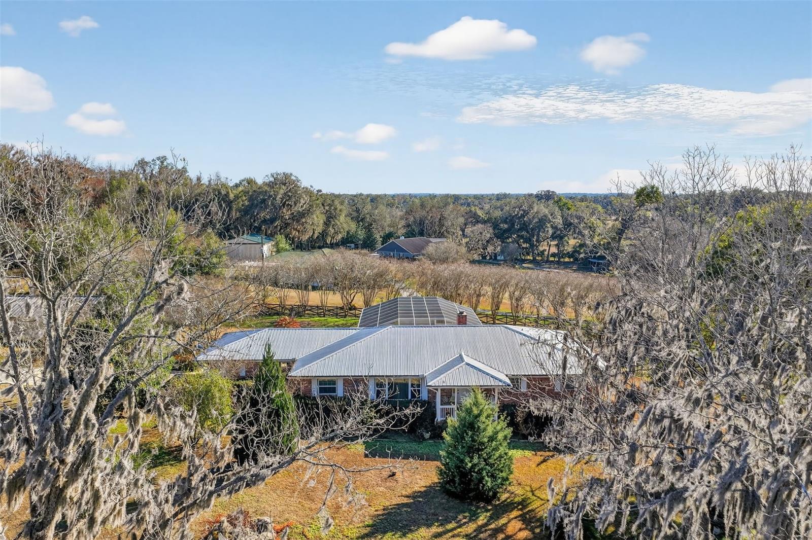 IN THE MIDDLE OF HORSE COUNTRY. Very nice, 2,470 square foot brick ranch on 1.5 acres. Three bedroom, three full bathrooms, formal dining room, large kitchen with huge island and breakfast nook opens up to the family room with an all brick natural fireplace. Two car attached garage, plus three car detached garage/work shop/barn. New metal roof (2017), new water heater (2022), new plumbing (2018), new septic tank and drain field (2018). Completely updated kitchen with very large island, solid wood cabinets with soft close drawers and doors, granite counter tops and ceramic tile floor (2016). Spacious lanai overlooking a very large inground swimming pool with surrounding bird cage. Completely fenced in with gate across driveway. Only 4 miles from churches, shopping, doctors, hospital and restaurants. This home is in excellent condition. Call today for a private showing.