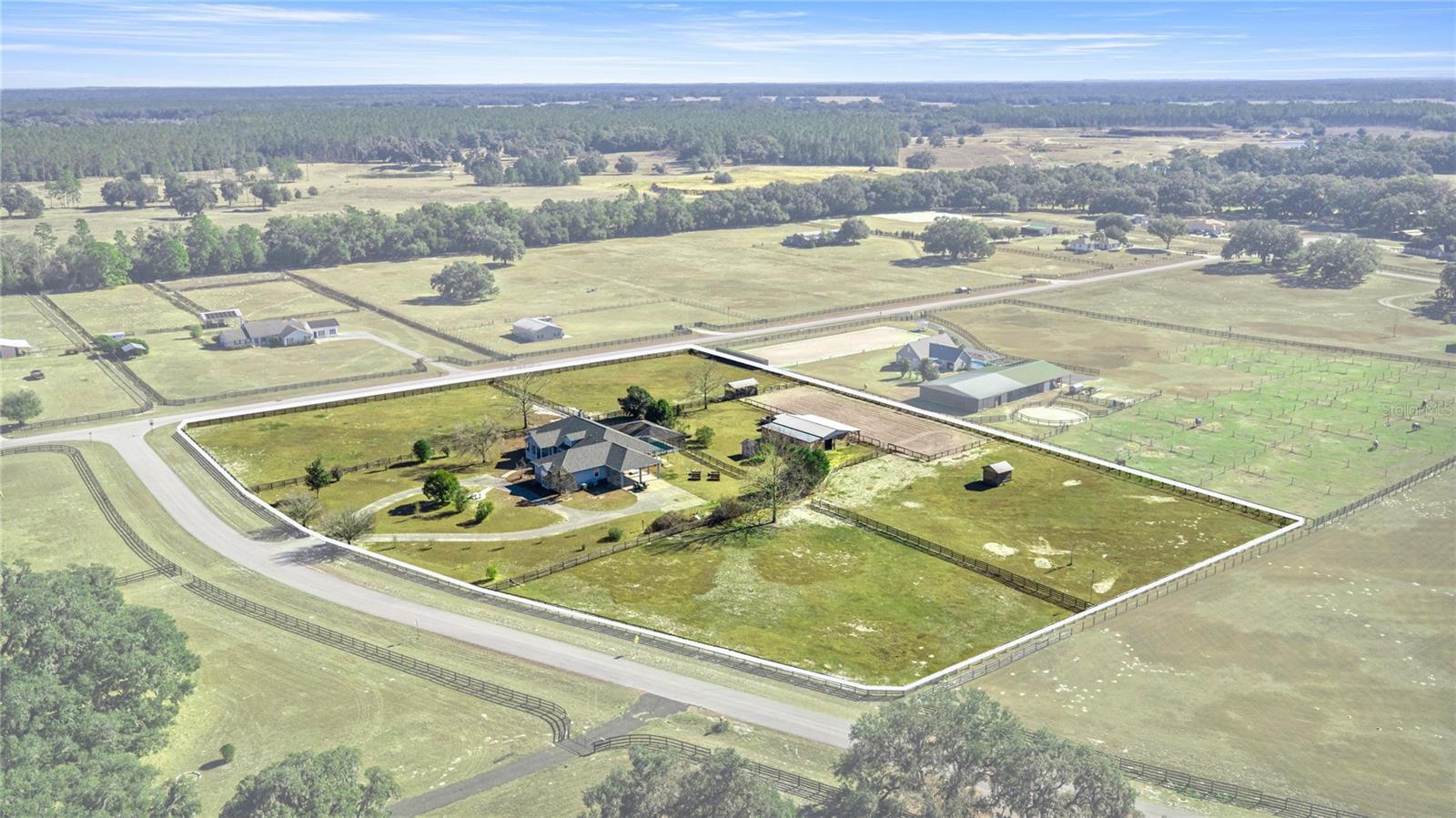 Turnkey equestrian farm on 5.85 gated and fully fenced acres, in the heart of horse country; thoughtfully designed for serious horse owners and animal lovers alike. This well-appointed property offers a gorgeous 5 bedroom 4 and ½ bath home with an exceptional setup including a 6-stall center-aisle barn with wash rack and air-conditioned tack room; an additional 2-stall barn; a maintained, natural-sand, dressage-size arena, four fenced paddocks (water to two), field shelters, and a hay shed, plus a separate workshop/shed with 220V electric. Bring your horses and your mother-in-law! Everything in place and ready to go. The land itself is both functional and serene, featuring apple, peach, and orange trees and a designated wildlife sanctuary area, creating a peaceful balance of productive farm space and natural beauty. Offering over 4300 sf of living space, this impressive estate features a sparkling screen enclosed pool, expansive outdoor living space, and a functional layout for everyday living and entertaining. This home, built in 2001 as a multigenerational home with two Primary Suites on opposite wings features: dual suites with en-suite baths and dual walk-in closets, three additional en-suite bedrooms, a dedicated office/den with built-ins, and a spacious living room with gas fireplace. The large kitchen offers abundant counter and cabinet space, breakfast bar, breakfast nook, and all appliances. A generous utility/laundry room with access directly from the outdoors, features built-in cabinetry, sink, storage closet, and washer and dryer—perfect for active farm living. Located in the equestrian community of Winding Oaks, just 15 minutes from riding trails. Horse enthusiasts or hobby farmers will appreciate the proximity to the World Equestrian Center, HITS and other horse venues. There is plenty of room to grow gardens, raise animals, or to homestead. This property delivers the rare combination of a fully equipped horse farm, privacy, and a comfortable, well-designed home—an ideal setting for training, recreation, and true country living. Don't miss this rare opportunity to own a truly unique property.