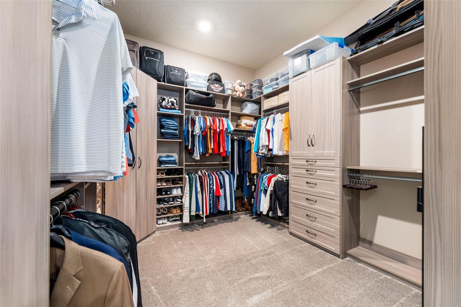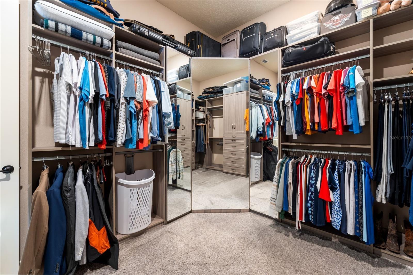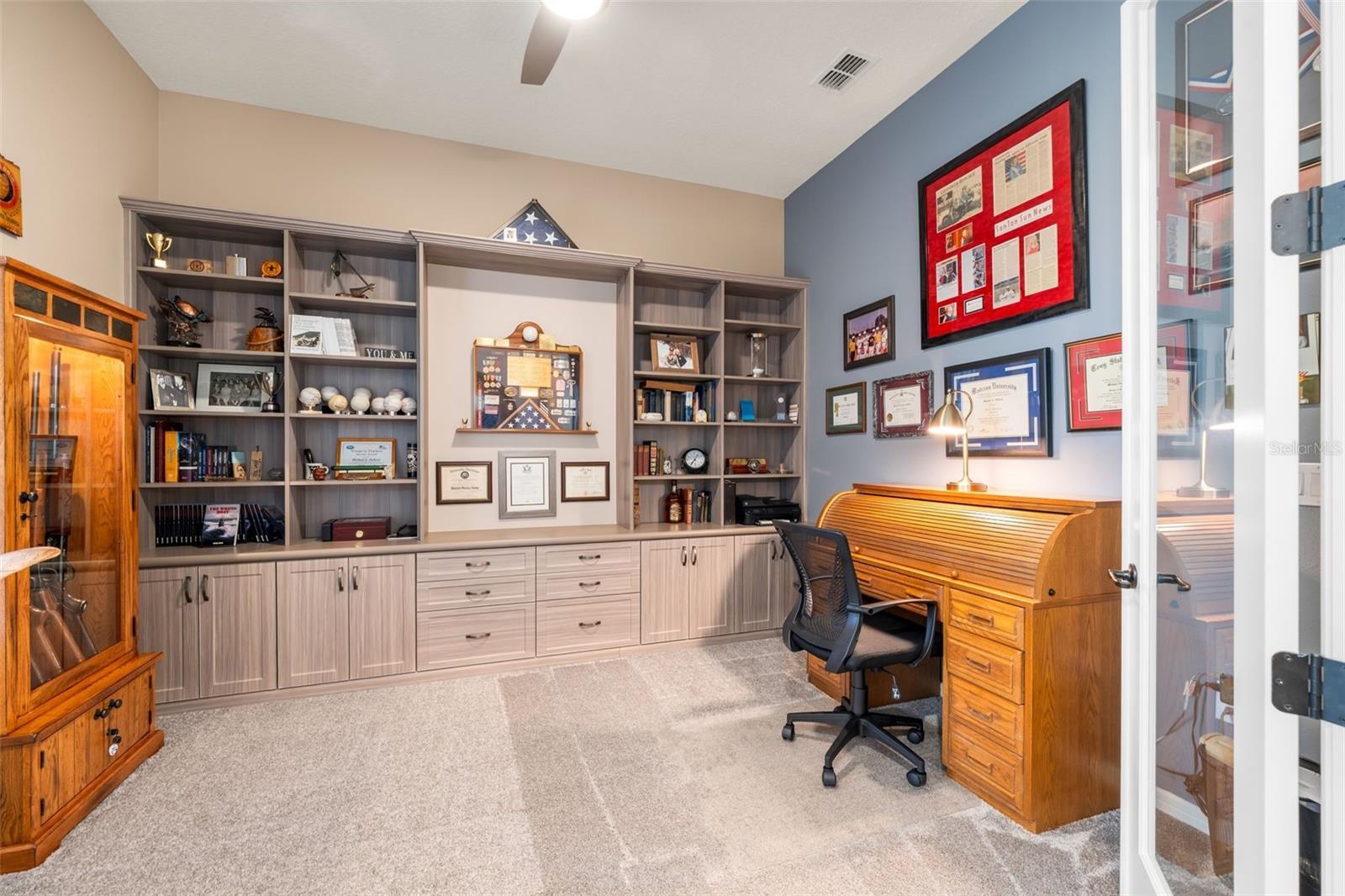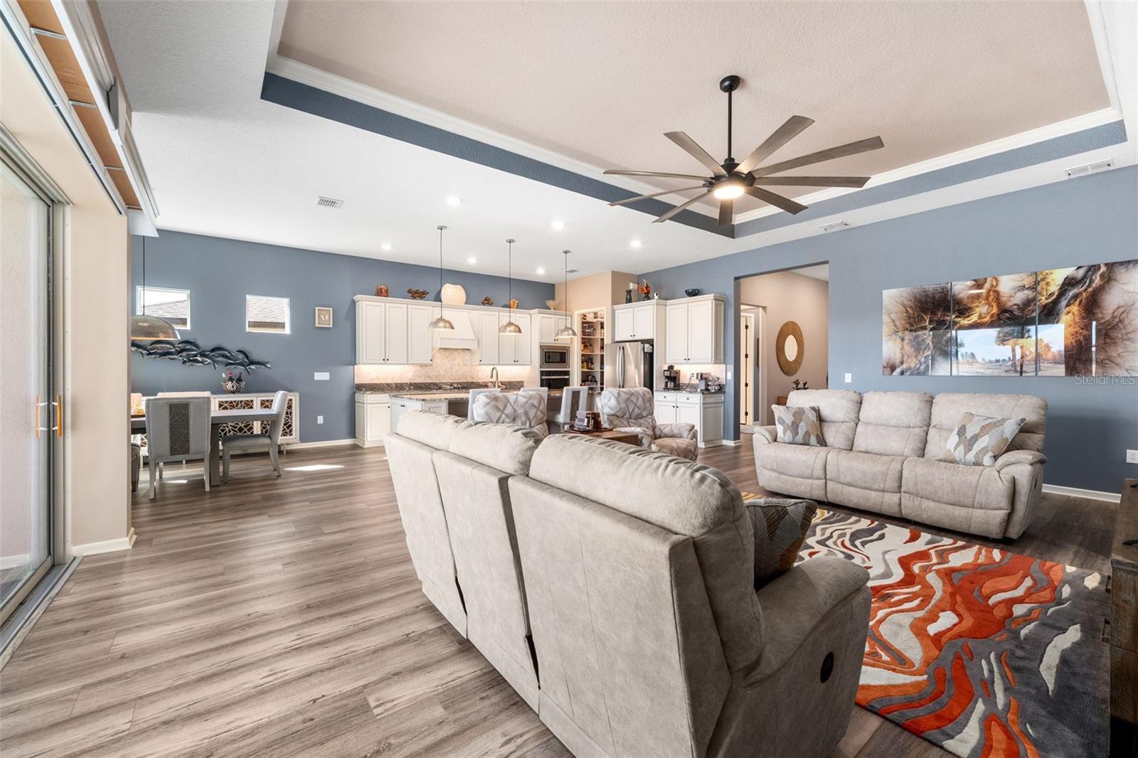 Live in one of Ocala’s premier 55+ communities, Del Webb Stone Creek, and own one of its most stunningly upgraded homes. This highly distinctive Stellar model, built in 2023, has been lightly lived in by part-time owners and feels nearly new. Perfectly positioned on a premium golf course lot, the home overlooks the 16th green, with the fairway to the left and the 17th tee to the right - beautiful views without concern for errant shots. Offering 2,512 sqft. of living space, this home features 3 bedrooms, 3 full bathrooms, and a dedicated flex room/office with French doors and a fully custom wall of built-in cabinetry and shelving. The Great Room impresses with a tray ceiling, remote-controlled fan/light, and an expansive sliding glass door that opens to a spectacular outdoor living space. The rear of the home has been enhanced with a large textured concrete patio and a custom screen enclosure spanning the full width of the home, complete with panoramic vision screens on the walls and protective sunscreen mesh across the roof. The kitchen is fully equipped with SS appliances, gorgeous granite countertops, elegant cabinetry, and hand-made imported Moroccan pendant lights. A spacious pantry features custom wooden shelving, replacing standard wire racks. Guests will enjoy a private front suite with a bay window, full bath, and a beautifully crafted custom queen-sized Murphy bed with storage. The Primary Suite offers golf course views, a tray ceiling, and remote-controlled fan/light, along with a spacious Primary Bath with dual vanities, glass frameless shower, and fully customized closet featuring a dramatic built-in three-panel dressing mirror. A lockable safe also conveys with the home. Curb appeal shines with a paver driveway, a widened and rebuilt paver entry walkway, stacked stone accents around the 3-car garage with epoxy floor, elevated stone landscape beds, mature palms, and custom exterior lighting. With its vibrant paint palette, extensive custom upgrades, and many furnishings available, this design-forward home makes a statement. Don’t miss the opportunity to own a truly special Stone Creek residence - one that you’ll be proud to call home.