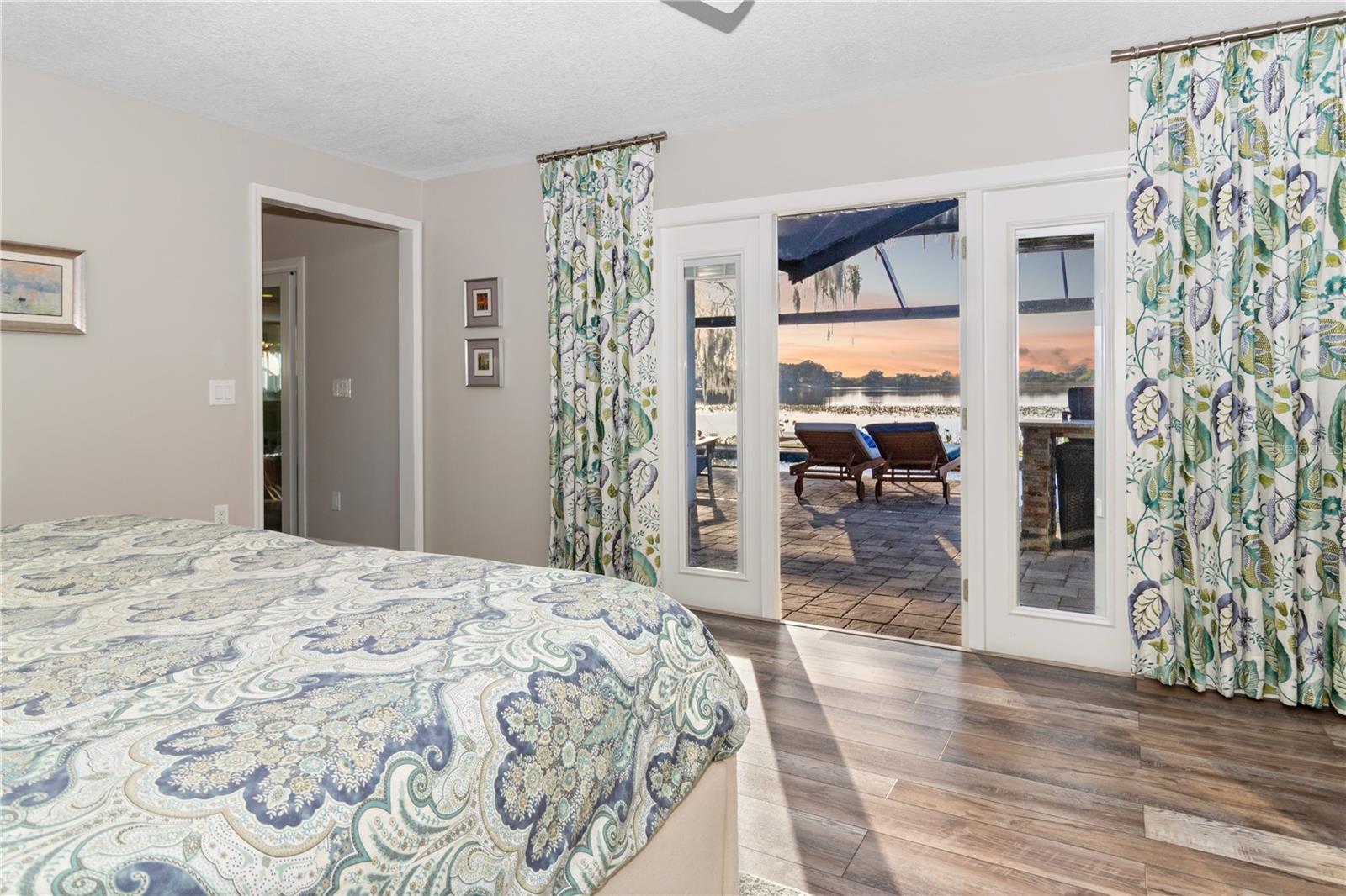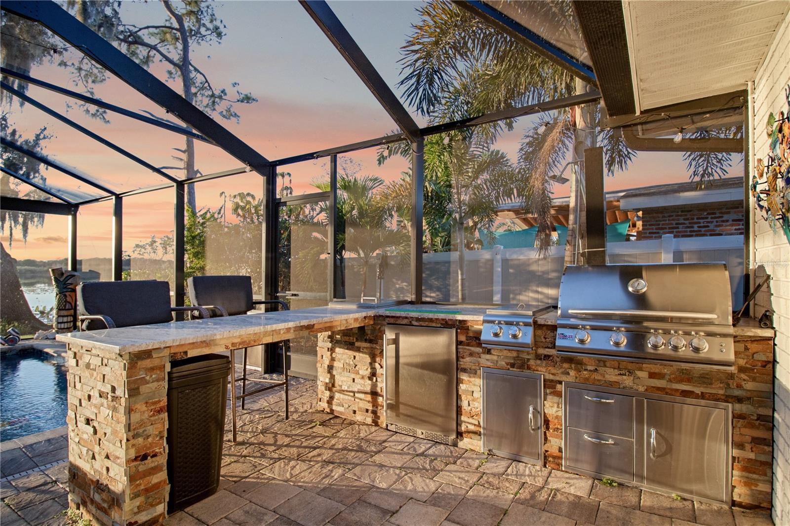 Lakefront living with a proper sunset! Down a private road with no HOA (because your house shouldn't come with a rule book). This renovated home offers direct frontage 80' on Lake Pansy and a bonus 80' of canal frontage across the street. The property provides excellent water access and endless sunset views. Outside is where this home really shows off with amenities including a heated saltwater pool / lap pool with markers on the bottom, lighting and water features, added style with a surfboard outdoor shower, screened in with panoramic panels because this view deserves center stage. The outdoor summer kitchen is outfitted with a refrigerator, table top ice chest, bar area, and a grill supplied by a 99-gallon propane tank, making it well-suited for entertaining all year round. The lanai is glassed in with cedar tongue and groove ceiling wrapped with motorized retractable sunshades, while enhanced landscape lighting and mature palm trees set the tropical tone. Additional exterior upgrades include a composite dock, fenced in yard, seamless gutters with leaf filters, and recently replaced garage and front entry doors. Inside, the vibe continues with an electric fireplace with customizable lighting (because ambiance matters). Live-edge floating shelves with integrated lighting adds a designer touch. Double-pane replacement windows, custom drapes, California Closets, luxury vinyl and ceramic tile throughout, laundry closet for added convenience. The kitchen brings the function and the flair with an island, generous storage, new cabinetry, quartz countertops, a natural gas range with hood ventilation, along with a built in microwave, electric oven, and refrigerator/freezer. The roof and HVAC system are approximately 10 years old. Additional features include LRE foundation improvements, and well-fed irrigation. Prewired generator hook-up installed in garage. The boat ramp is located on the west side of lake Pansy. This is a rare opportunity to own a turnkey lakefront property with endless sunsets, extensive upgrades, and no HOA restrictions.