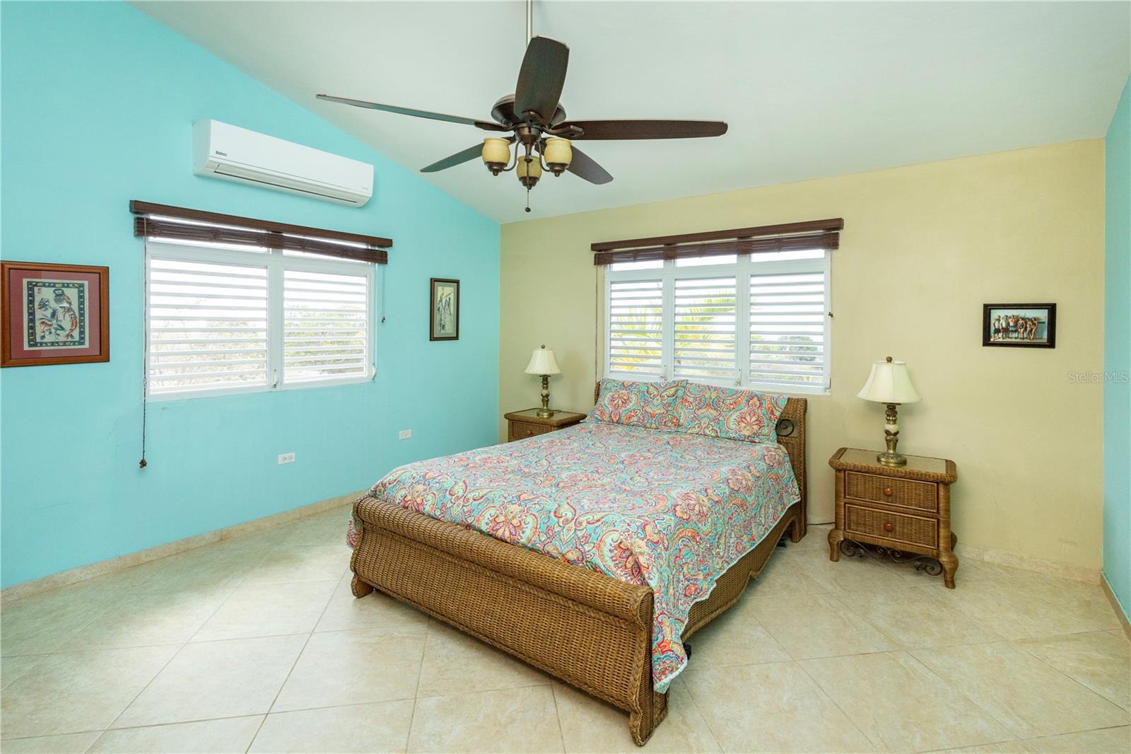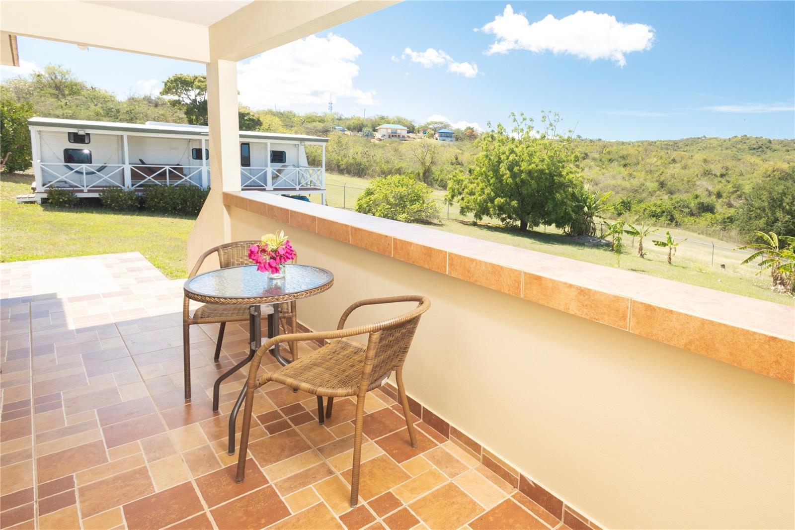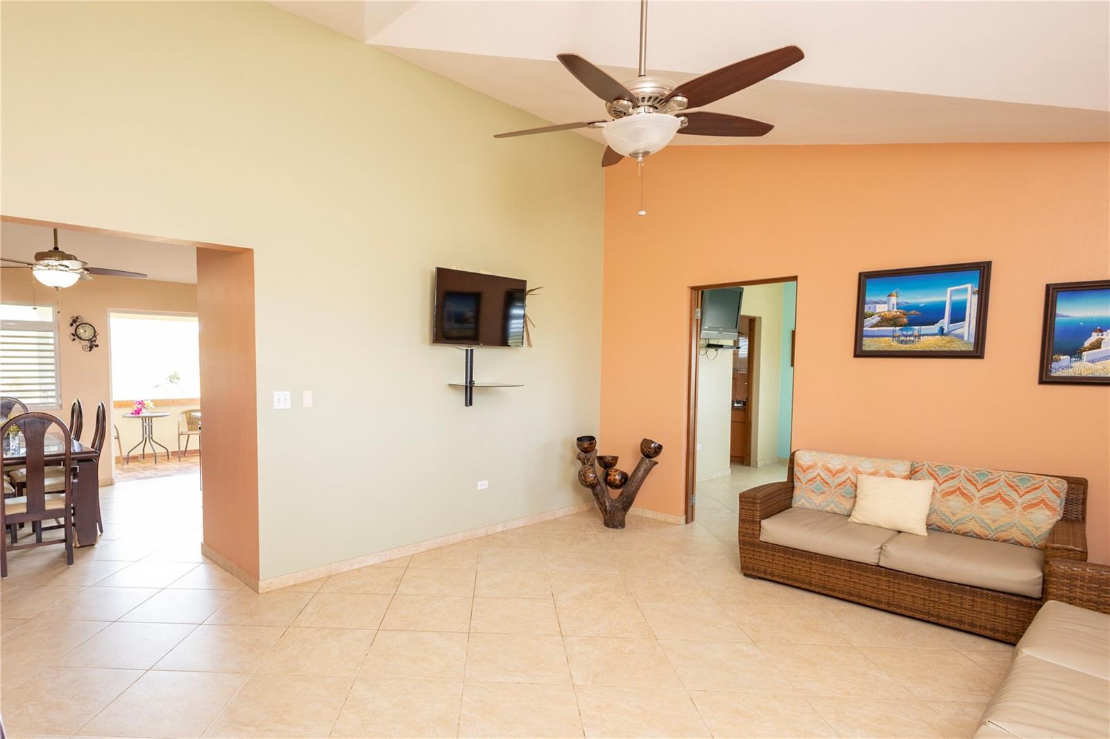 From its grand entrance in the bucolic neighborhood of Puerto Real to its vaulted interiors, this family owned residence has a stately appearance. The elegant home is set back on a hilltop and surrounded by cool trade winds, majestic views of the Caribbean, and tranquil rolling hills and meadows. The property has 1.6 acres of privacy, the land is scattered with a myriad of fruit trees, including breadfruit, mango, pigeon peas, soursop, gooseberry, lemon, and a variety of plantains and bananas. Built to withstand, the sturdy structure of poured concrete is comfortably designed, appointed, and spacious. The property features an open and generously sized living room and dining room with granite countertops, three bedrooms, two bathrooms and a separate two bed, one bath guest bungalow. Well fenced and fully equipped with a security system, air conditioning, solar system, generator, a dual chamber cistern that holds a rain water and public water supply, and a separate two car garage. The large garage has high ceilings and can hold a second story and be easily converted into an additional unit. Easily accessible from the airport and at just five minutes from Esperanza, Playa Negra and the Playa Grande reserve, this home has all the comforts one could ask for. Previously sold with 2 adjacent lots that have now been sold, price changes reflect the selling off of the 2 adjacent lots.