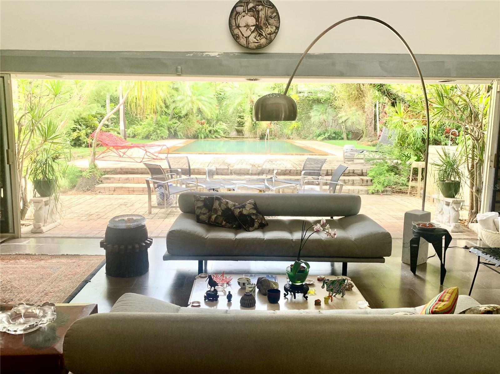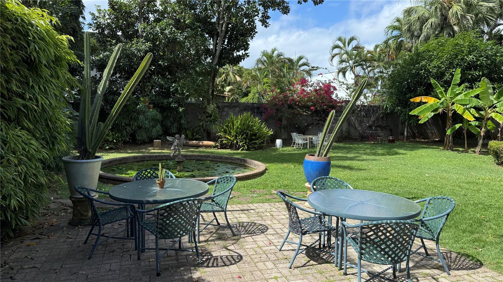 Welcome to this stunning architectural jewel in Garden Hills, a unique masterpiece designed by a renowned architect showcasing a harmonious blend of urban elegance and modern functionality, offering an unparalleled retreat just moments from the city and a few steps to the Caparra Country Club. The home sits on almost half an acre, one of the largest lots in Garden Hills. Situated in a very private dead end street, in a gated community, the residence is in Garden Hills, one of THE most exclusive coveted neighborhoods in Guaynabo and the San Juan metro area. This thoughtfully designed home features an open-concept floor plan perfectly integrating the ample dining area to the majestic Great Room with its soaring double height cathedral ceilings, all seamlessly flowing to the 3 terraces surrounding it in every corner. The perfect flow between the indoor and outdoor living areas connects all three terraces to the 2 tranquil koi ponds and the striking infinity pool in the center, providing a peaceful and serene oasis, yet also ideal for hosting and entertaining large gatherings. The home also boasts 3 bedrooms all with en-suite baths and a fourth flex room , or caretaker’s bedroom with bath, a family room, a powder room and an office with a separate entrance overlooking the scenic gardens. The master bedroom has its own private terrace with an outdoor pool/spa also overlooking the lush gardens. The chef’s kitchen combines sleek finishes with functionality and opens to another terrace and small pond, making it ideal for intimate gatherings. The office features custom built-ins and faces another terrace with an oriental style pond filled with water lilies, adding a unique peaceful and inspiring work area to the room. All is complemented with more luxurious details such as abundant natural light, fresco paintings, a 1000 bottle wine cellar, stone floors, an elevator, stained glass windows, 2 car garage, a generator and a cistern. To top it all, this house has an additional adjacent separate lot of 980 s/m which is integrated to the main house’s 900s/m lot, together making it one of the largest lots in Garden Hills. This contemporary sanctuary is only 12 minutes from San Juan and right next to some of the best schools, great restaurants, superb shopping venues and excellent sport facilities, combining suburban and city living at its best. Also available for SALE.