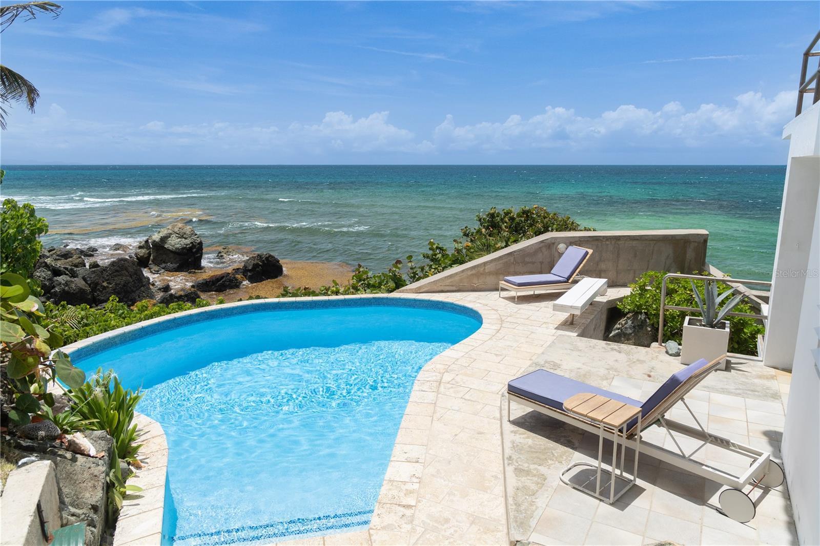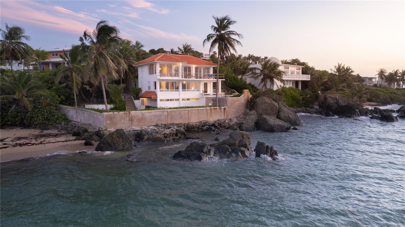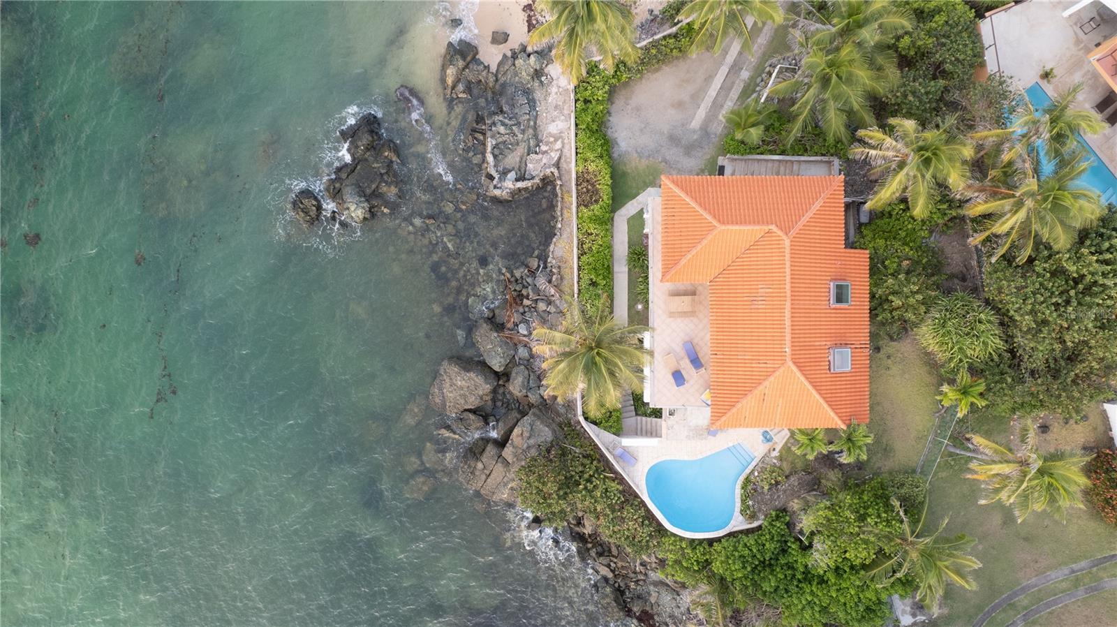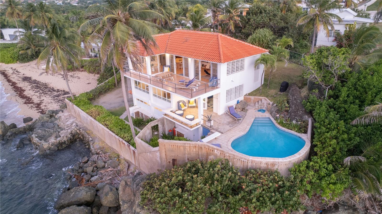 Las Piedras is a rare oceanfront property offering unmatched views and a remarkable connection to its surroundings. Set just above the clear waters of Vieques’ north shore, the home captures a full 180-degree view of the Caribbean—stretching from the coral-lined shallows below to the distant outlines of Culebra, St. Thomas, and St. John on the horizon. To the west, the mountains of mainland Puerto Rico rise against the sky, anchoring the landscape in every direction. A private driveway lined with mature palms and dense tropical foliage leads to the home’s entrance, which reveals a contemporary structure with subtle Spanish Colonial elements—most notably its terracotta-tiled, hipped roof. The three-story residence is solidly built and thoughtfully laid out, with four bedrooms, two and a half baths, and multiple indoor-outdoor living areas that make the most of the setting. The upper level is the heart of the home, with vaulted ceilings and an open-concept kitchen, dining, and living area. Floor-to-ceiling windows and doors frame uninterrupted views of the ocean from nearly every angle. The living space opens onto a wide ocean-facing balcony, ideal for sun lounging or outdoor dining. A half bath and an adjacent auxiliary room—currently outfitted with a bed—offer potential for a flexible use space or an additional bathroom conversion. Anchoring the structure is a central staircase built directly into the landscape, incorporating large natural boulders that not only define the aesthetic but also act as part of the home’s foundation. The second level houses the primary sleeping quarters, including two ocean-view bedrooms. The principal suite includes a modern ensuite bath with a polished cement shower and integrated sink. This level also features a smaller sitting room with a hidden Murphy bed, which opens onto a balcony overlooking the sea and connecting to the pool terrace. A spacious second full bath includes an oversized built-in tiled tub. The ground floor offers two additional cozy, well-proportioned bedrooms and a common area with a reading nook. There’s also a modern full bathroom with a polished cement shower and built-in sink, positioned next to a large laundry and storage room. Beneath the pool deck is a utility and pump room, discreetly tucked away from the main living areas. The bedrooms are fully air-conditioned for comfort, while the rest of the home is designed to take full advantage of natural ventilation, ocean breezes, and crosswinds. Las Piedras combines privacy and presence—set apart from the street, with direct access to the quiet sands of La Chata beach. Landscaped with native palms and low-maintenance gardens, the property includes a walking path that circles the house and offers seamless access to every corner of this uniquely situated coastal home. A gated entrance opens to a parking area that comfortably accommodates two vehicles. Whether as a personal retreat, an elegant space for entertaining, or an income-producing asset, Las Piedras delivers. It is currently operated as a highly successful luxury vacation rental, offering immediate investment potential with a proven rental history.