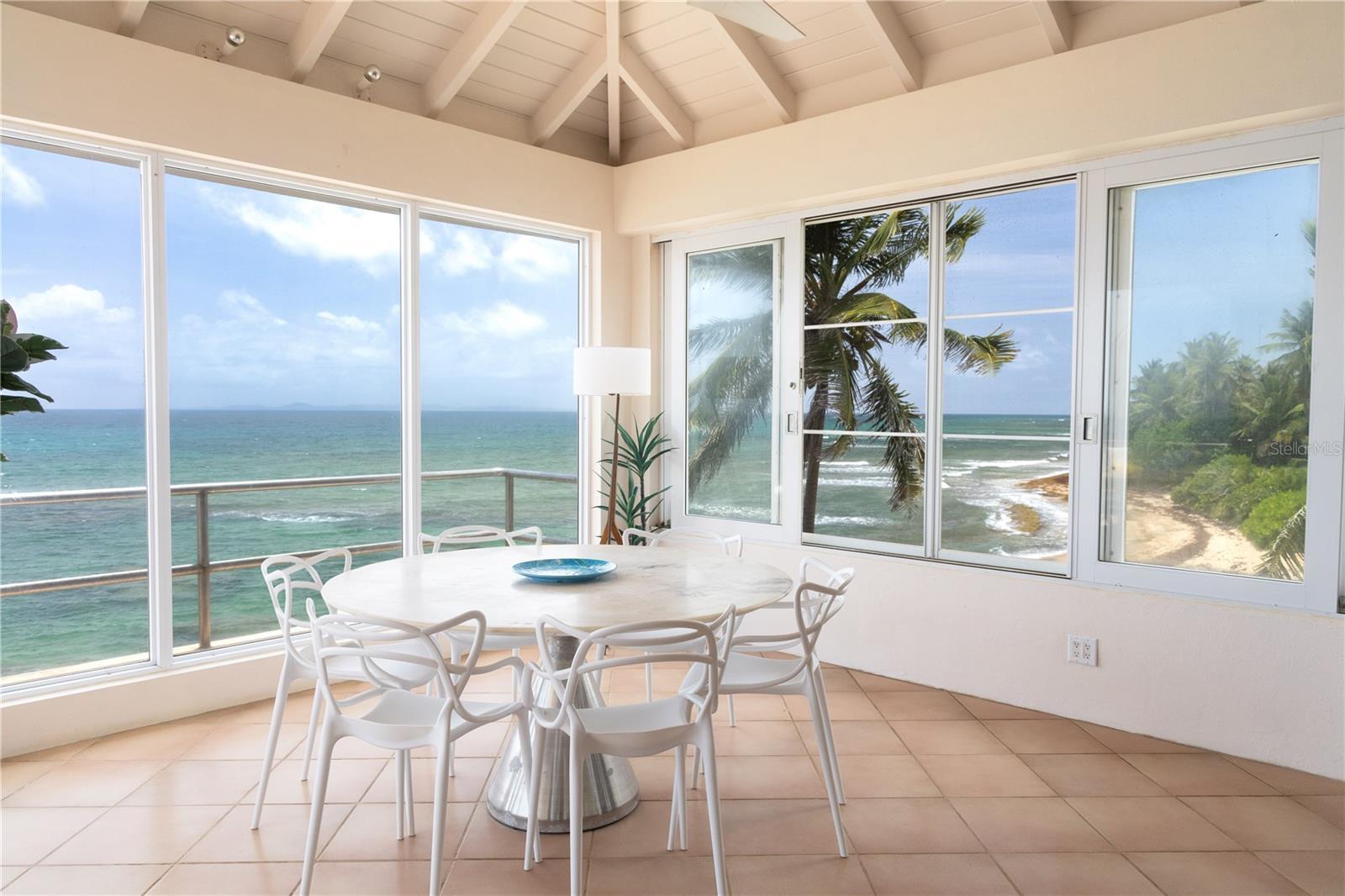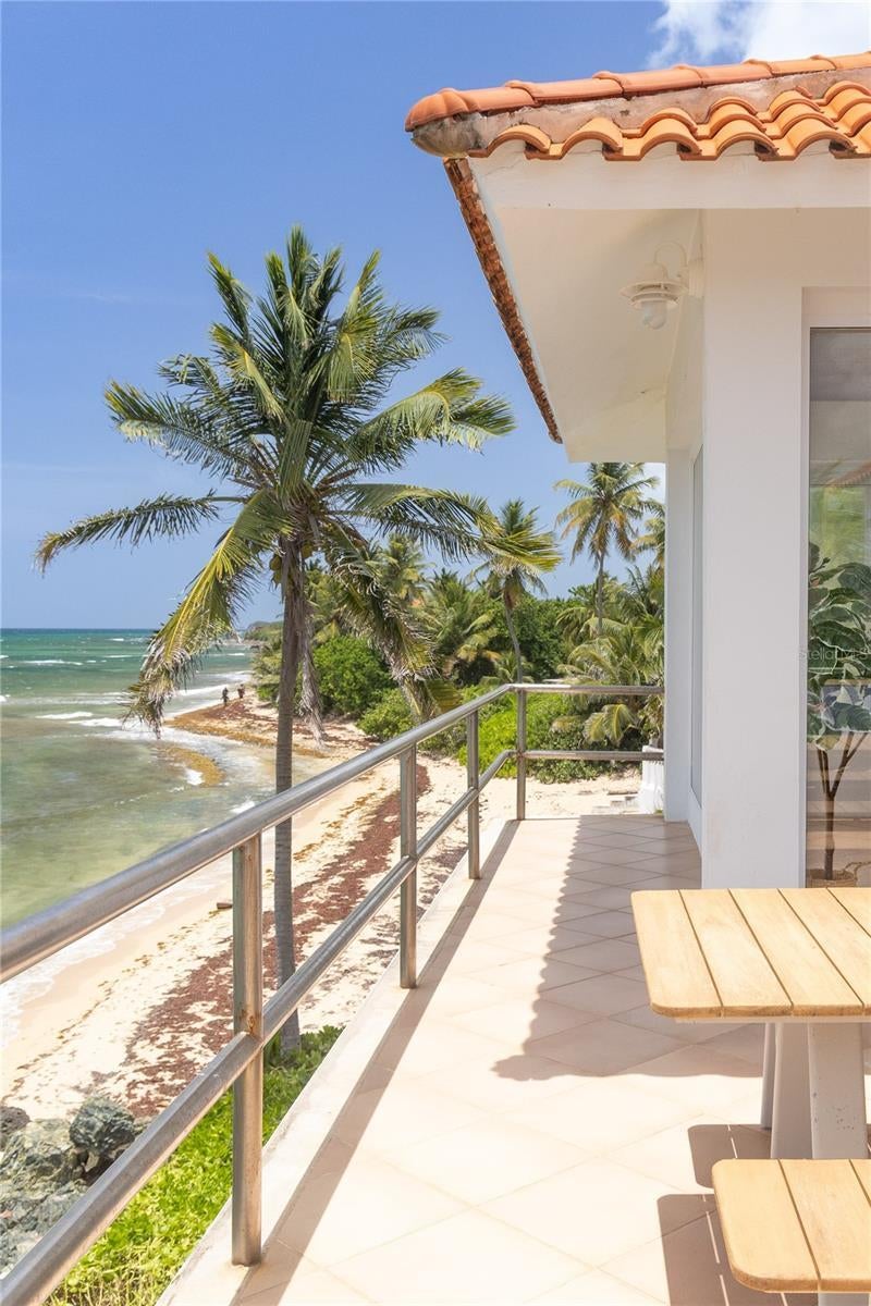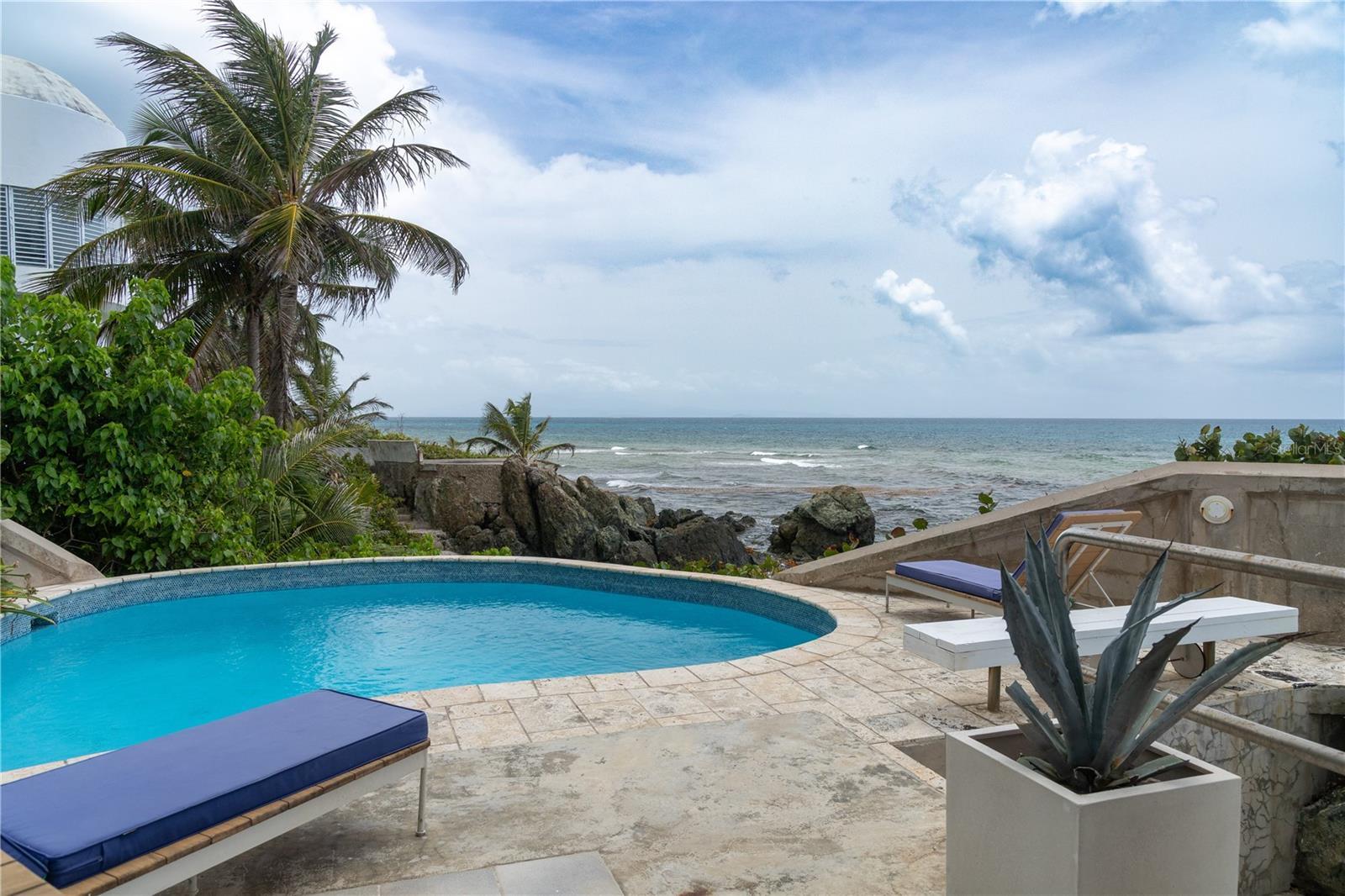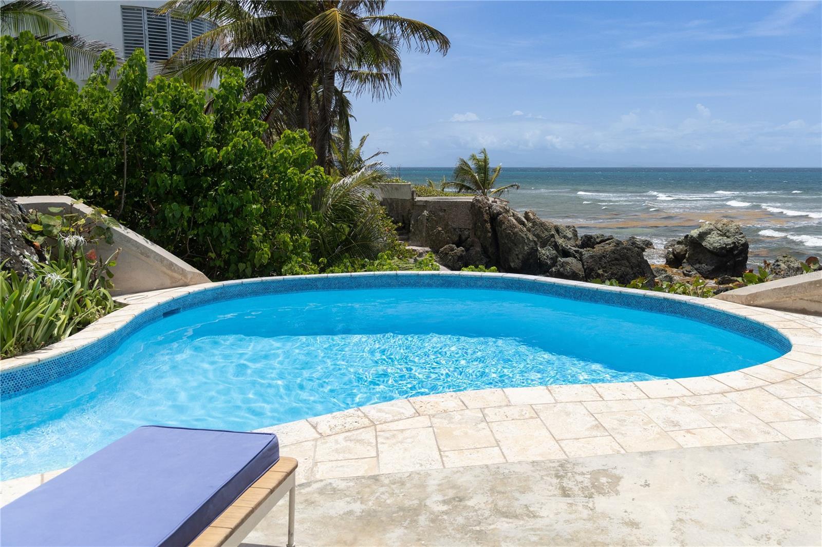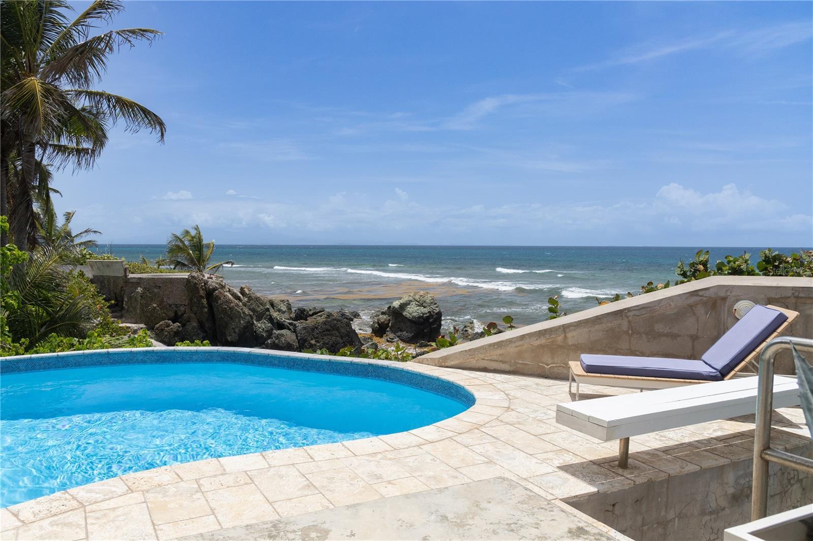 Las Piedras is a rare oceanfront property offering unmatched views and a remarkable connection to its surroundings. Set just above the clear waters of Vieques’ north shore, the home captures a full 180-degree view of the Caribbean—stretching from the coral-lined shallows below to the distant outlines of Culebra, St. Thomas, and St. John on the horizon. To the west, the mountains of mainland Puerto Rico rise against the sky, anchoring the landscape in every direction. A private driveway lined with mature palms and dense tropical foliage leads to the home’s entrance, which reveals a contemporary structure with subtle Spanish Colonial elements—most notably its terracotta-tiled, hipped roof. The three-story residence is solidly built and thoughtfully laid out, with four bedrooms, two and a half baths, and multiple indoor-outdoor living areas that make the most of the setting. The upper level is the heart of the home, with vaulted ceilings and an open-concept kitchen, dining, and living area. Floor-to-ceiling windows and doors frame uninterrupted views of the ocean from nearly every angle. The living space opens onto a wide ocean-facing balcony, ideal for sun lounging or outdoor dining. A half bath and an adjacent auxiliary room—currently outfitted with a bed—offer potential for a flexible use space or an additional bathroom conversion. Anchoring the structure is a central staircase built directly into the landscape, incorporating large natural boulders that not only define the aesthetic but also act as part of the home’s foundation. The second level houses the primary sleeping quarters, including two ocean-view bedrooms. The principal suite includes a modern ensuite bath with a polished cement shower and integrated sink. This level also features a smaller sitting room with a hidden Murphy bed, which opens onto a balcony overlooking the sea and connecting to the pool terrace. A spacious second full bath includes an oversized built-in tiled tub. The ground floor offers two additional cozy, well-proportioned bedrooms and a common area with a reading nook. There’s also a modern full bathroom with a polished cement shower and built-in sink, positioned next to a large laundry and storage room. Beneath the pool deck is a utility and pump room, discreetly tucked away from the main living areas. The bedrooms are fully air-conditioned for comfort, while the rest of the home is designed to take full advantage of natural ventilation, ocean breezes, and crosswinds. Las Piedras combines privacy and presence—set apart from the street, with direct access to the quiet sands of La Chata beach. Landscaped with native palms and low-maintenance gardens, the property includes a walking path that circles the house and offers seamless access to every corner of this uniquely situated coastal home. A gated entrance opens to a parking area that comfortably accommodates two vehicles. Whether as a personal retreat, an elegant space for entertaining, or an income-producing asset, Las Piedras delivers. It is currently operated as a highly successful luxury vacation rental, offering immediate investment potential with a proven rental history.