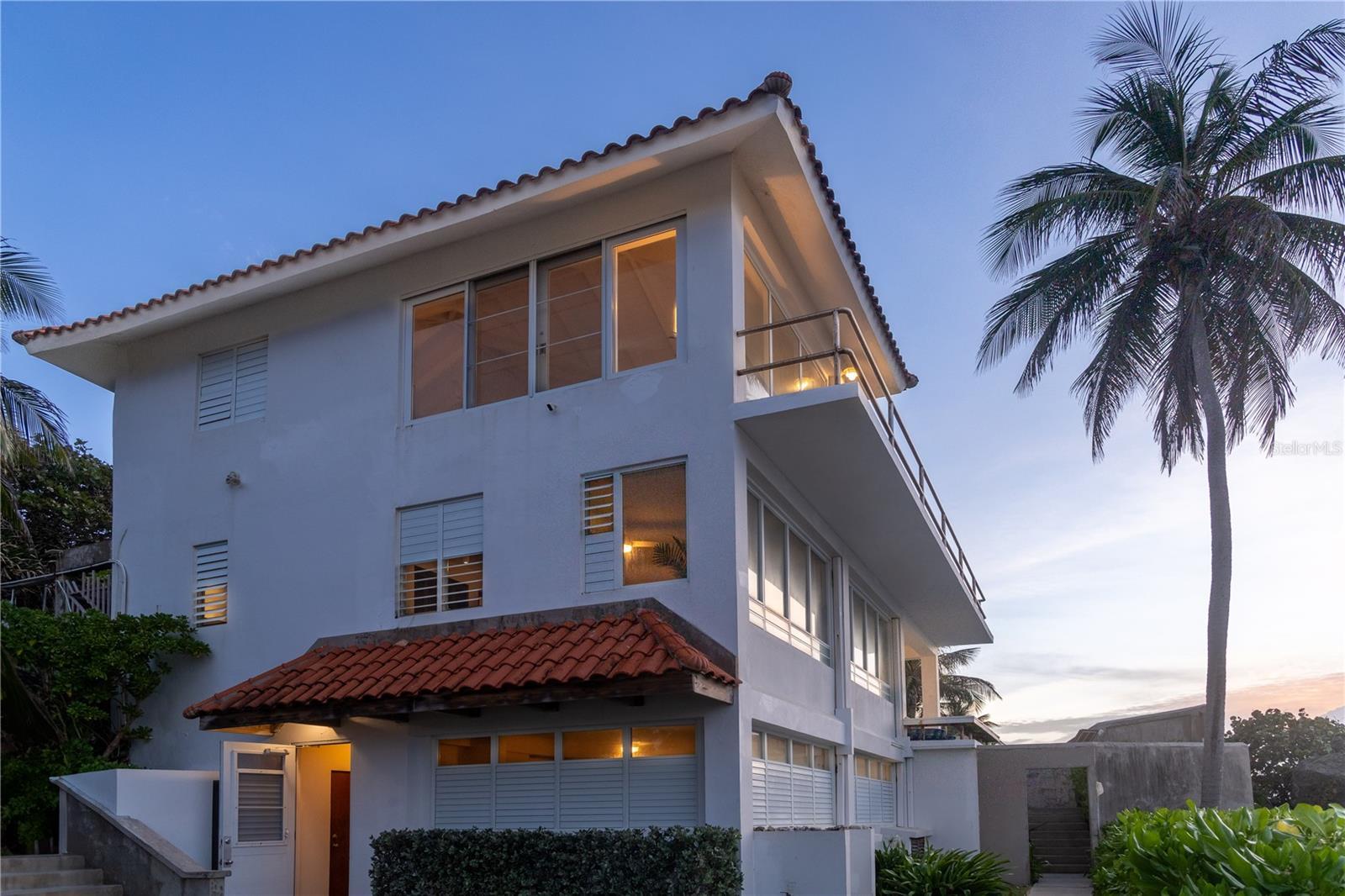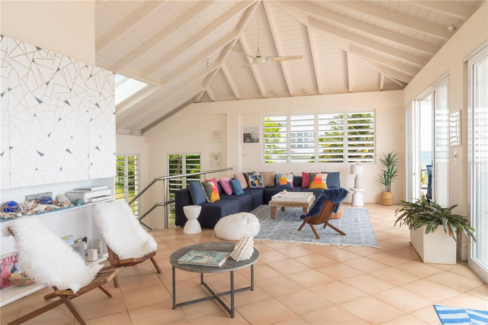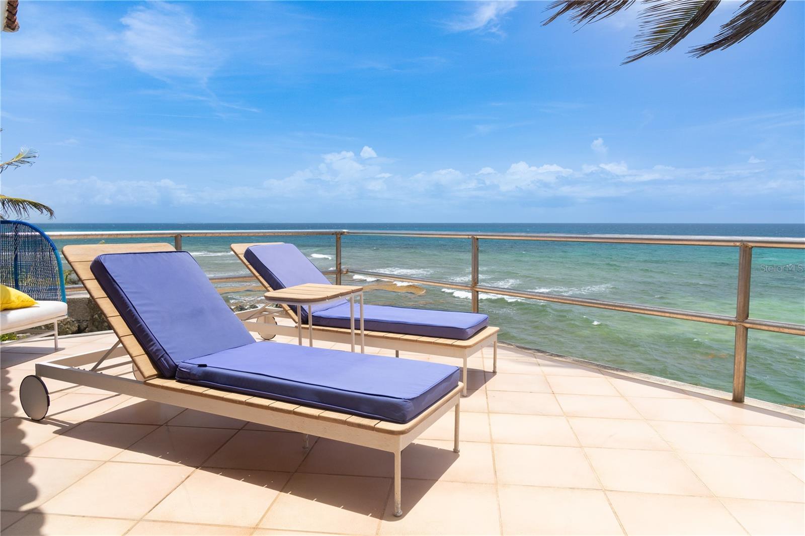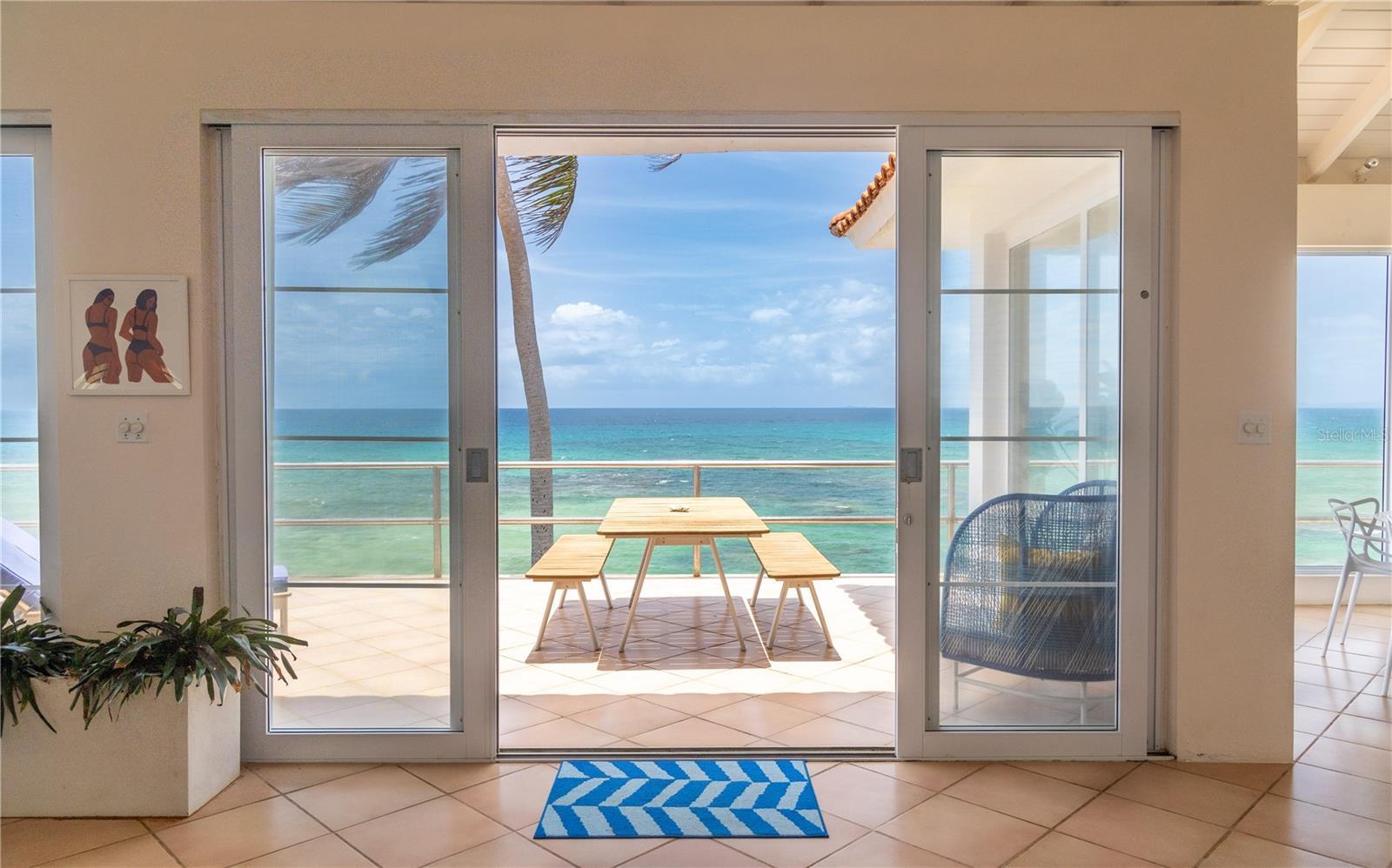 Las Piedras is a rare oceanfront property offering unmatched views and a remarkable connection to its surroundings. Set just above the clear waters of Vieques’ north shore, the home captures a full 180-degree view of the Caribbean—stretching from the coral-lined shallows below to the distant outlines of Culebra, St. Thomas, and St. John on the horizon. To the west, the mountains of mainland Puerto Rico rise against the sky, anchoring the landscape in every direction. A private driveway lined with mature palms and dense tropical foliage leads to the home’s entrance, which reveals a contemporary structure with subtle Spanish Colonial elements—most notably its terracotta-tiled, hipped roof. The three-story residence is solidly built and thoughtfully laid out, with four bedrooms, two and a half baths, and multiple indoor-outdoor living areas that make the most of the setting. The upper level is the heart of the home, with vaulted ceilings and an open-concept kitchen, dining, and living area. Floor-to-ceiling windows and doors frame uninterrupted views of the ocean from nearly every angle. The living space opens onto a wide ocean-facing balcony, ideal for sun lounging or outdoor dining. A half bath and an adjacent auxiliary room—currently outfitted with a bed—offer potential for a flexible use space or an additional bathroom conversion. Anchoring the structure is a central staircase built directly into the landscape, incorporating large natural boulders that not only define the aesthetic but also act as part of the home’s foundation. The second level houses the primary sleeping quarters, including two ocean-view bedrooms. The principal suite includes a modern ensuite bath with a polished cement shower and integrated sink. This level also features a smaller sitting room with a hidden Murphy bed, which opens onto a balcony overlooking the sea and connecting to the pool terrace. A spacious second full bath includes an oversized built-in tiled tub. The ground floor offers two additional cozy, well-proportioned bedrooms and a common area with a reading nook. There’s also a modern full bathroom with a polished cement shower and built-in sink, positioned next to a large laundry and storage room. Beneath the pool deck is a utility and pump room, discreetly tucked away from the main living areas. The bedrooms are fully air-conditioned for comfort, while the rest of the home is designed to take full advantage of natural ventilation, ocean breezes, and crosswinds. Las Piedras combines privacy and presence—set apart from the street, with direct access to the quiet sands of La Chata beach. Landscaped with native palms and low-maintenance gardens, the property includes a walking path that circles the house and offers seamless access to every corner of this uniquely situated coastal home. A gated entrance opens to a parking area that comfortably accommodates two vehicles. Whether as a personal retreat, an elegant space for entertaining, or an income-producing asset, Las Piedras delivers. It is currently operated as a highly successful luxury vacation rental, offering immediate investment potential with a proven rental history.