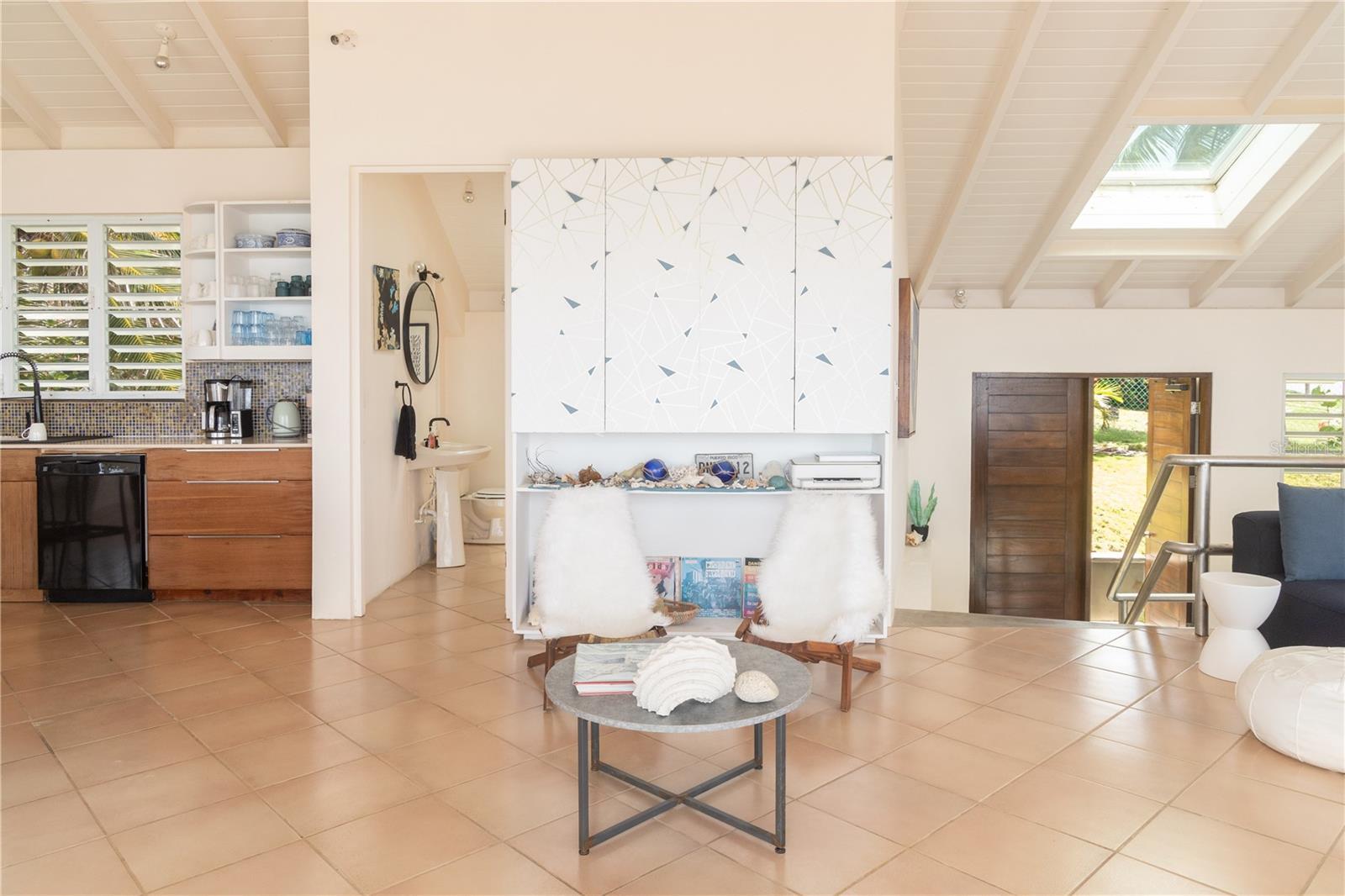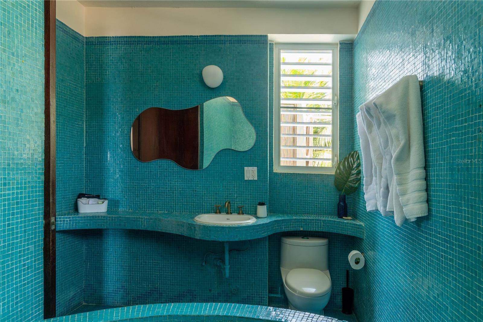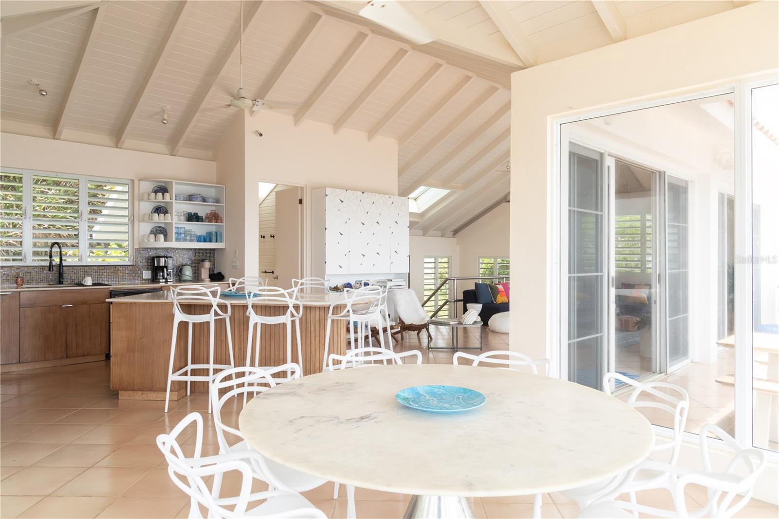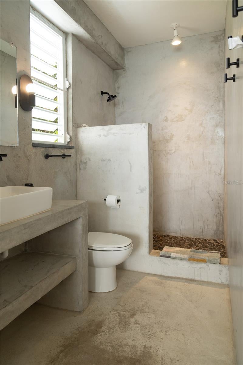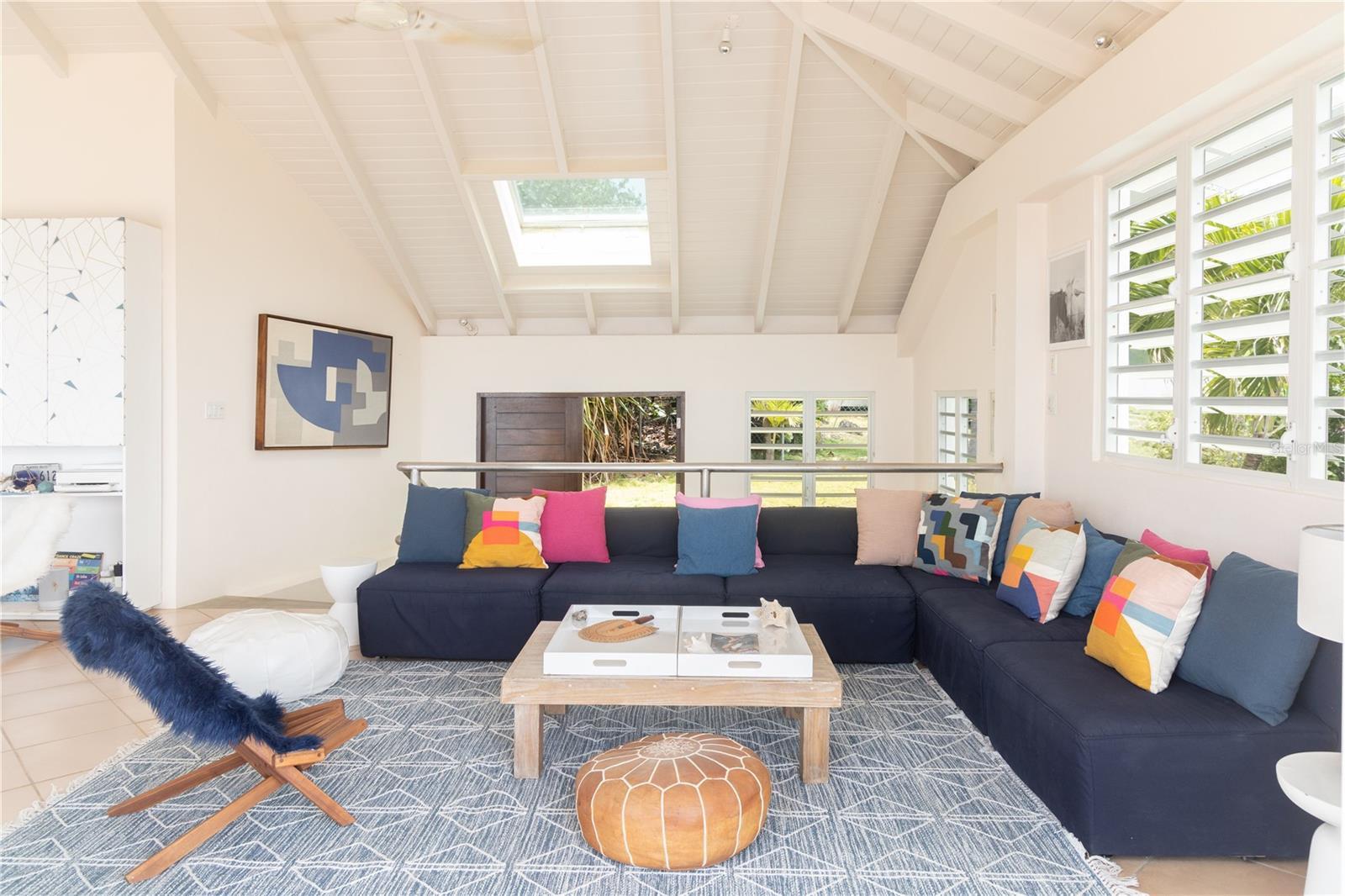 Las Piedras is a rare oceanfront property offering unmatched views and a remarkable connection to its surroundings. Set just above the clear waters of Vieques’ north shore, the home captures a full 180-degree view of the Caribbean—stretching from the coral-lined shallows below to the distant outlines of Culebra, St. Thomas, and St. John on the horizon. To the west, the mountains of mainland Puerto Rico rise against the sky, anchoring the landscape in every direction. A private driveway lined with mature palms and dense tropical foliage leads to the home’s entrance, which reveals a contemporary structure with subtle Spanish Colonial elements—most notably its terracotta-tiled, hipped roof. The three-story residence is solidly built and thoughtfully laid out, with four bedrooms, two and a half baths, and multiple indoor-outdoor living areas that make the most of the setting. The upper level is the heart of the home, with vaulted ceilings and an open-concept kitchen, dining, and living area. Floor-to-ceiling windows and doors frame uninterrupted views of the ocean from nearly every angle. The living space opens onto a wide ocean-facing balcony, ideal for sun lounging or outdoor dining. A half bath and an adjacent auxiliary room—currently outfitted with a bed—offer potential for a flexible use space or an additional bathroom conversion. Anchoring the structure is a central staircase built directly into the landscape, incorporating large natural boulders that not only define the aesthetic but also act as part of the home’s foundation. The second level houses the primary sleeping quarters, including two ocean-view bedrooms. The principal suite includes a modern ensuite bath with a polished cement shower and integrated sink. This level also features a smaller sitting room with a hidden Murphy bed, which opens onto a balcony overlooking the sea and connecting to the pool terrace. A spacious second full bath includes an oversized built-in tiled tub. The ground floor offers two additional cozy, well-proportioned bedrooms and a common area with a reading nook. There’s also a modern full bathroom with a polished cement shower and built-in sink, positioned next to a large laundry and storage room. Beneath the pool deck is a utility and pump room, discreetly tucked away from the main living areas. The bedrooms are fully air-conditioned for comfort, while the rest of the home is designed to take full advantage of natural ventilation, ocean breezes, and crosswinds. Las Piedras combines privacy and presence—set apart from the street, with direct access to the quiet sands of La Chata beach. Landscaped with native palms and low-maintenance gardens, the property includes a walking path that circles the house and offers seamless access to every corner of this uniquely situated coastal home. A gated entrance opens to a parking area that comfortably accommodates two vehicles. Whether as a personal retreat, an elegant space for entertaining, or an income-producing asset, Las Piedras delivers. It is currently operated as a highly successful luxury vacation rental, offering immediate investment potential with a proven rental history.