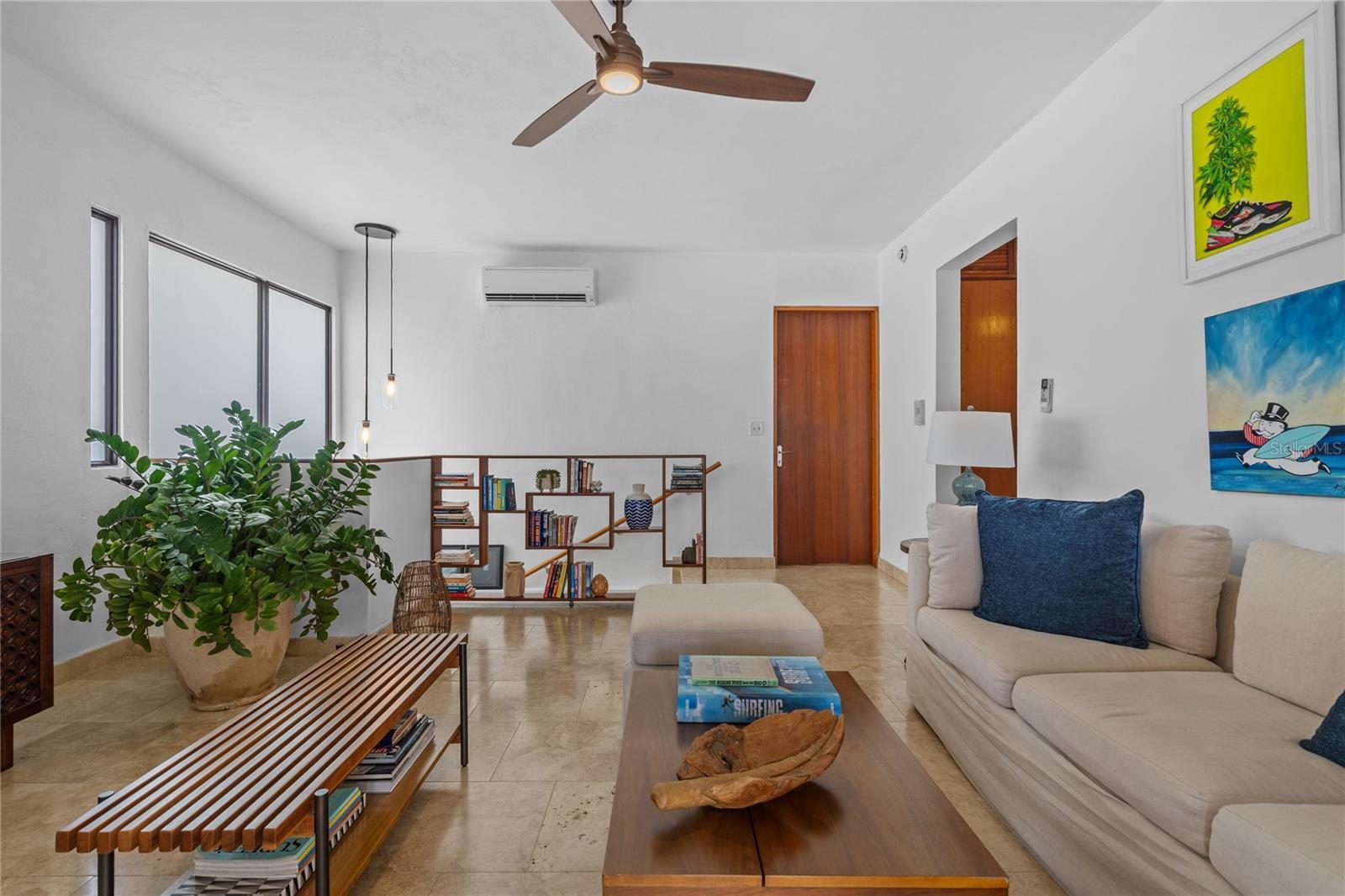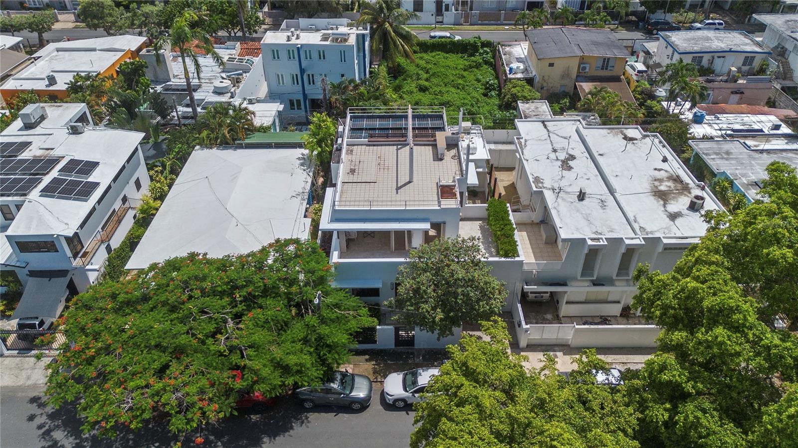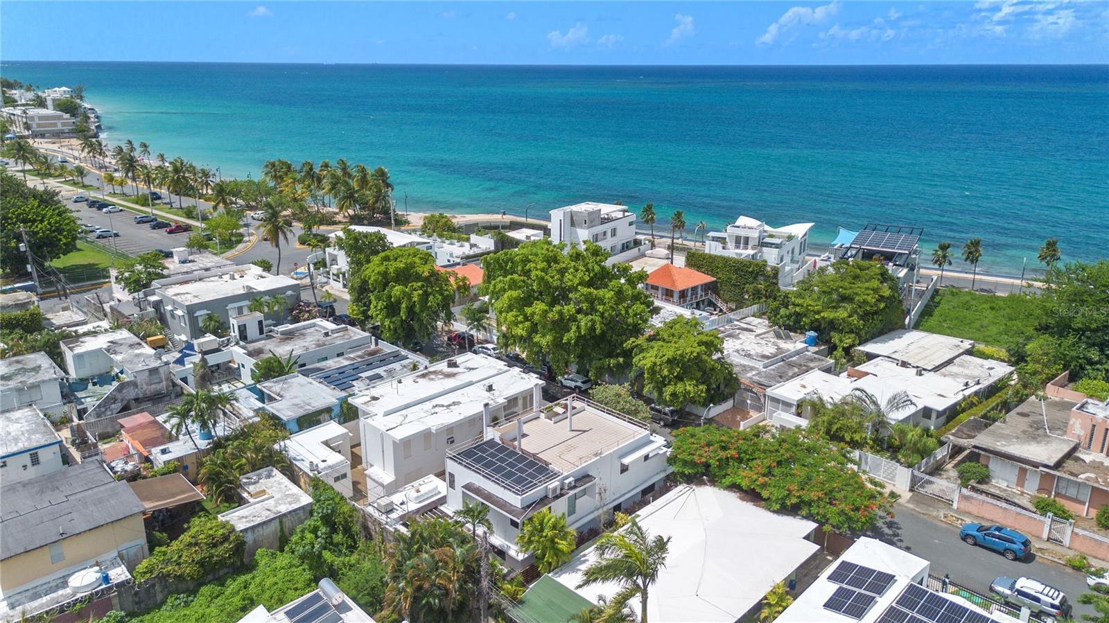 A Zen paradise in the gated beach community of Santa Teresita, San Juan. Perched in a coveted location with sweeping views of Ocean Park Beach and El Yunque, this 4-bedroom, 4-bathroom residence on Calle General Patton is an extremely rare find that seamlessly combines modern design and sustainability. From its soaring 12-foot ceilings and hurricane-proof windows, to its state-of-the-art solar panel system, every detail has been thoughtfully curated to provide sleek beauty and peace of mind. Its abundance of natural light feels open and inviting. The kitchen is designed for both function and sophistication, featuring rich wood cabinetry, stainless-steel appliances including a dishwasher, a Monogram wine fridge, and the capability to install a gas-powered stove. The primary suite includes a spacious en-suite bathroom, while the additional bedrooms offer flexibility for guests, family, or to create an office space. Ample storage throughout the home enhances its practicality. For added security and efficiency, the home is equipped with a gas generator, a Sol-Ark solar panel system, and three Revolt band batteries to store energy, ensuring ultimate comfort. The outdoor living space is truly an entertainer’s dream, highlighted by a marble-top patio with a built-in grill, kitchen sink and full outdoor bathroom. Yet more entertaining space, or potential living space, is available upstairs. The rooftop offers incredible potential to build an additional level and expand the panoramic views of the ocean and El Yunque mountains. The property is equipped with a sub pump for added protection, yet it remains safely outside of a flood zone on a non-flooding street. This home presents a rare chance to live or invest in a property that blends luxury finishes, sustainable energy solutions, and unmatched potential in a prime beach location. The property is being sold with professional remodeling plans, giving buyers the opportunity to further customize and elevate the space to their vision. Mere steps from the beach and the newly renovated Barbosa Park, featuring full track, soccer fields, work out stations, basketball, tennis, and pickleball courts, this location is perfect for fitness and water sports enthusiasts. Near the trendiest bars and restaurants on Calle Loiza, this location truly offers something for everyone. Do not miss this opportunity, call for more information.