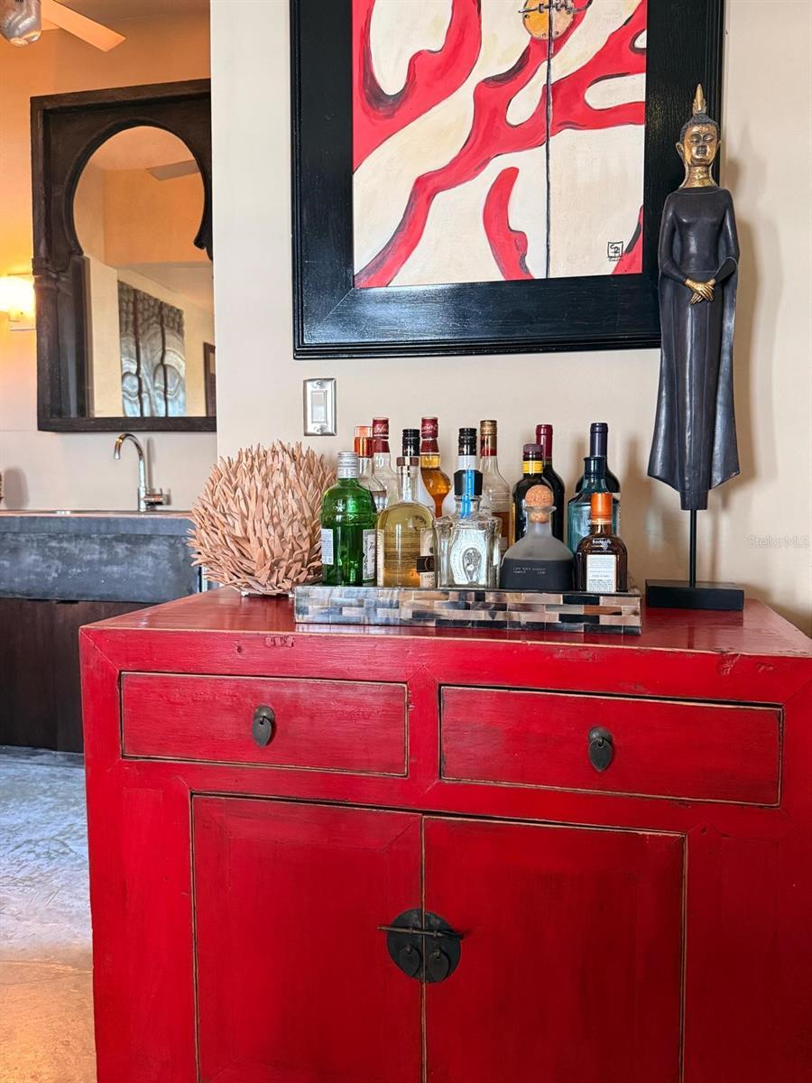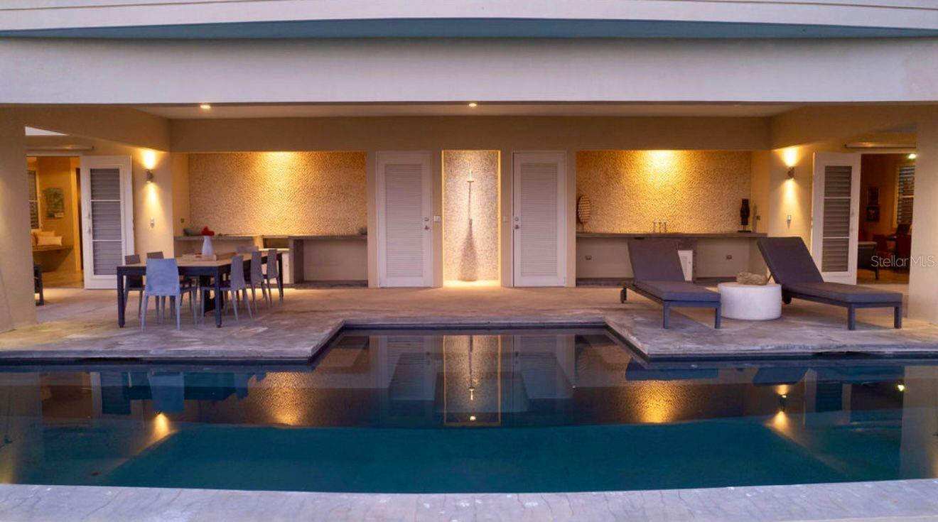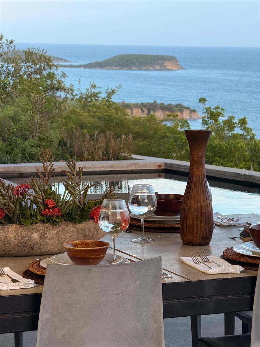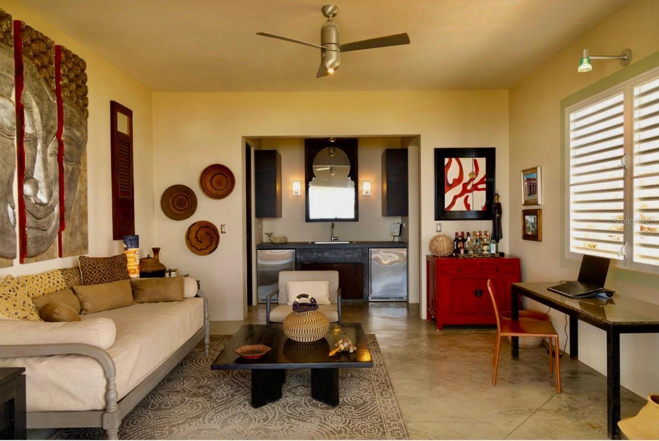 Quinta Jabalí presents a rare opportunity to own an exceptional architectural gem in one of Vieques’ most sought-after locations. Brilliantly designed by renowned architect Stanley Hutchinson, this exceptional estate seamlessly blends modern elegance with natural beauty. Perched high on a hillside, the home is masterfully positioned to capture sweeping 180-degree views of the Caribbean Sea. The elevated design creates an eagle’s nest effect, offering breathtaking vistas from nearly every angle, while the structure itself is thoughtfully integrated into the terrain — allowing the lush gardens and panoramic views to exist in perfect harmony. This fusion of architecture and landscape makes living here an unforgettable experience. Set on over two acres of beautifully landscaped grounds, the property is a botanical paradise cultivated over decades by its current owners — both expert landscapers. From the moment you pass through the gated entrance, you're transported into an extraordinary world rarely found elsewhere. The gently curving driveway winds through majestic elephant-sized boulders, rare tropical plants, stately palms, and fruit-bearing trees. The residence currently serves as a private two bedroom home but was intentionally constructed with the infrastructure to be effortlessly expanded into a four-bedroom layout. The smart floor plan wraps around a serene pool and open-concept outdoor kitchen (grill-ready), ideal for relaxed island living. A detached garage was also designed to be easily converted into an open loft for guests or a studio space. An expansive grand terrace with a gazebo offers the perfect setting for sunset soirées that transition into starlit gatherings—ideal for entertaining in true Caribbean style. Located in the exclusive enclave of La Hueca, surrounded by other distinguished estates and adjacent to the Vieques Wildlife Refuge, Quinta Jabalí offers not only privacy and prestige but also proximity to nature’s most stunning landscapes. The property’s carriage-style porte-cochère and timeless design evoke the elegance of a St. Barts estate. Sustainability and self-sufficiency are key features of this estate, which includes a spacious laundry / storage room, 30 solar panels, tesla powerwalls, two 14,000 gallon cisterns, and eco-conscious infrastructure. This is not just a home—it’s a legacy property that captures the essence of a luxury island lifestyle.