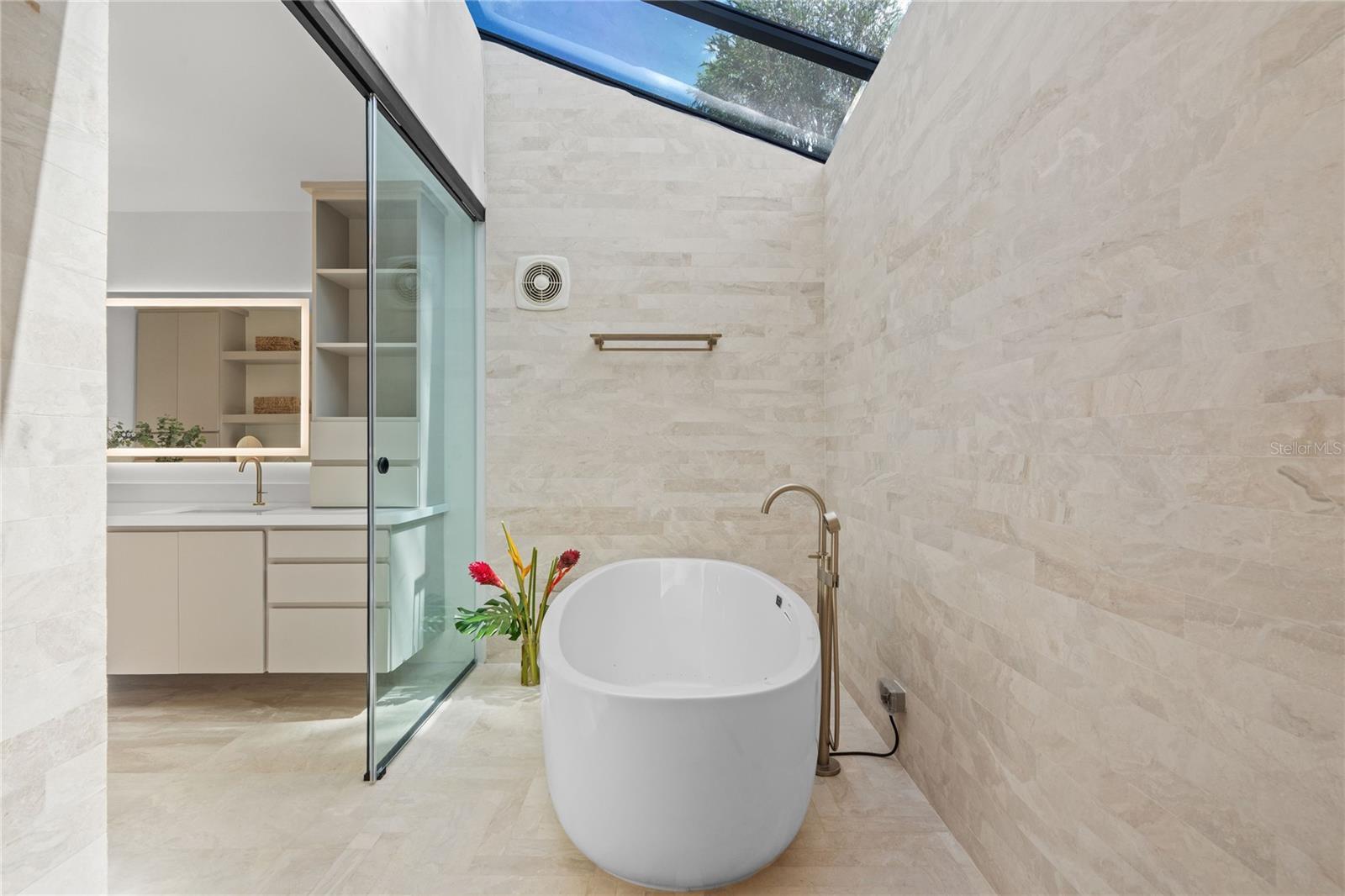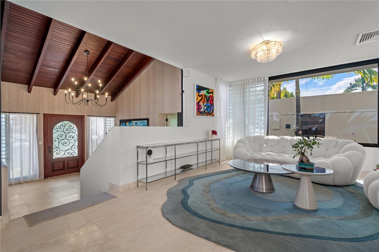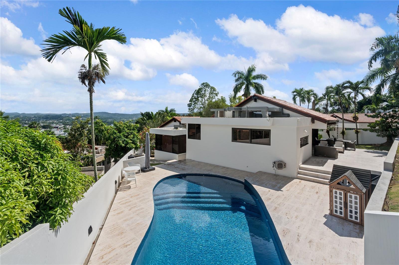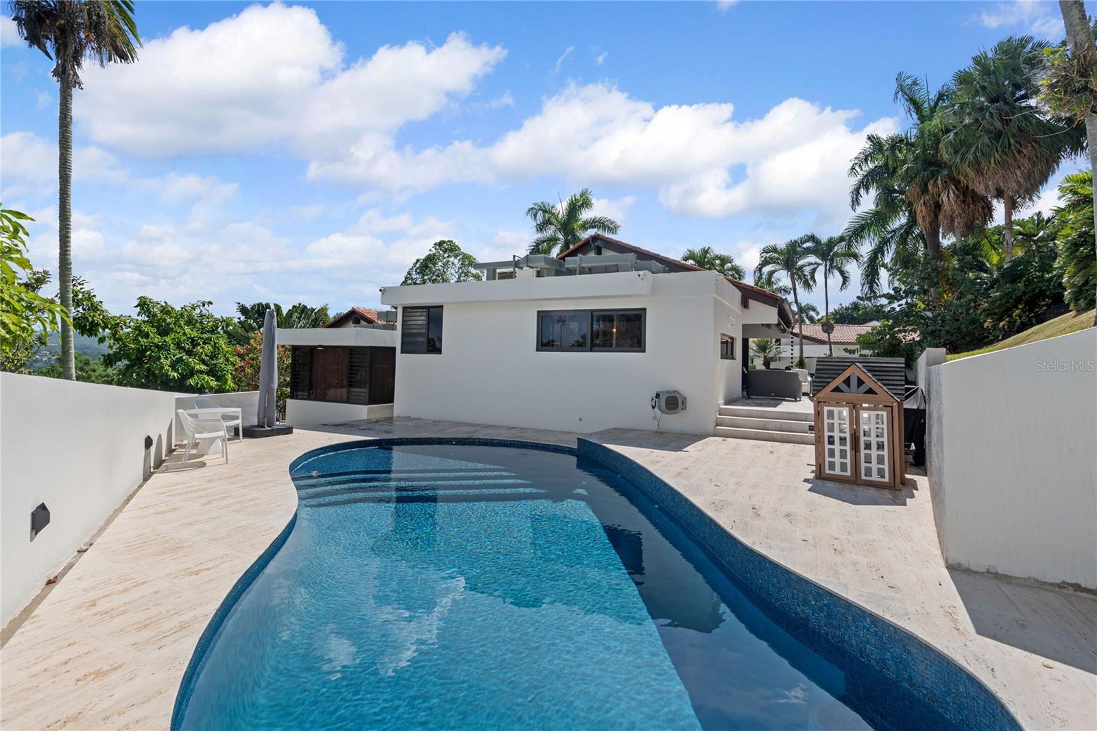 A HOME OF LIGHT AND AIR. Transformed through a comprehensive year-long renovation, this modern residence in La Colina offers a level of design, light, and livability rarely found in Guaynabo. With ~3,100 sq ft of refined interiors on a 1,285 m² lot, the 4-bedroom, 5-bath home combines the warmth of natural materials with a distinctly modern sensibility–vaulted wood ceilings, marble floors, and clean architectural lines that create harmony and calm throughout. The home’s split-level plan flows naturally from a dramatic foyer into open living and dining areas, and then upward to the kitchen and family room—an airy, social heart that opens fully to the terrace through stackable glass doors. The custom Italian kitchen, designed for both beauty and function, anchors the space with sleek cabinetry, porcelain slab countertops, and premium appliances. At its core, the house is defined by light, air, and nature. It feels weightless, filled with sky. Expansive panes of glass and oversized windows bring the outdoors into every room, while skylights and a glass-roofed primary bath ensure daylight reaches even the quietest corners. The central interior garden, visible from every space–including the foyer, living areas, and primary suite–serves as a tranquil focal point, softening the modern architecture with layers of foliage, color, and light. Perched high on a gentle hill, the home captures steady cross-breezes that flow freely through open spaces, offering a choice between natural ventilation and full air-conditioned comfort. Despite its openness, the elevation and site orientation ensure complete privacy: no neighboring views, only sky and green. Outdoors, landscaped terraces and travertine-style surfaces surround a redesigned saltwater pool that continues the seamless dialogue between indoors and out. Every system–from roof and wiring to generator, cistern, and A/C–was renewed as part of a complete modernization of the home, ensuring turn-key ease for the next owner. Set within one of Guaynabo’s most exclusive guard-gated communities, this enclave of only 60 homes offers 24/7 staffed security and an uncommon sense of calm and privacy. Community amenities include a tennis court, clubhouse, and children's playground. Perfectly positioned just off PR-20 (PR-177 exit), it enjoys instant access to top schools, restaurants, and shopping—without the congestion of newer inland developments.