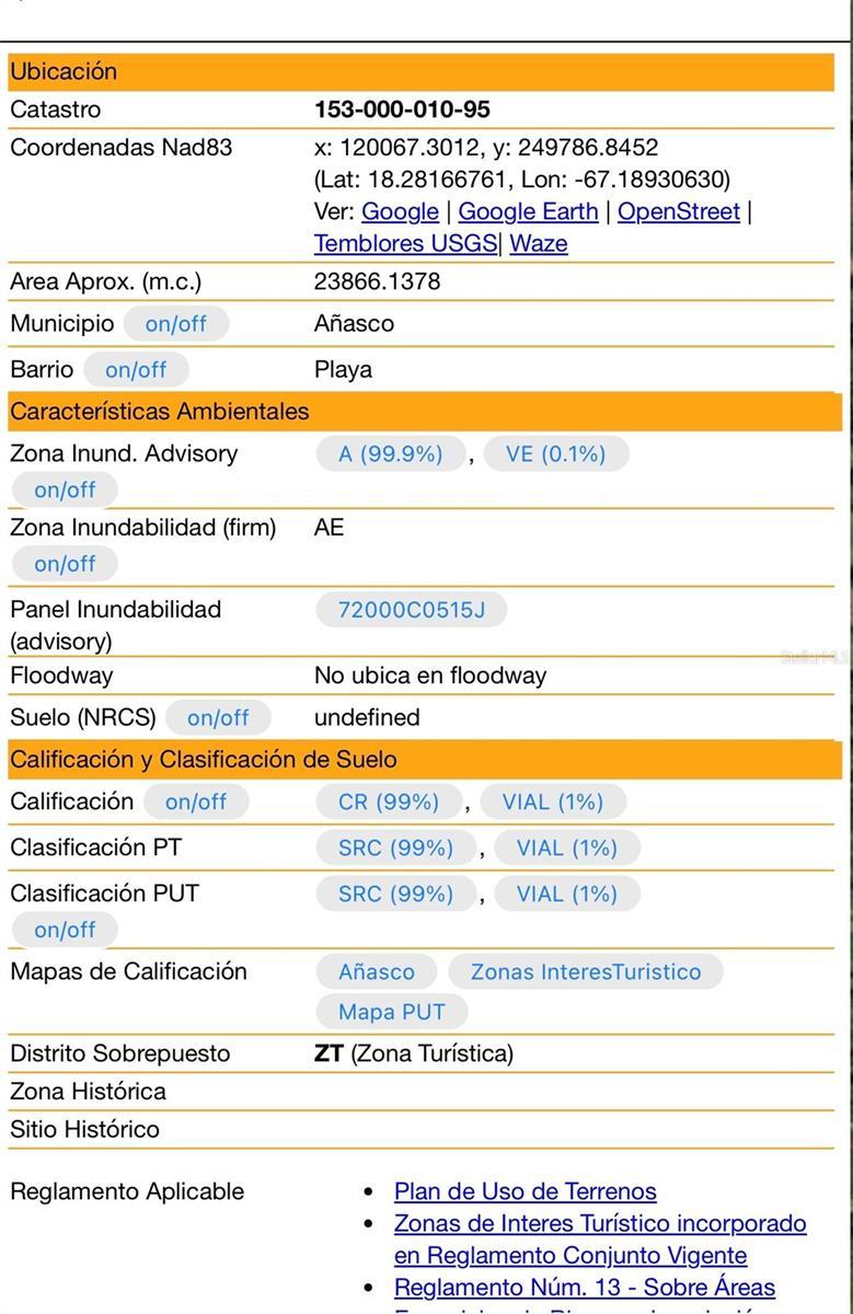 Outstanding beach front property, located in pristine area of west coast, topography is completely usPlenty of sand from property fence to ocean water. Zoning calification is CR: "conservación de recursos" conservation of resources; clasification is SRC: "suelo rustico comun" common rustic land with a overlay distric of ZT "zona turística" touristic zone. Taxes $287.50/year Coordinates: 18.2818, -67.1886