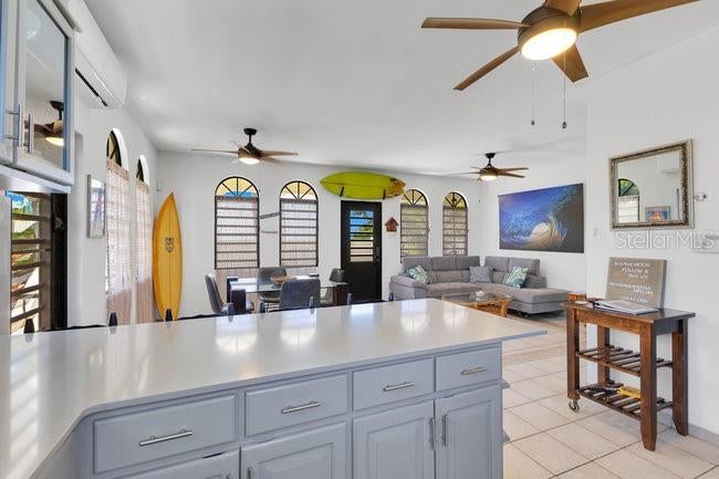 - Ceiling Fans(s), Eat-in Kitchen, Kitchen/Family Room Combo, Solid Surface Counters