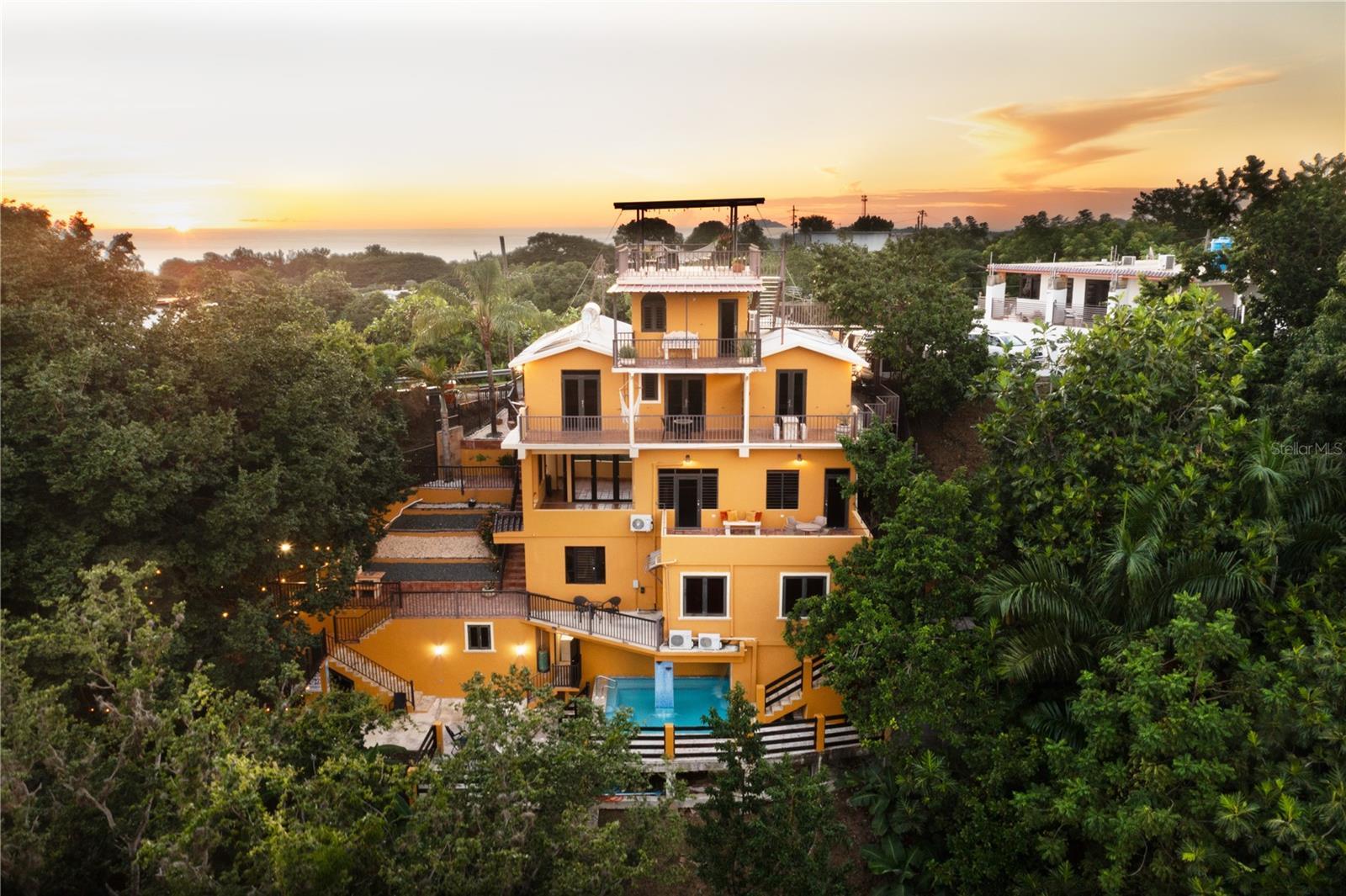 The Terraces at Rincón is a distinctive multi-level hillside property of 8,371 SF designed for strong income performance. It features five private suites across six levels and offers unobstructed 360° views of the Caribbean Sea, the Atlantic Ocean, and Mount Atalaya. Configured to support multi-family use, retreat hosting, and both short- and long-term rental operations, the estate includes five kitchenettes, five full baths, two half baths, two outdoor showers, a laundry area, and parking for five vehicles. Income-driven amenities elevate the guest experience, including a rooftop viewing deck, a jetted spa-style pool with soothing waterfall features, an air-conditioned fitness studio, lush tropical gardens, and multiple outdoor areas for dining, lounging, and quiet reflection. The design thoughtfully blends tropical, Zen-inspired elements with warm Mediterranean and Spanish Colonial touches. Terracotta-style flooring, handcrafted tile accents, stucco textures, rustic wood details, and ironwork railings appear throughout, while expansive windows, open-air corridors, and numerous terraces maximize natural light, ocean breezes, and seamless indoor–outdoor living. The property exudes the charm and serenity of a boutique hillside retreat. Multiple terraces, treetop decks, shaded seating areas, and covered patios create inviting spaces to pause, relax, and savor the signature panoramic vistas. Its elevated setting ensures privacy, tranquility, and uninterrupted ocean-to-mountain views—an experience that resonates with guests seeking both adventure and rejuvenation. Ideally located just minutes from Rincón’s best beaches—including world-famous surf breaks on the Atlantic and tranquil snorkeling coves along the Caribbean—the property also offers quick access to restaurants, the town plaza, grocery stores, and local culture. The combination of prime location, resort-style amenities, and versatile multi-suite configuration positions The Terraces at Rincón as not only a highly desirable investment opportunity but also a place where guests can create lasting memories in one of Puerto Rico’s most coveted coastal markets.