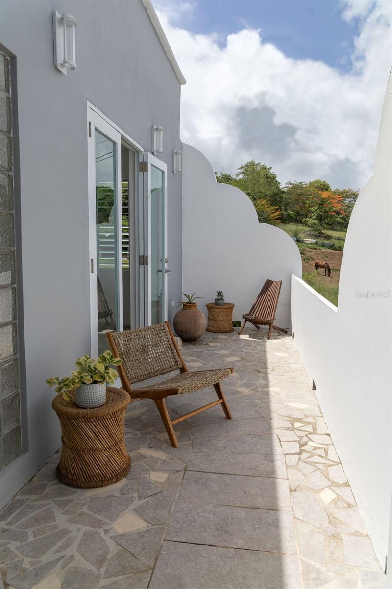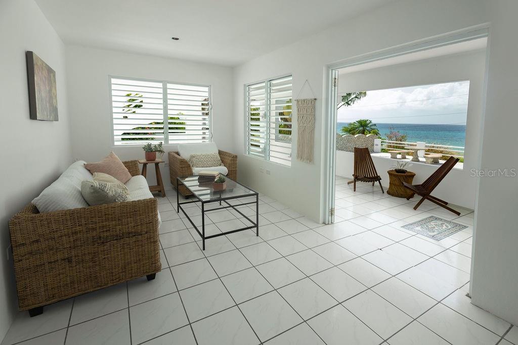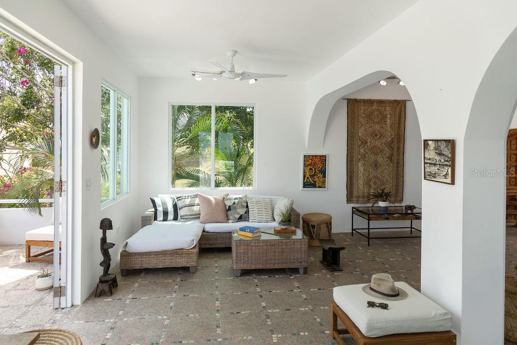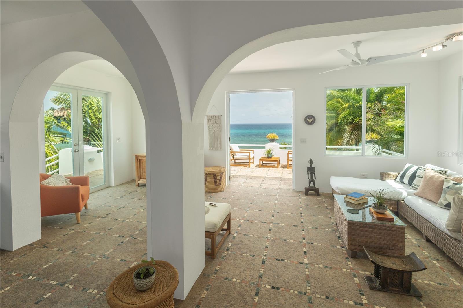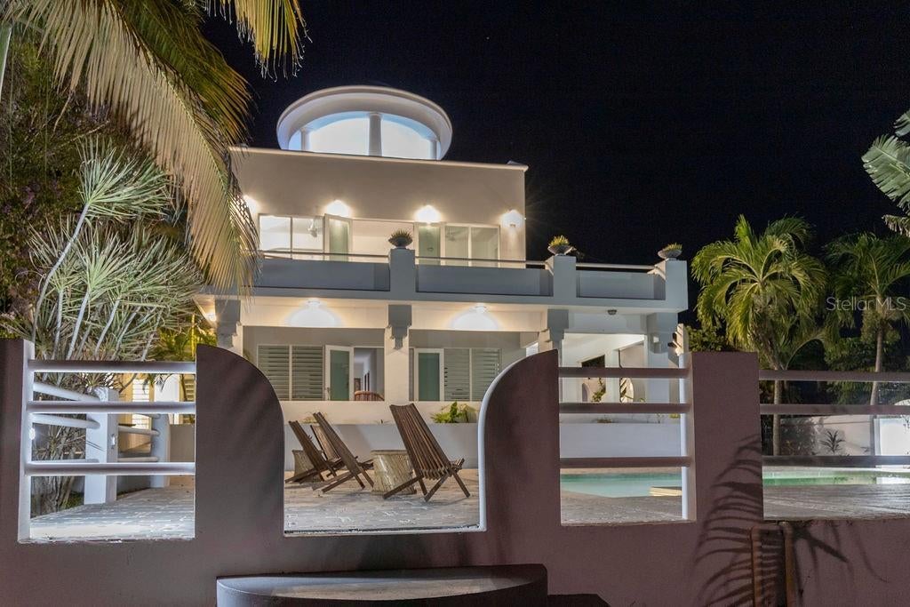 Villa La Riposa is beachfront living at its best. This amazing oceanfront property sits on a large lot that extends between two streets in the exclusive Bravos de Boston neighborhood. The property is bounded by the north shore beaches and less than a 15 min walk to all of the commodities in Isabel II (the ferry, restaurants, shops, and markets), and just 15 minutes from the airport. It’s promontory location gives the property a sense of seclusion and allows for unobstructed 180 ocean views. The art deco style villa elegantly mixes Mediterranean and Caribbean architecture. It’s distinct blue dome has become iconic of the North Shore skyline. The most spectacular space is the upper level apartment which has a unique European vibe with its stone mosaic floors, cathedral-esque arches, and grecian style louvered cabinets. The back drop from the main living space and the large outdoor lounge are the magnificent pool and turquoise ocean. Some of the spaces best features are the exterior bathroom and the amazing rooftop duomo with views of the mainland, Palomino and Culebra. Its doric columns frame the spectacular sunrises and sunsets during the morning and evening hours and the ferries can be seen as they come and go during the days. The lower level apartments each are fully equipped and have their own outdoor spaces and separate entrances. Guests can enjoy a private dinner or evening in but come together for gatherings in the large garden terrace that surrounds the pool and fountain. All the spaces are interconnected and have access to the ocean with a natural tide pool via a stairway built into the rocky cliffside. Every room has it’s own AC unit. The villa also has a parking area for up to three cars and additional private street parking, outdoor storage, and an outdoor shower by the pool area. The villa can be a great home, vacation escape, or an income producing rental.
