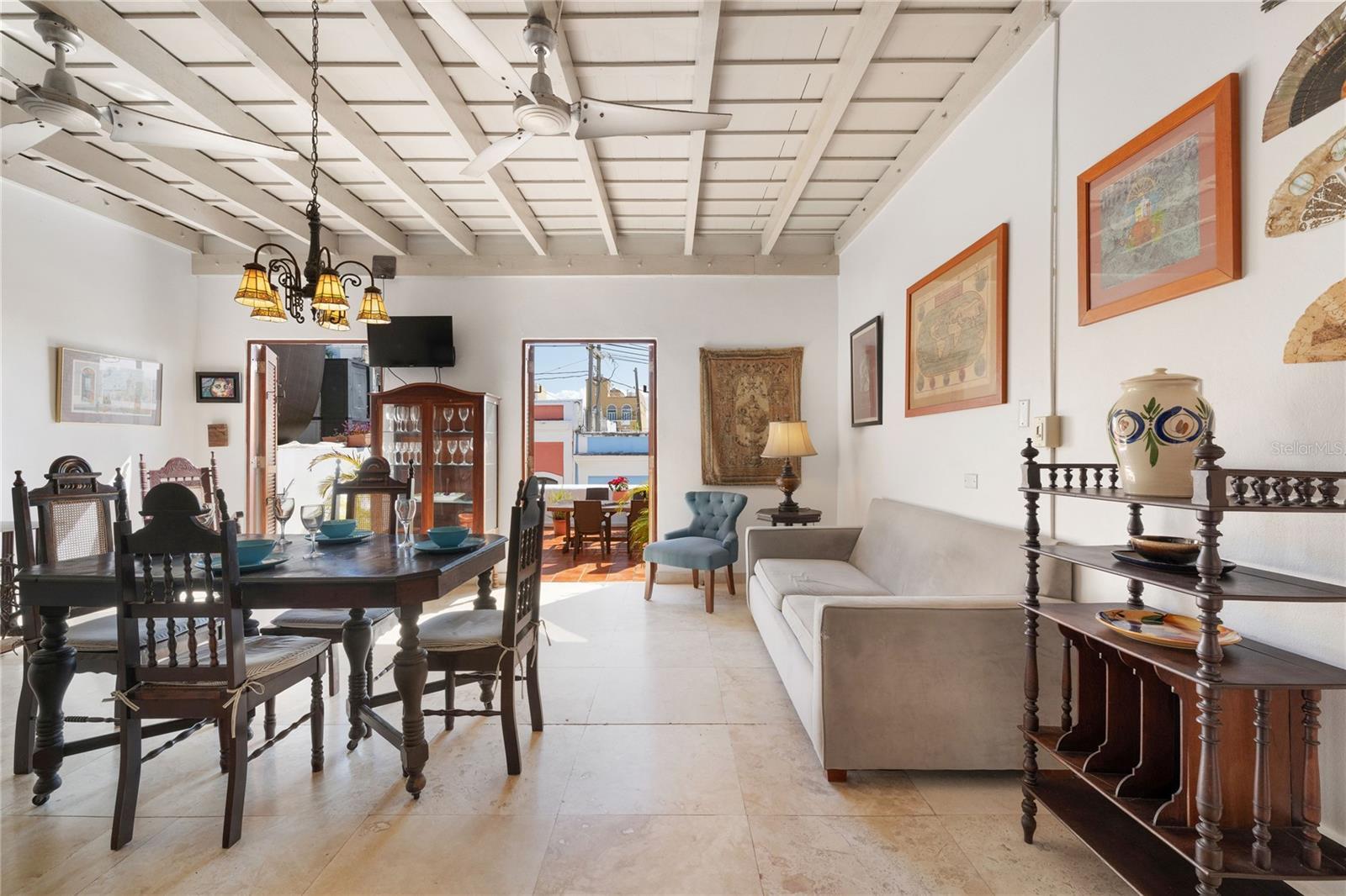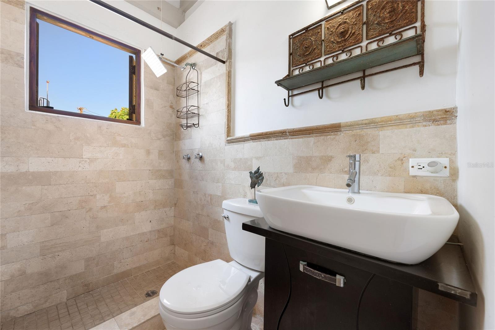 Welcome to 271 Calle de la Luna, one is greeted by a passion-fruit–toned façade set dramatically against the Caribbean sky, its presence both bold and timeless. A terracotta staircase ascends with quiet ceremony from the historic cobblestone street, guiding you to an elegant landing curated with a gallery wall that evokes centuries of cultural legacy. Beyond, Luna Condominiums reveals itself an exclusive enclave of just 24 residences, masterfully conceived through the unification of four historic structures. This is Old San Juan at its most refined, where heritage architecture, vibrant color, and enduring craftsmanship converge in a setting of rare distinction. Perched atop the building, Residence 3F is a top-floor penthouse offering 2 bedrooms and 1 bath, with approximately 719 square feet of interior living space and an extraordinary 600-square-foot private roof deck. Elevated above Calle de la Luna, the home feels both secluded and expansive an airy retreat set along one of the oldest streets in the Americas. Inside, the living space unfolds with a quiet sense of refinement, grounded by cool marble floors and animated by natural light pouring in throughout the day. The high ceilings draw you effortlessly toward the home’s crown jewel: a sprawling terracotta roof deck. Here, city views and ocean breezes mingle freely. An outdoor shower invites refreshing pauses, while ample space allows for lounging, entertaining, or simply watching the moon rise over the storied rooftops of the old city. It is a setting designed for slow mornings, calm evenings, and the romance of Caribbean living. The kitchen lines the wall with understated elegance, anchored by a window opening that welcomes cross-breezes and daylight. Finished with solid wood cabinetry, granite countertops, and modern stainless-steel appliances, the space strikes a thoughtful balance between contemporary convenience and historic character functional, unfussy, and perfectly attuned to island life. The primary bedroom is intimate and poetic, defined by a wood-framed arched window that feels lifted from another century a true main-character moment. The second bedroom, nearly equal in size, offers generous proportions and additional closet space, ideal for guests, a creative studio, or a tranquil home office.The marble bathroom is softly illuminated by a window that looks into the interior courtyard, offering glimpses of neighbors’ landscaped terraces and colorful façades, a reminder of the layered life within these historic walls. Adding to the home’s charm, all vintage furnishings are included in the sale, allowing the residence to be enjoyed exactly as it was curated. Living in Old San Juan is not just about location it is also about emotion a daily immersion into Puerto Rico's history. Spanish architecture, cobblestone streets, and salt-tinged ocean air create a sense of timelessness that cannot be replicated. From your doorstep, stroll to El Morro, celebrated restaurants, galleries, waterfront promenades, nearby beach areas, and the gentle spectacle of cruise ships gliding into the bay. Condado is just 15 minutes away, the airport 30 minutes, yet the spirit of Old San Juan feels entirely its own found nowhere else in Puerto Rico. Residence 3F is more than a home; it is a vantage point over history, vibrant color, and Caribbean light an invitation to live Old San Juan fully and poetically.