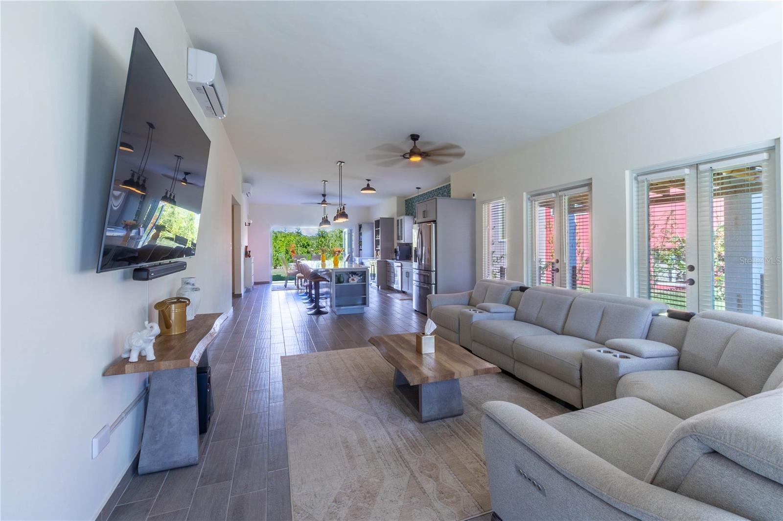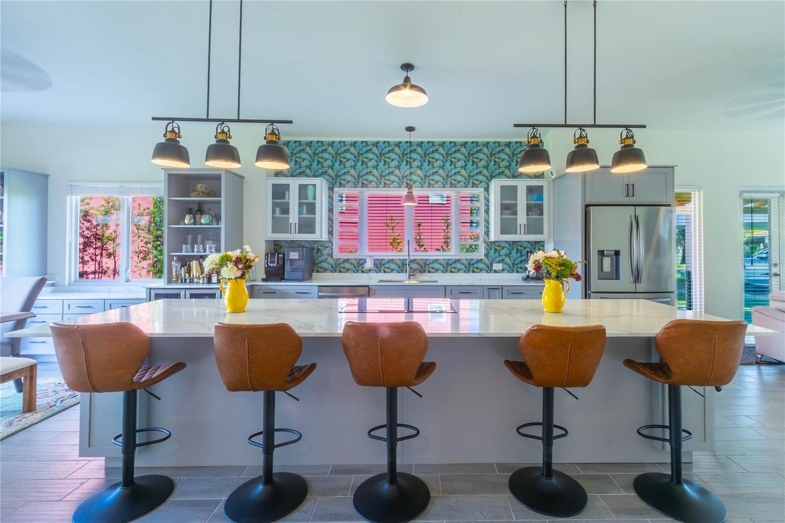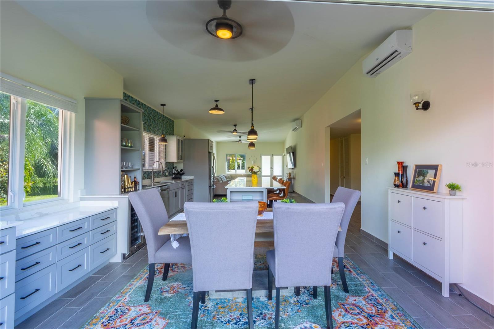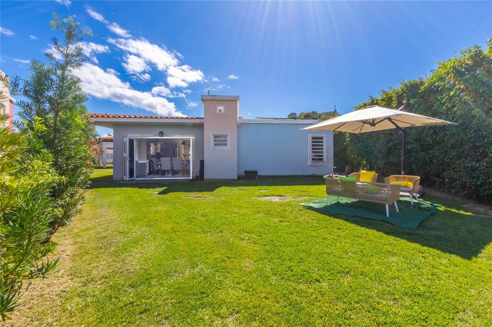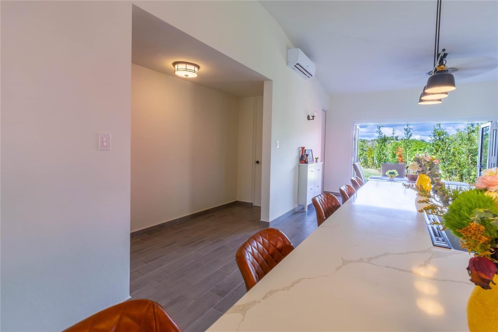 Experience elevated single-level living in Sunrise, Palmas del Mar. Welcome to House E16 on Twilight Street, a beautifully remodeled one-story single-family home set on an approx. 825 square meter lot with approximately 2,000 square feet of interior living space, offering breathtaking mountain and El Yunque views. This open-concept residence has been fully renovated from top to bottom, blending modern design with high-end finishes. The heart of the home is the custom chef’s kitchen, featuring stainless steel appliances, quartz countertops, custom cabinetry, and an impressive 12-foot island—ideal for entertaining and everyday living. Accordion doors fully open the back wall, creating seamless indoor-outdoor living while framing stunning views of El Yunque. Recent upgrades extend well beyond furnishings and include new flooring throughout, freshly painted interior and exterior, three fully remodeled bathrooms, and three new air conditioning units. Energy efficiency and peace of mind are enhanced with a full solar array consisting of 27 panels and one Tesla Powerwall, along with a roof that has been professionally re-sealed following solar installation. Additional highlights include remote-operated, customizable ceiling fans and lighting, a new washer and dryer, custom built-ins in the primary bedroom closet, a wine and beverage refrigerator, new wooden roof awnings, new hedging for added privacy, and a fully enclosed dog pen. Located within the desirable Sunrise community of Palmas del Mar, residents enjoy 24-hour security, a community pool, and gazebo, along with access to world-class amenities including golf courses, marinas, beaches, dining, and more. This move-in-ready home offers an exceptional combination of style, comfort, energy efficiency, and scenic views, making it a rare opportunity in one of Puerto Rico’s most sought-after resort communities.