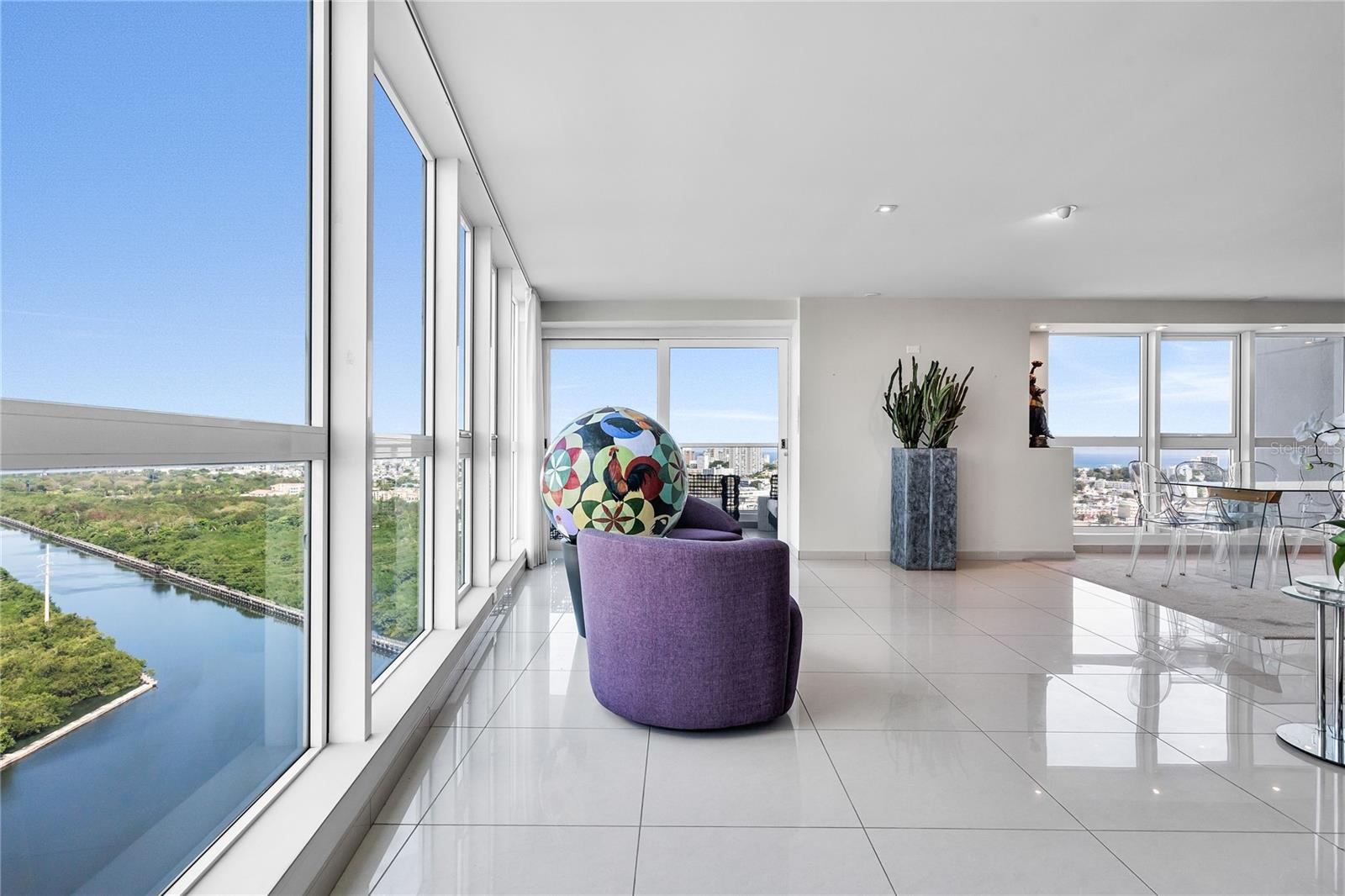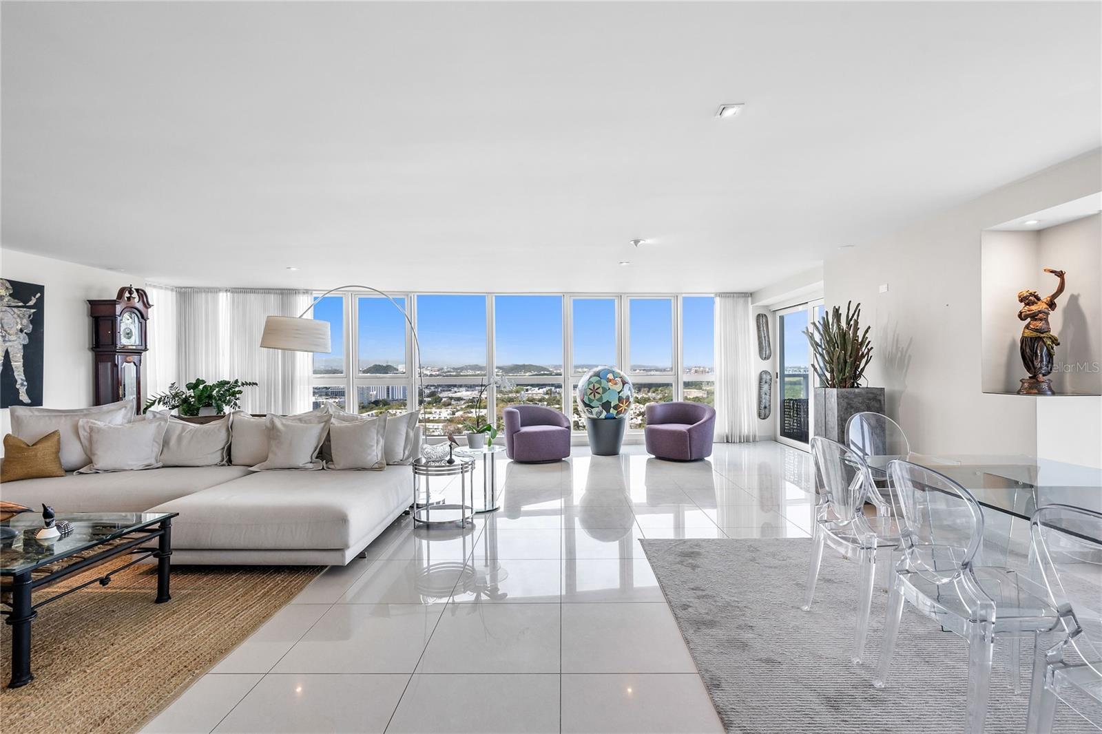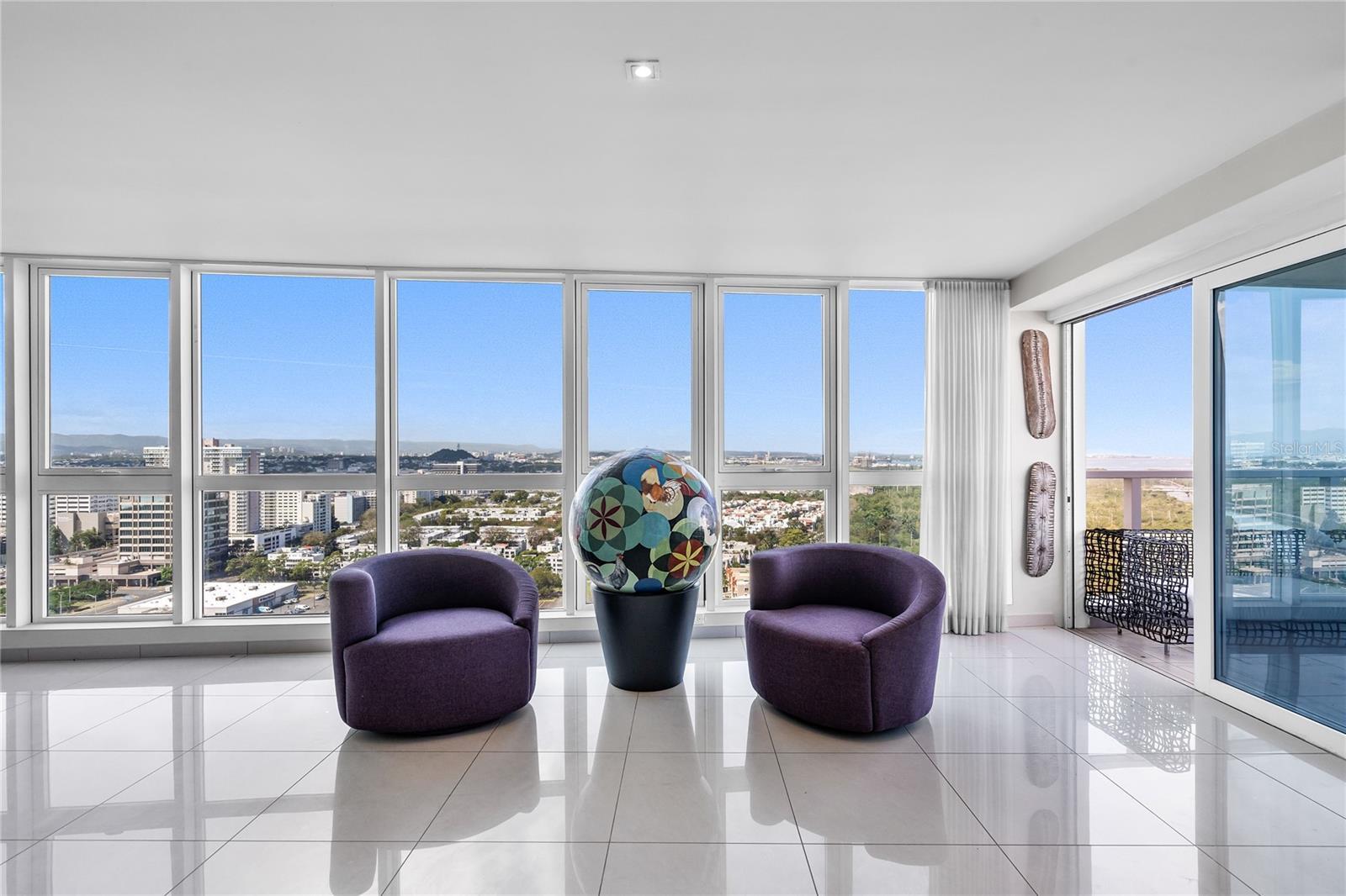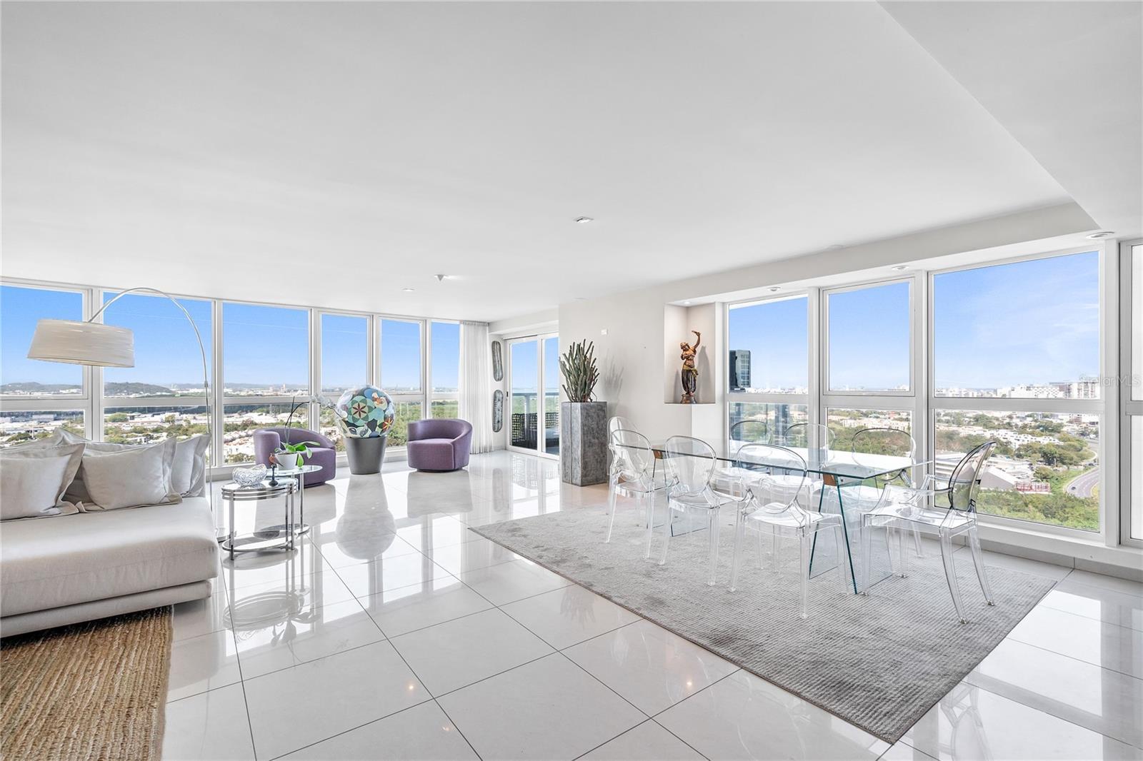 Perched on one of the highest floors of the prestigious Aquablue Condominium, this exceptional residence offers sweeping panoramic views of the San Juan skyline, San Juan Bay, and the Atlantic Ocean. Spanning 1,812 sq ft, this elegant home features two spacious bedrooms, two and a half bathrooms, and a bright, open living area bathed in natural light from expansive floor-to-ceiling windows. The well-appointed kitchen provides ample space for culinary pursuits, while the master suite offers a serene retreat with an en-suite bathroom and generous closet space. A second bedroom, also thoughtfully designed, ensures comfort and privacy for guests. Situated next to the iconic Coliseum of Puerto Rico, Aquablue offers an array of luxurious amenities, including 24/7 security, a state-of-the-art fitness center, an inviting swimming pool, a residents’ lounge, and private parking. Ideally located in the heart of San Juan's vibrant financial district, this residence places world-class dining, shopping, and entertainment at your doorstep, embodying the pinnacle of urban living.