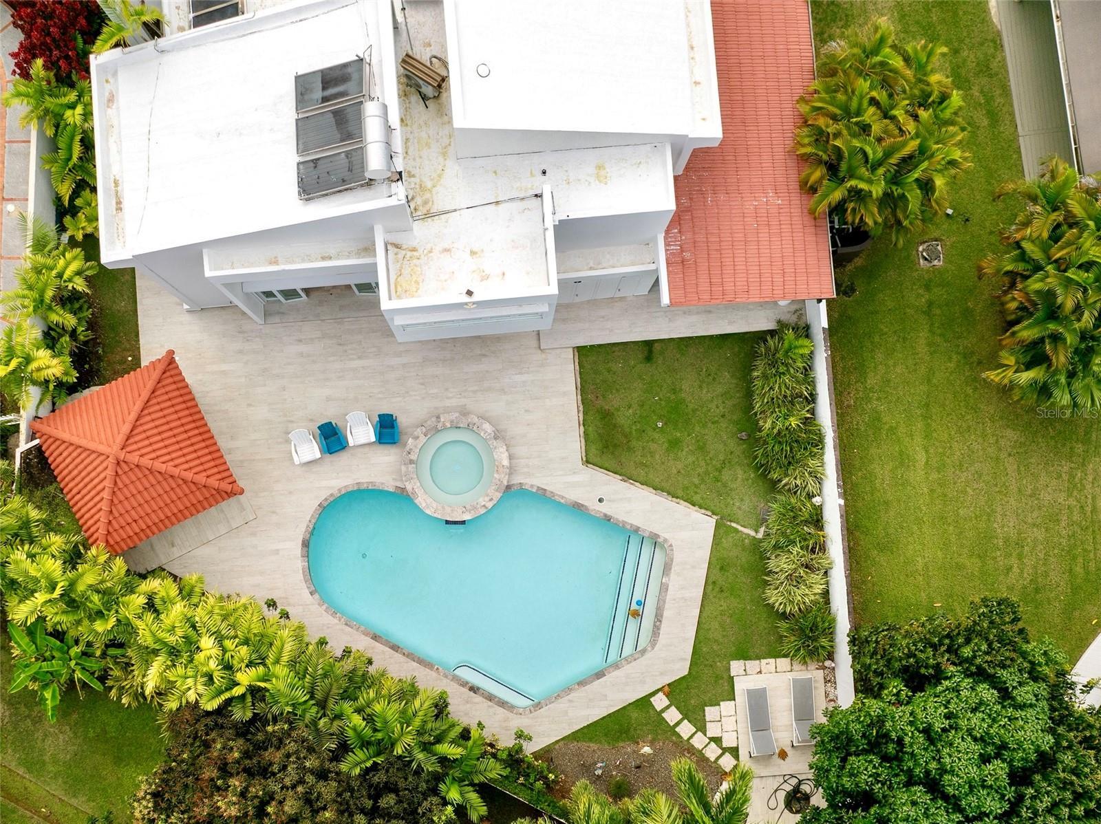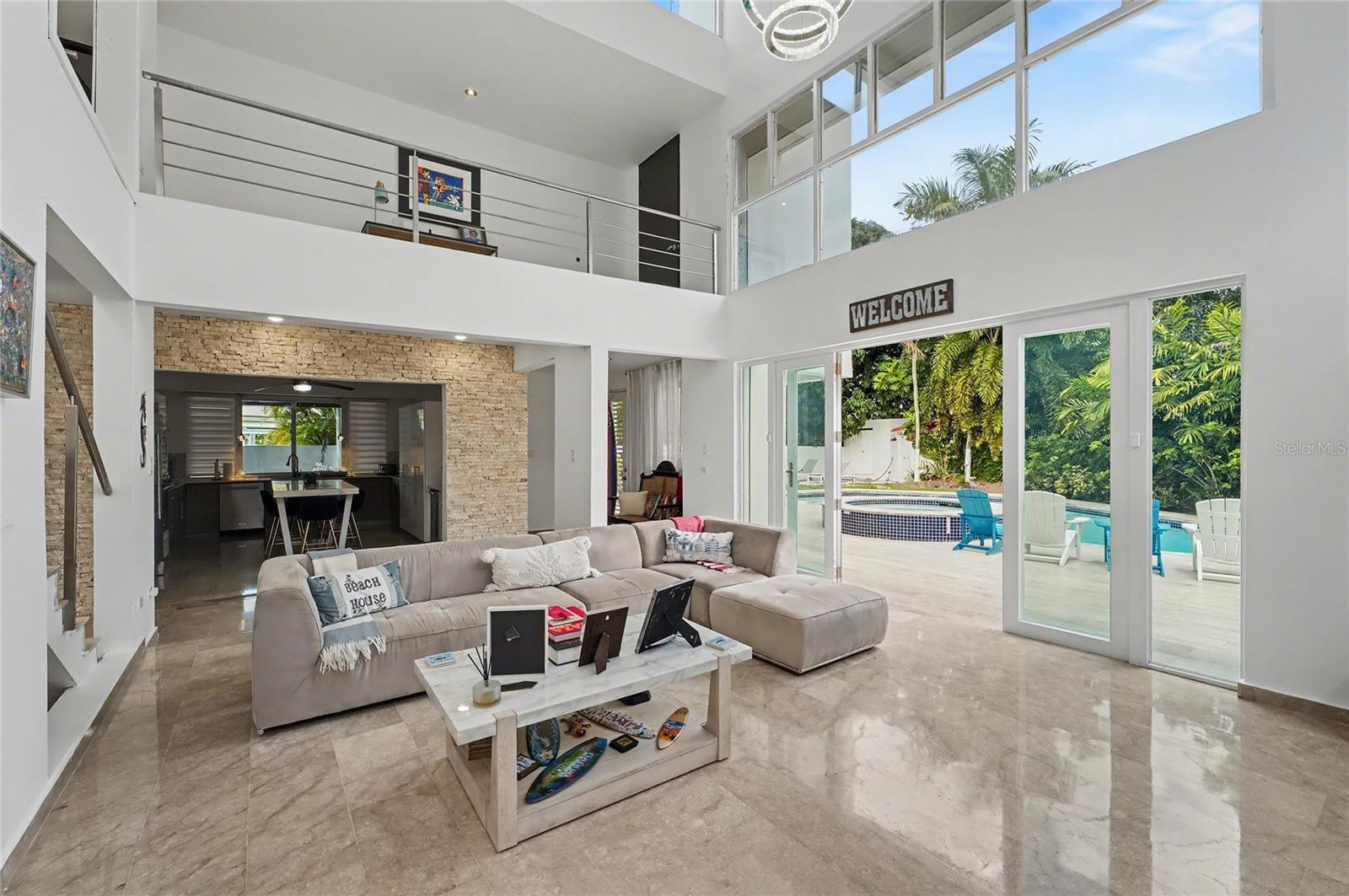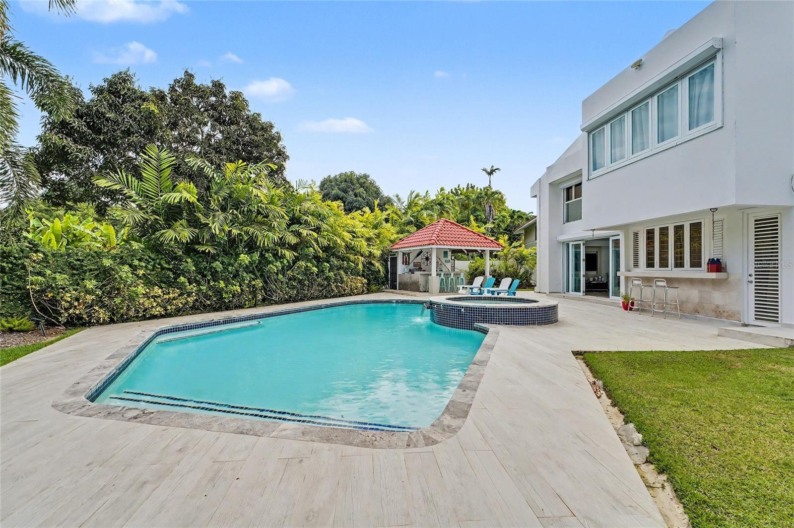Enjoy living in this one-of-a-kind elegant residence nestled within the exclusive gated community of Santa Maria, one of the most sought-after secure enclaves within the San Juan metro area. Experience the best of two worlds at this home thoughtfully designed for large-scale living and entertaining with great presence and privacy, yet this home is also an oasis of tranquility, while being conveniently situated only about 6-8 miles from the city, Old San Juan and the beach. Spanning a grand total area of 6,250 sq.ft., this residence is designed with every detail in mind to feel like your private retreat featuring four oversized bedroom suites, each with an ensuite bathroom, in addition to a guest bedroom or office/flex room with another ensuite bath in the first floor. The house has an elegant formal living area next to a grand dining room, a modern open kitchen opening up into a Great room or family area with majestic double height cathedral ceilings all leading through tall glass doors into the terrace and outdoors. The home is a mini resort with a large fully equipped gym and an ensuite bath, a large covered terrace, a complete gazebo with a wet bar, a pool with a large jacuzzi, an outdoor full bath making this house also one for great entertaining. To complete it all, the home boasts an oversized laundry room, another large terrace on the second floor, several storage areas, 3 separate garages that can accommodate 4-5 cars, a 20kw diesel generator and 2 cisterns, electric hurracaine shutters, fiber optics, alarm, and cameras with a security system. Its excellent location is not only centrally located in San Juan but has a very easy access to most main highways, to the best shopping centers, to Condado, and to The District. It is also near many top services, fine restaurants and excellent schools, all just minutes away.