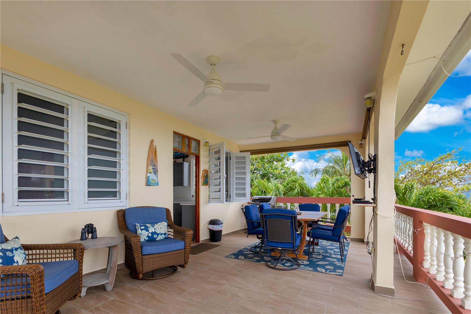 Located in the Puntas area of Rincón, this duplex offers privacy, functionality, and open coastal views in a quiet residential setting. The property consists of two independent units, each with 2 bedrooms and 2 bathrooms, suitable for full-time living or income-producing use. Both units feature private balconies with unobstructed ocean views, allowing for seasonal whale watching directly from the property. A shared rooftop terrace expands the outdoor living space and captures sweeping coastal and sunset views. An outdoor shower provides added convenience after beach or surf sessions. The kitchens are designed with French-style windows, promoting a constant ocean breeze, complemented by high ceilings throughout that enhance airflow and natural light. The property includes an electric vehicle gate entrance, adding security and ease of access. Set on a peaceful side road just off Road 413, the location offers tranquility while remaining close to key surf and beach destinations, including a short drive to Sandy Beach and Domes Beach. Additional features include a fully fenced yard, carport for multiple vehicles, dedicated storage for surfboards or outdoor gear, and backup water and power systems for added reliability. A well-rounded property in one of Rincón’s most desirable neighborhoods—schedule your private showing to experience the views, breeze, and setting firsthand.