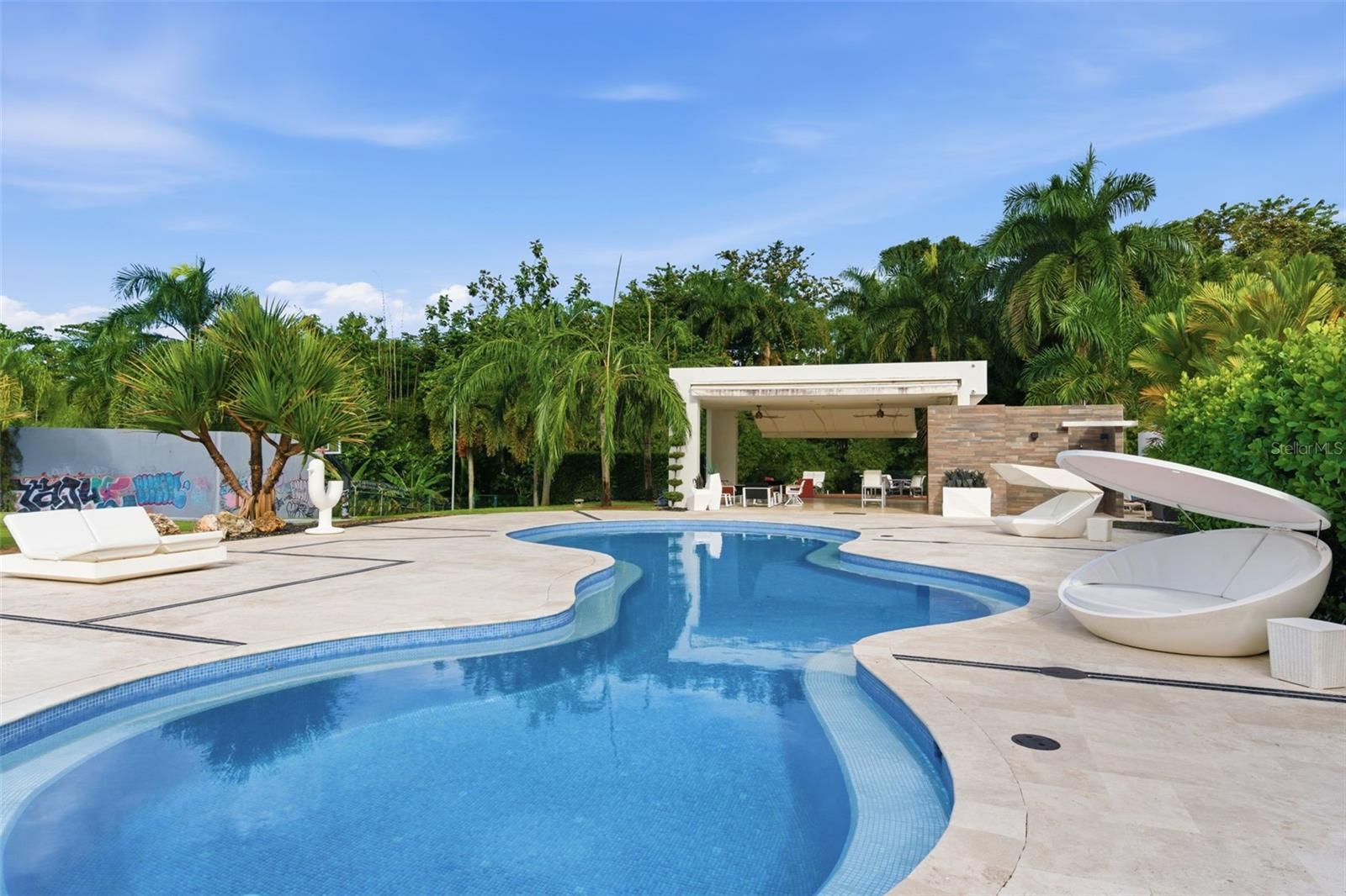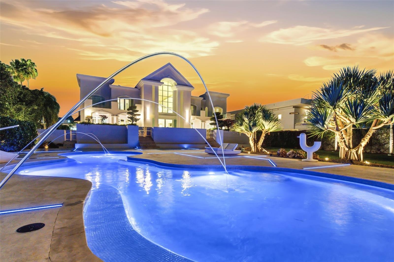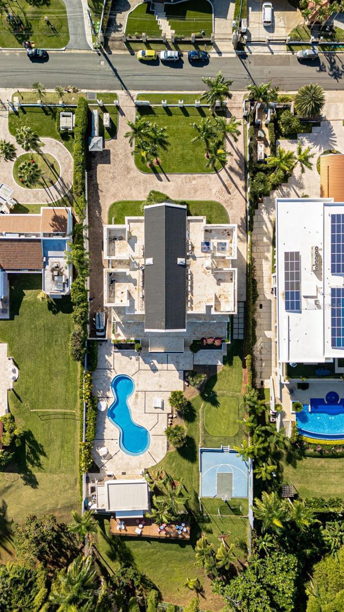 A Landmark Estate on Orquídea Street in Santa María. Set on one of Santa María’s most desirable streets, this distinguished estate occupies over one acre of impeccably landscaped grounds, offering a level of scale, privacy, and architectural presence that is exceptionally rare in San Juan. Approached through an opulent motorcourt, the residence rises with quiet authority. A grand façade, framed by classical columns and symmetrical lines, introduces approximately 9,500 square feet of refined interior living, where double-height ceilings and expansive proportions define every arrival. The home is designed as both a private retreat and a destination for entertaining. Formal and informal living areas flow effortlessly, anchored by a chef’s kitchen, a spacious family room with dry bar and media wall, a dedicated cinema, wine room, pool room, and private office—each space thoughtfully positioned to balance elegance with comfort. Outdoor living unfolds on a true estate scale. Manicured lawns frame a resort-style swimming pool, expansive terraces, and grand balconies overlooking the grounds. An outdoor kitchen and deck create a natural gathering point for entertaining, while a half basketball court adds a lifestyle-driven dimension rarely found in homes of this caliber. Multiple levels are seamlessly connected by a private elevator and dumbwaiter, enhancing everyday functionality without compromising the home’s formal character. Expansive bedroom suites offers privacy and tranquility, completing a layout designed for multigenerational living or extended stays. This is a residence for those who value architectural presence, generous proportions, and enduring quality—a true Santa María estate that stands apart for its scale, setting, and sense of permanence.