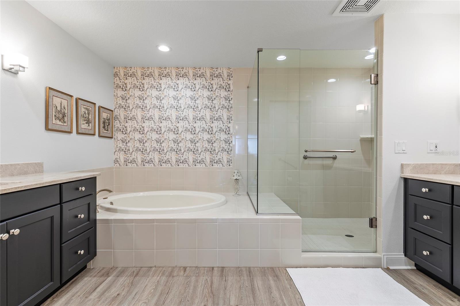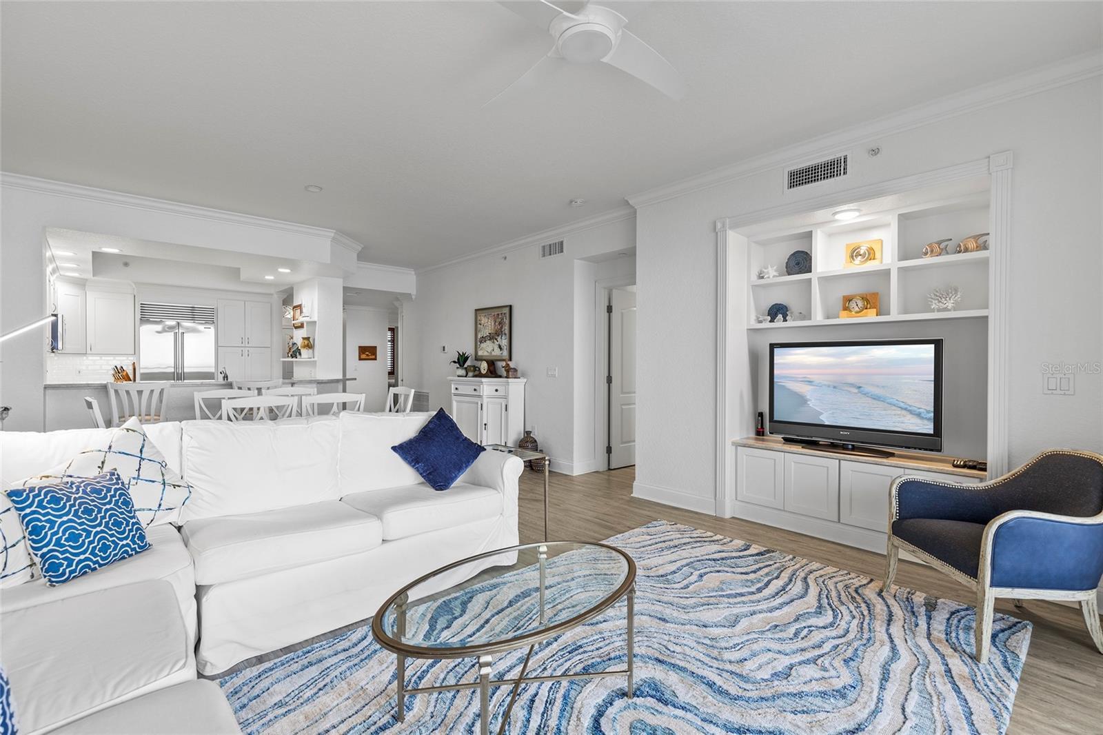 - Ceiling Fans(s), Crown Molding, High Ceilings, Kitchen/Family Room Combo, L Dining, Living Room/Dining Room Combo, Primary Bedroom Main Floor, Solid Surface Counters, Solid Wood Cabinets, Thermostat, Walk-In Closet(s), Window Treatments