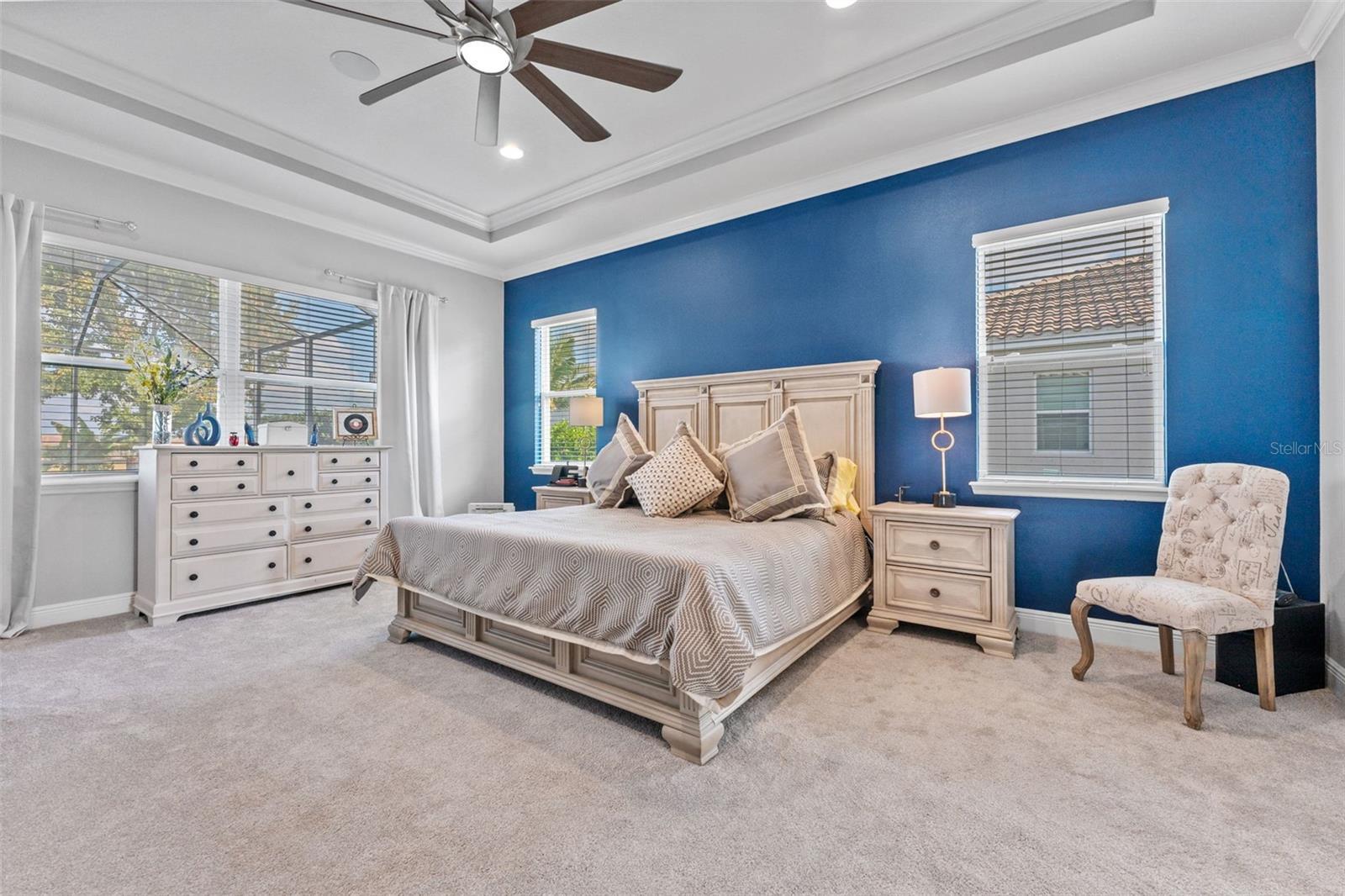 - Crown Molding, Eat-in Kitchen, Kitchen/Family Room Combo, Primary Bedroom Main Floor, Solid Surface Counters, Solid Wood Cabinets, Split Bedroom, Thermostat, Tray Ceiling(s), Walk-In Closet(s), Window Treatments
