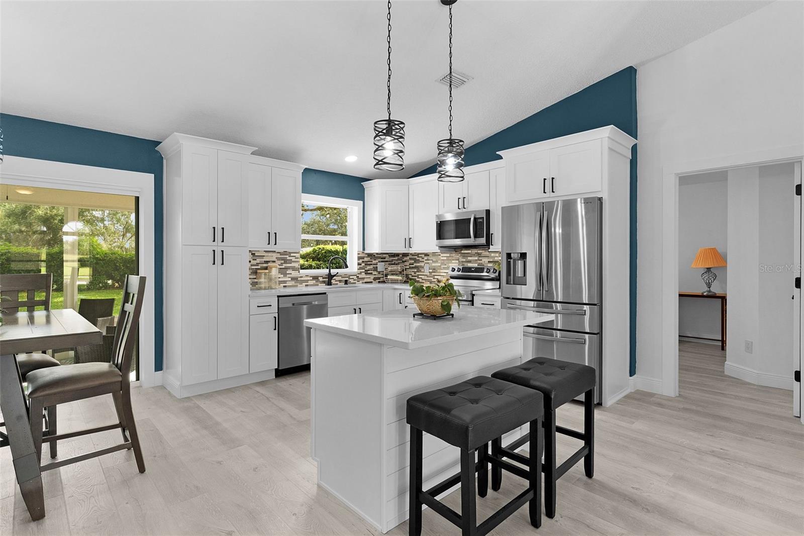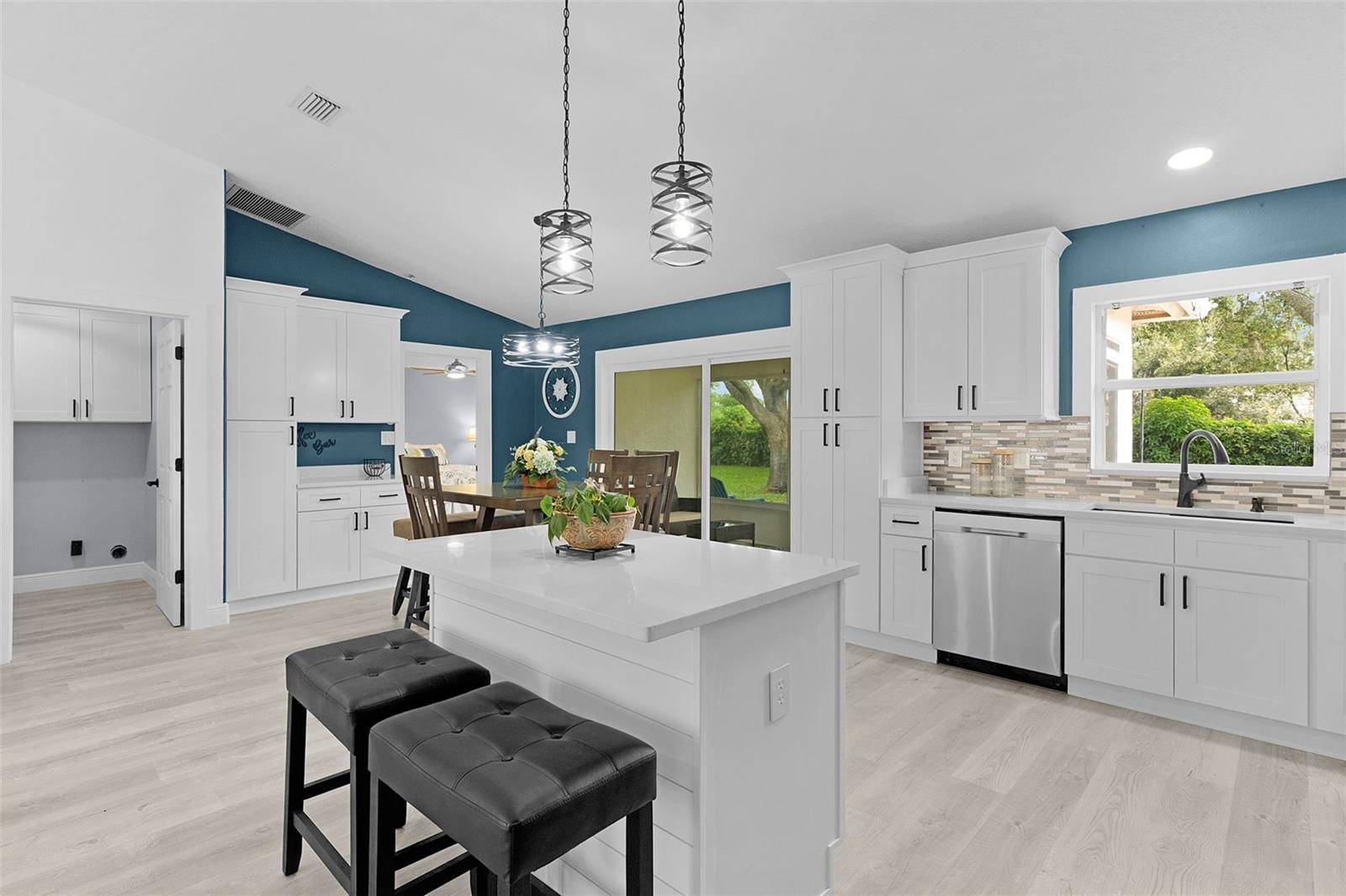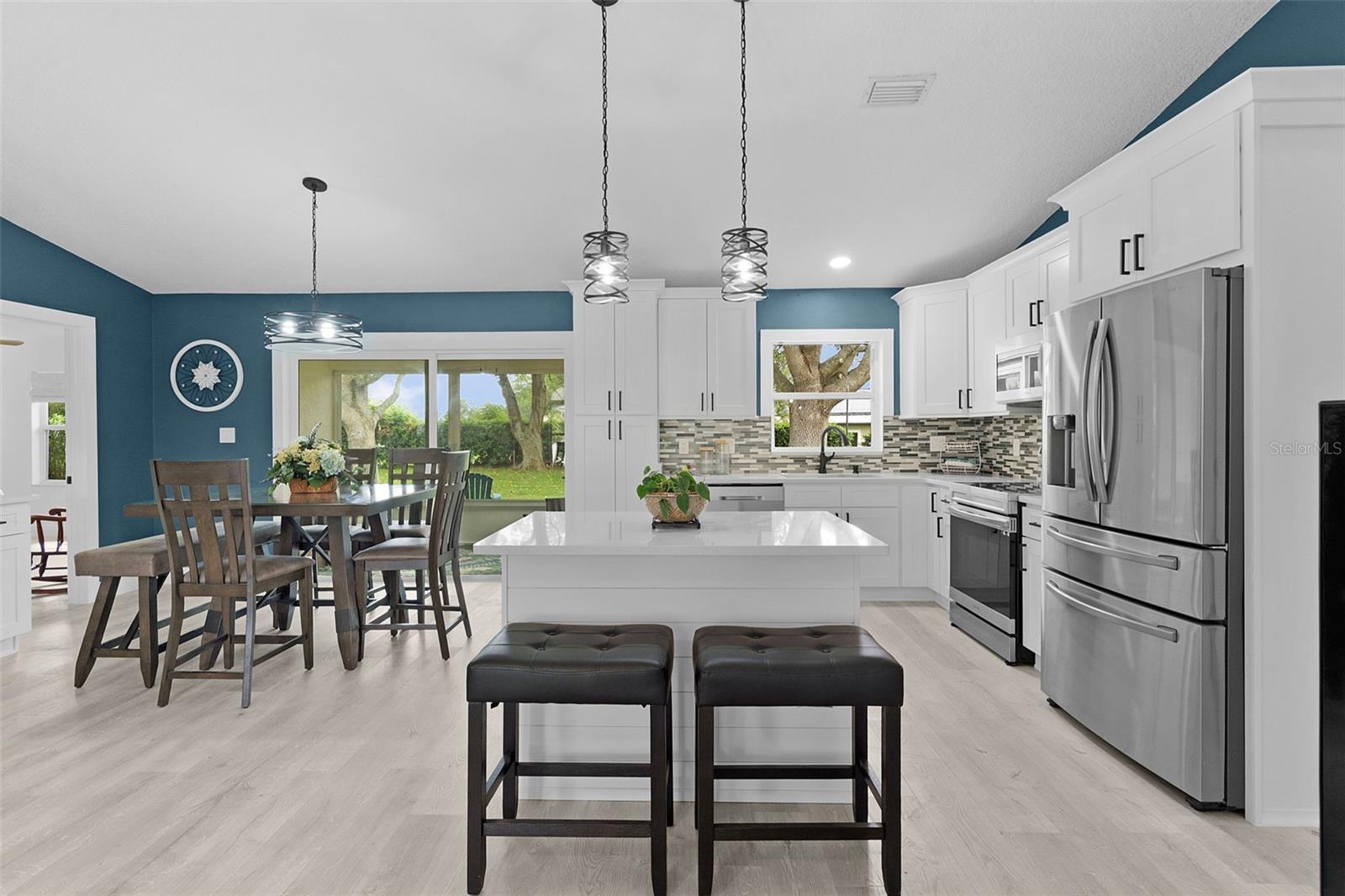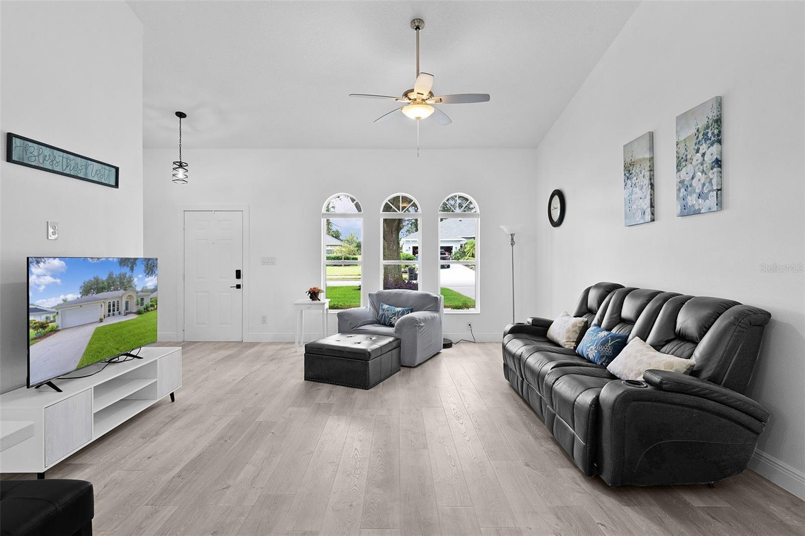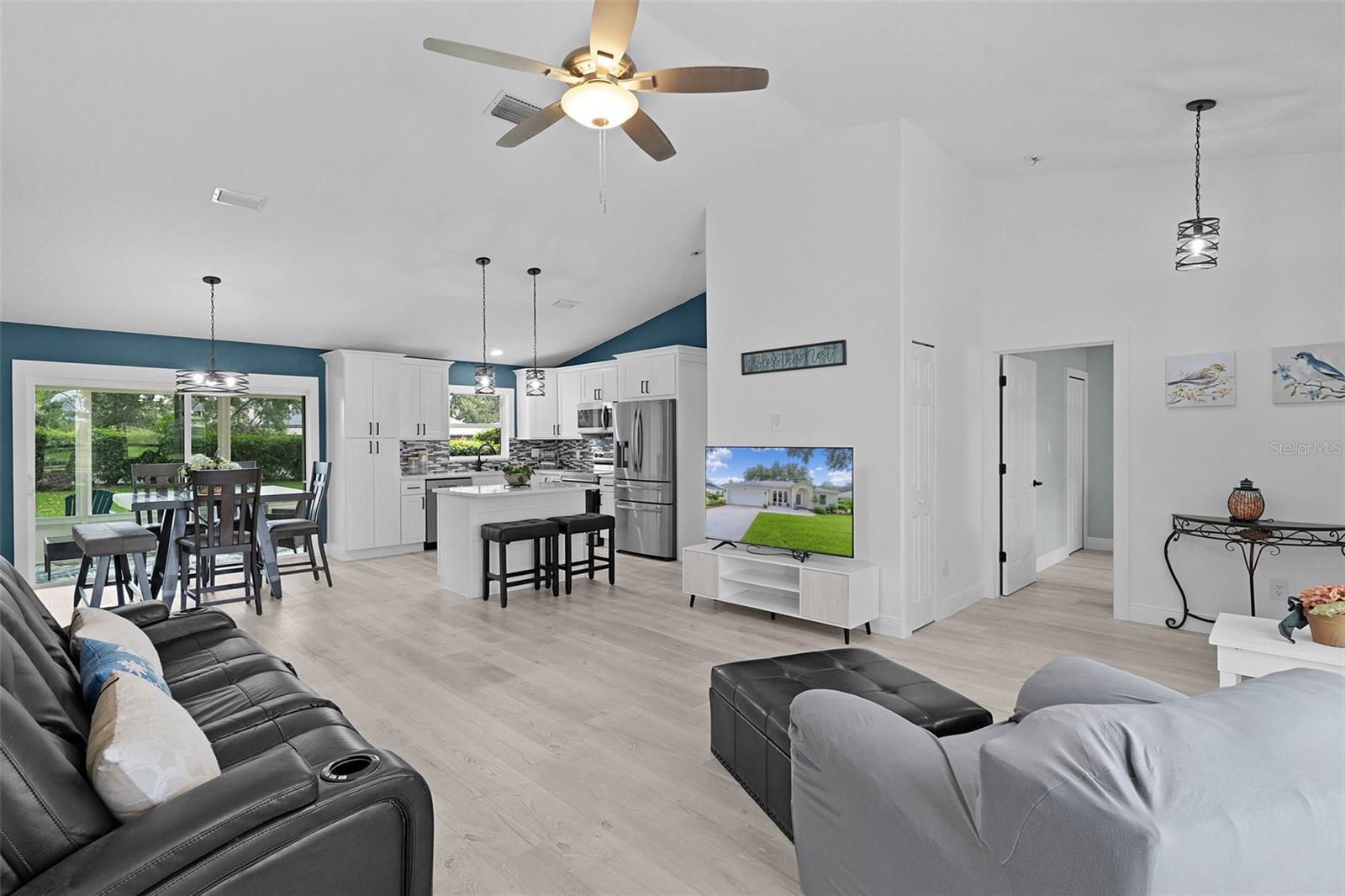 This home is ready to move into! Owner remodeled with the intention to stay so you know that the quality is not that of a flipped home! Everything has been redone down to the switch plates! New in the home you will find the following: Pergo flooring throughout* wider 5” baseboards (even in the closets!)* Door frames have been updated to match the rectangular design of the new shaker style cabinets* lights & fans inside & out including lamp post, garage side lights & outdoor entryway* slider from the kitchen to the lanai*door knobs* entry keypad*bathroom vanities, sinks and tub, tile surround & shower with all new fixtures*garage floor repainted* Kitchen appliances are 3 years old and hardly used. Roof (2020) HVAC (2025) Hot Water Heater (2024). The plumbing in the home has been totally re-piped in 2024* (highly important feature for homes in this community which were built with copper pipes/plumbing). Even the sprinkler box is NEW! For storage, two closets have been added! One in the entry way that can be used for sweepers, switfters etc and one in the Primary Bedroom, which now has a built-in closet as well as a walk-in closet. The remodeled kitchen has new cabinets which include TWO pantries, and an island that is open to the dining area and living room. Quartz counters in the Kitchen and guest bathroom exemplify the updated look of this gorgeous home! Cabinets & shelves have also been added to the indoor laundry room for all your storage needs! Walls throughout the home are freshly painted in neutral tones. For a bit of color, the kitchen was painted with a darker color to highlight the white cabinets! Is there anything left to do?! Time to move right in! If you are looking for a community with mature landscaping and your neighbors more than a “stone throw away” then make an appointment to see your new home! This community is approximately 10 minutes to The Villages, shopping & restaurants, but the drive home takes you by open green areas where you might see horses or sheep! Airports, Disney and the ocean are approximately an hour and 15 minutes away. Residents may choose to become social members at the clubhouse for an additional fee. Please call the clubhouse for information on how you can enjoy features such as pickleball, tennis, indoor racquetball, sauna and weight room. The breathtaking views overlooking Lake Griffin from the gorgeous pool might alone just be with the membership! If you would rather be on the lake than observing the view, there is also an opportunity to use the marina! The clubhouse restaurant is just perfect for your needs after golfing, swimming or boating. LOW HOA fee of $77/month! Home in The Grove at Harbor Hills in a guarded gate community! Information deemed reliable & true but should be independently verified by buyer(s). Furniture available separately.