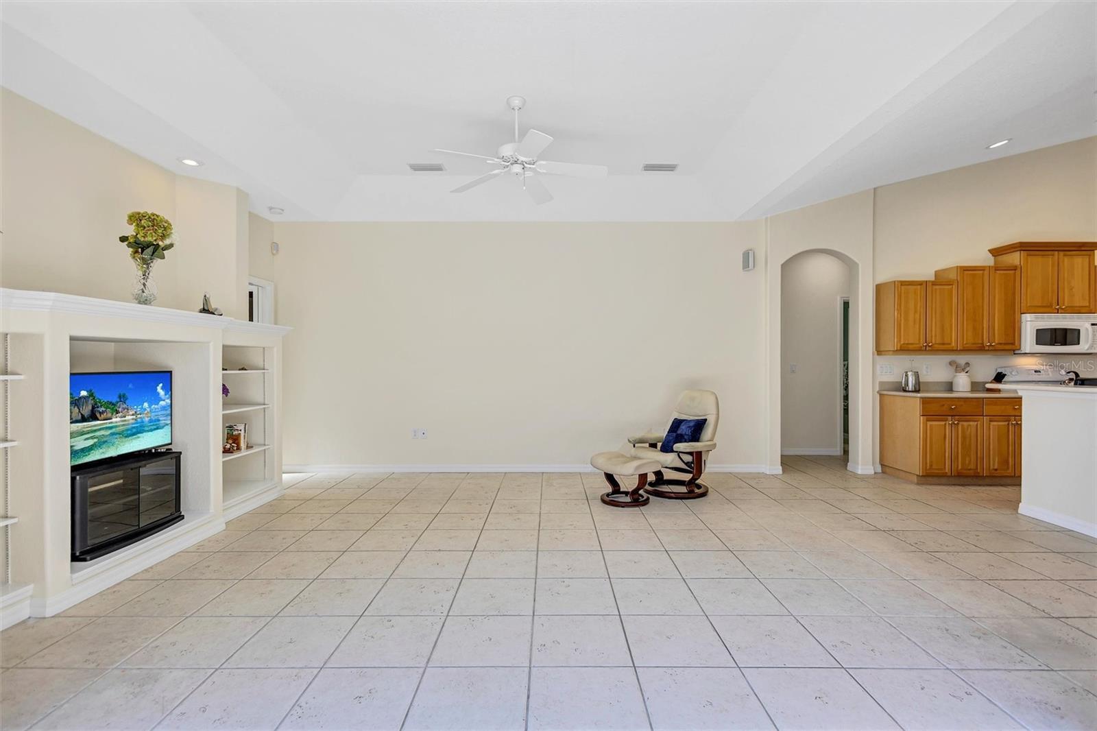 - Ceiling Fans(s), Coffered Ceiling(s), Crown Molding, Eat-in Kitchen, High Ceilings, Kitchen/Family Room Combo, Open Floorplan, Primary Bedroom Main Floor, Solid Surface Counters, Thermostat, Walk-In Closet(s)
