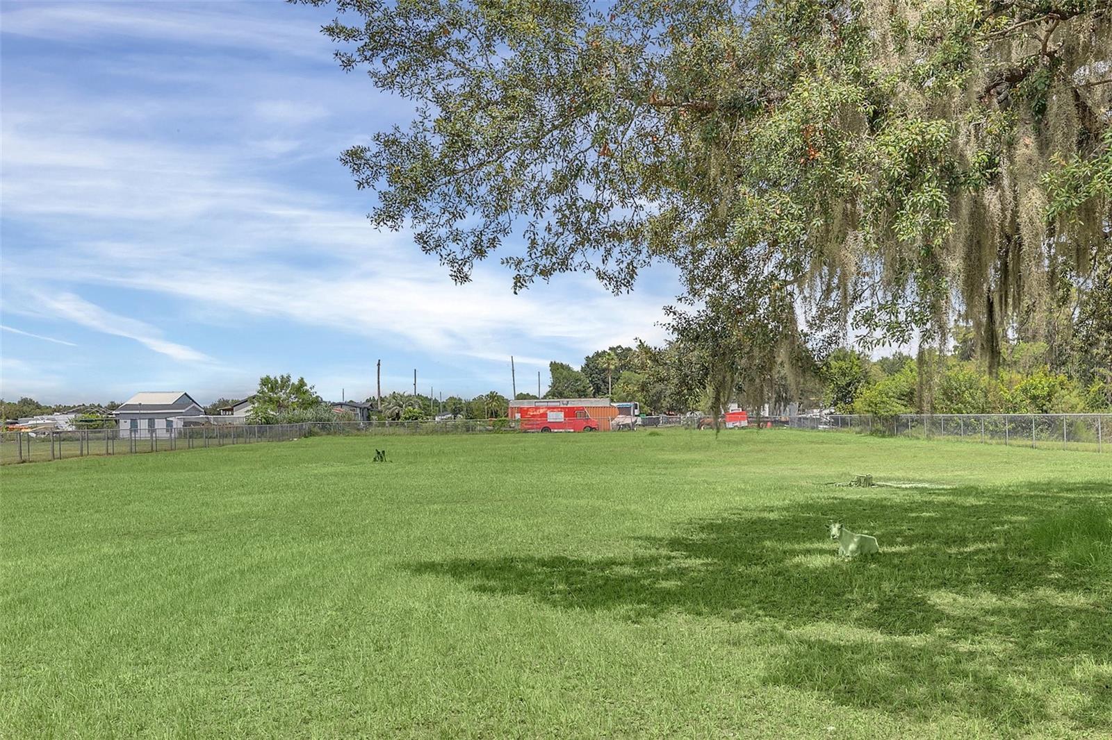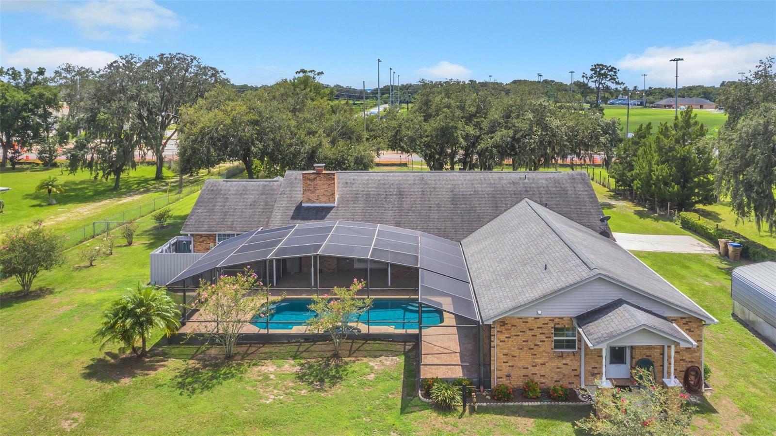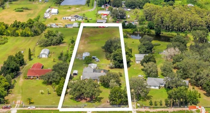 This property has it all! 2.50 Acres with a 3 bed/2 bath pool home and a 2016 1 bed/1 bath Guest House. The main house is 3250 total sq. ft. and the guest house is 968 sq. ft. with a total of 4218 sq. ft. Both of these homes have real brick exteriors. The sunken living room has a beautiful wood burning brick fireplace, high ceilings and Italian Porcelain Tile. There's a beautiful salt water sports pool with a spa and heater. In the kitchen you'll find a dinette area and a kitchen island. It has Level 4 Granite countertops and custom hickory kitchen cabinets. The kitchen has a breakfast bar with seating for 8. The main house has been updated with double pane windows, new plumbing, new water softener, water heater, real wood floors, Italian Porcelain tile, custom blinds, French doors, custom crown & molding, custom toilet and porcelain tub in the Master bath, and seamless gutters with leaf guards. The septic drain field was replaced in 2016 and the roof on both homes are only 7 years old. The Guest House has custom hickory kitchen cabinets with granite countertops, custom blinds, and custom crown and base molding. The property has a Swan security system with cameras and a monitor. The fire alarm system is connected to both homes so if one goes off they all go off. It has a 2 car garage with a new garage door opener and camera. There is a stand alone 12x20 carport, 10x20 small shed, 12x24 large shed with AC, and a 20x32 Big Shop. The property is beautifully landscaped with lots of fruit trees including Mango, Papaya, Peach, Pomegranate and Star Fruit. The property behind the home and across the front is fenced with chain link, and it has an electric gate at the entrance. It also has a cross fence behind the home so there's plenty of room for your animals. Perfect location to everything, only 8.5 miles to the Orlando Airport, 6.5 miles to Lake Nona, 8.7 miles to the FL Turnpike, and Austin Tindall Park is right across the street. All measurements are approximate.