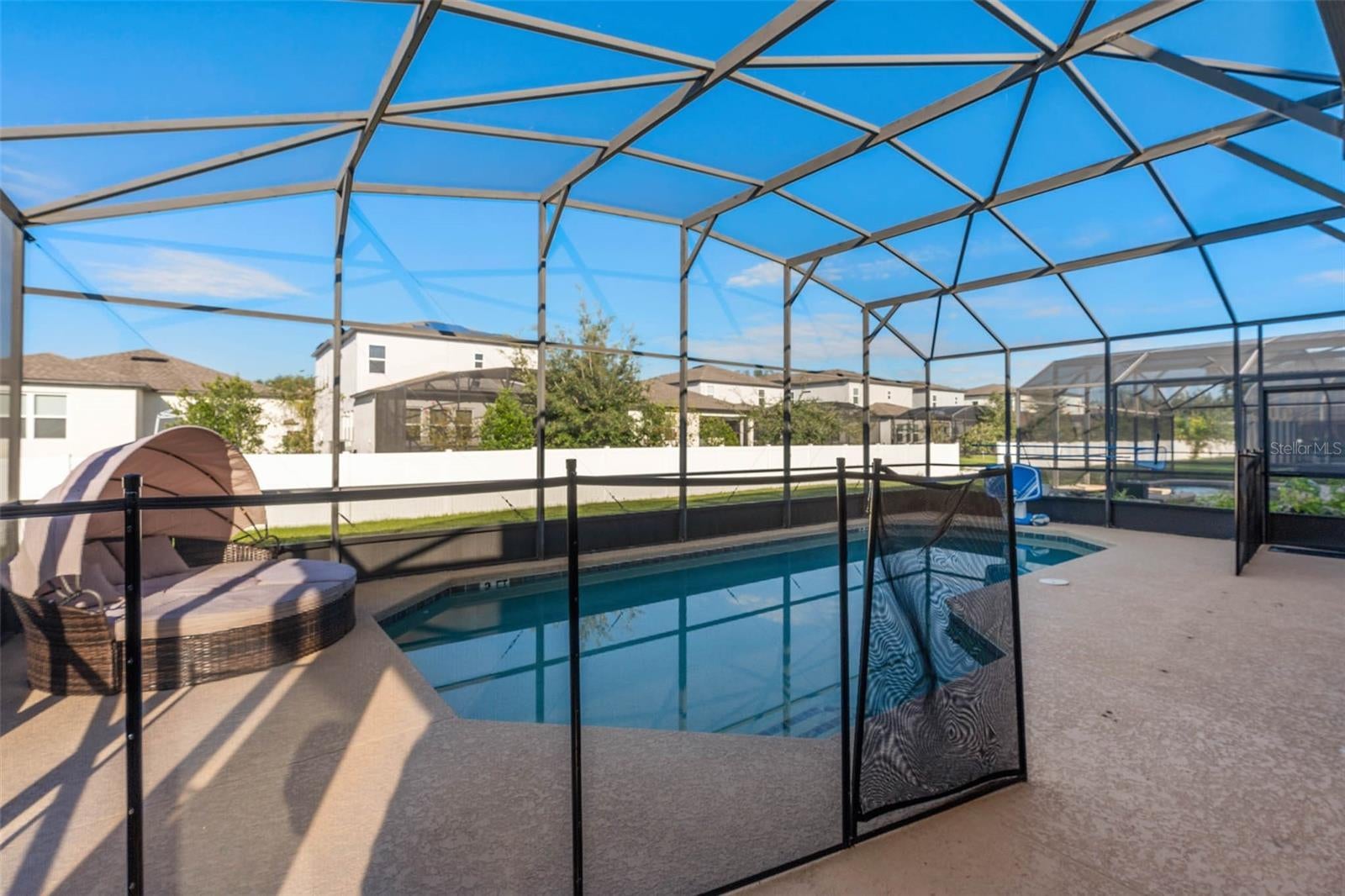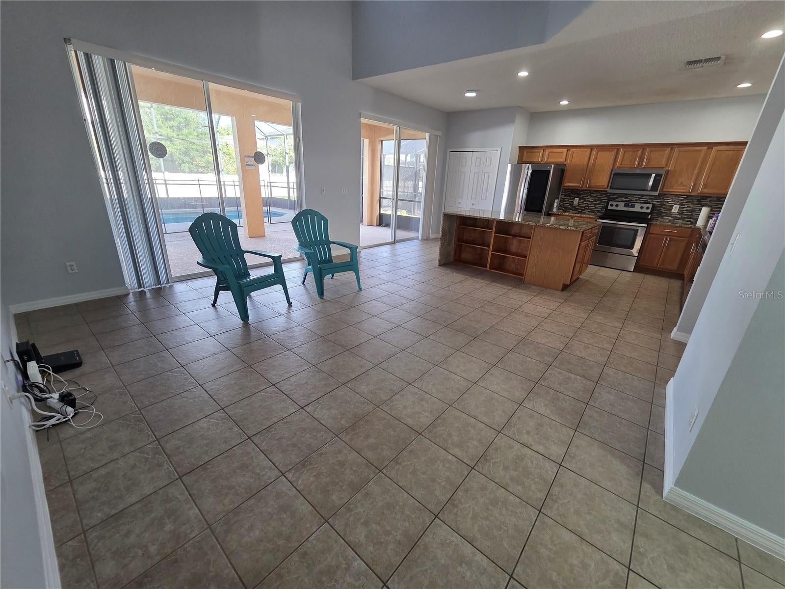 **Lawn Care and Pool maintenance is included.** Beautiful and spacious 6 bedroom+additional office/den 5.5 bath, Screened POOL with heater and large covered lanai and deck, perfect for relaxing and fun. Wonderful open concept with high ceilings. Kitchen features: sleek stainless steel appliances including farmhouse sink and french door refrigerator with drink door, granite counter tops, pantry and Huge island with space for counter chairs. Bright large dining area and grande open concept living and kitchen area with sliding doors leading to the covered lanai and pool, 4 out of 6 generously sized bedrooms are master suites featuring: Tub with shower and granite vanity. Primary Master suite features: Garden tub , separate shower and granite vanity. Upstairs has brand new Vinyl flooring throughout, No carpet. Garage with new epoxy floor. Perfectly located minutes from shopping, restaurants, entertaining and theme parks. UNFURNISHED