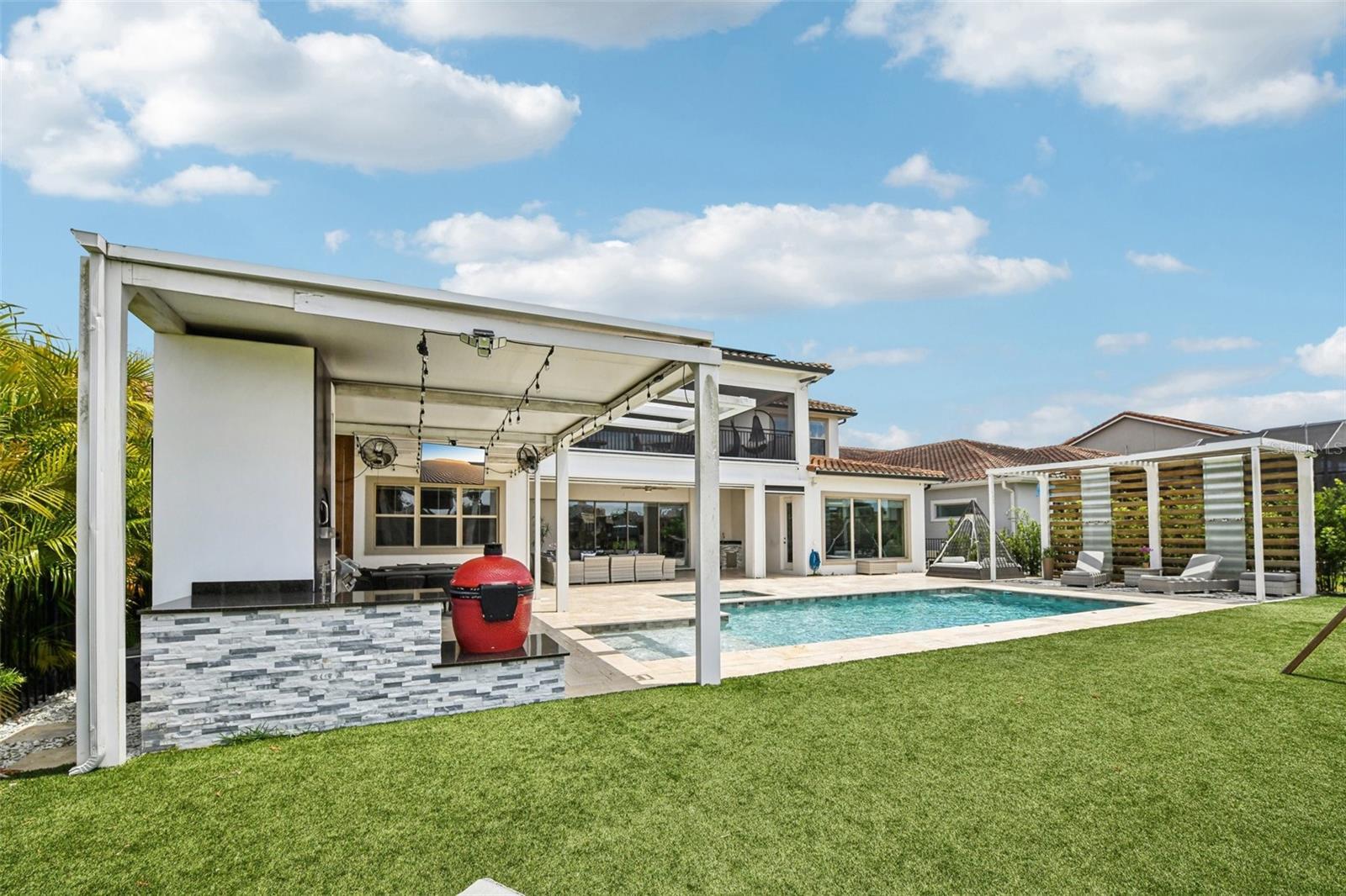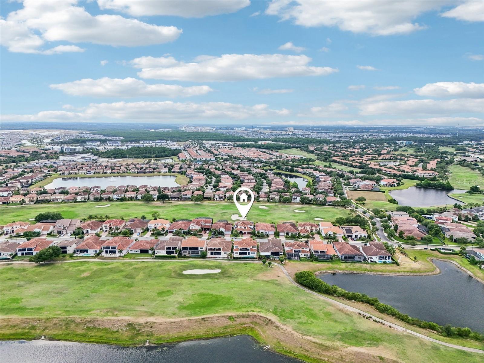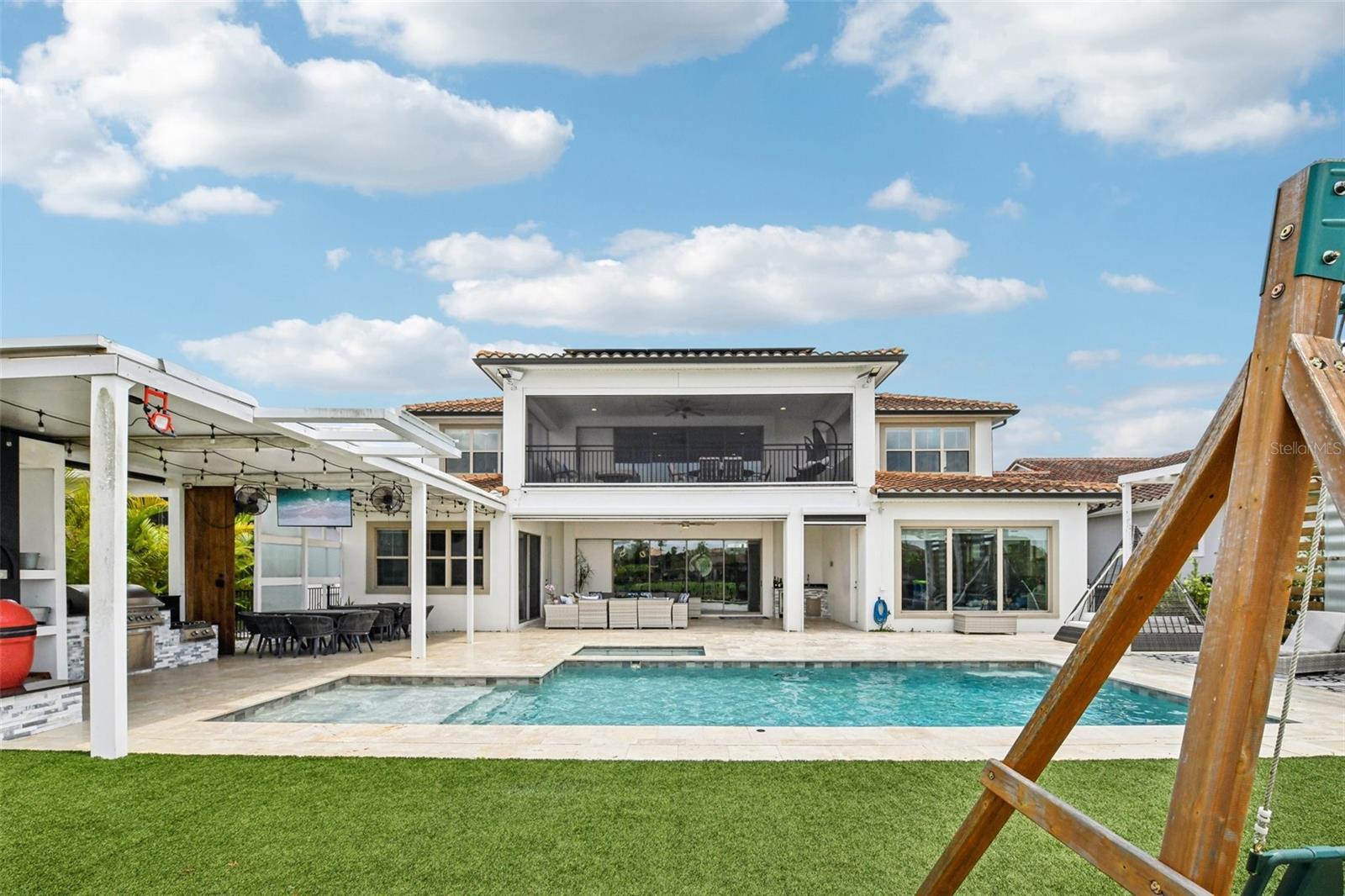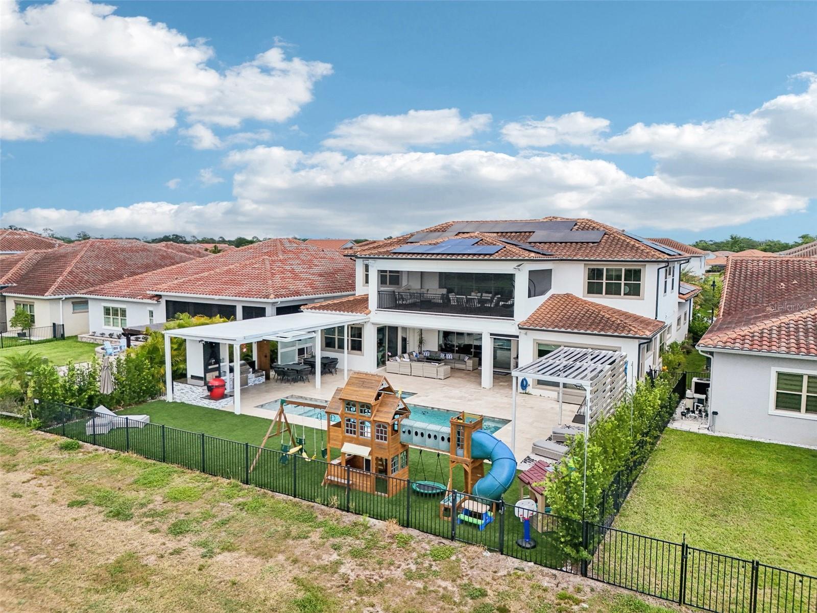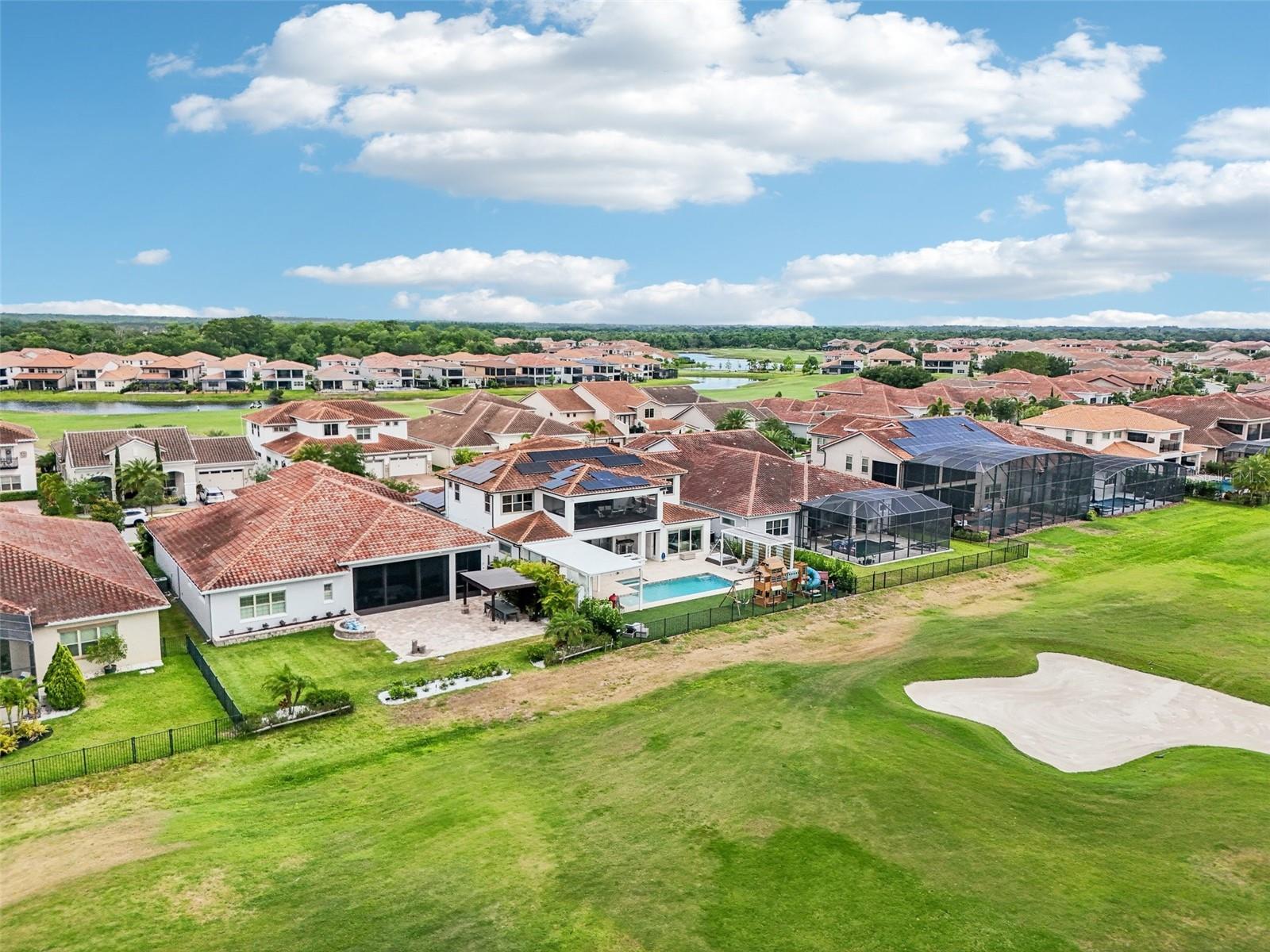 PRICE IMPROVEMENT AND SELLER IS OFFERING $30,000 BUYER CONCESSION! Welcome to 13136 Alderley Drive – a luxurious 5-bedroom, 5-bath estate offering over 5,400 heated sq ft of exquisitely designed living space in one of Orlando's most sought-after gated golf course communities, Eagle Creek. Situated on an oversized lot with sweeping views of the 16th hole, this home defines Orlando Florida luxury living featuring a heated waterfall pool and spa, expansive sunbathing areas, an outdoor kitchen with pizza oven, a private playground and the back porch which is an entertainers dream. Inside, a grand entryway with a dramatic staircase sets the tone for the open-concept layout connecting the living and dining rooms to a gourmet kitchen with high-end appliances and elegant two-tone quartz waterfall countertops. The primary suite is a serene retreat with private pool access, a spa-inspired en-suite featuring a dual waterfall walk-in shower, soaking tub, dual vanities, and a custom walk-in closet with built-ins.Upstairs, enjoy a spacious loft with a wet bar and direct access to an expansive balcony – the perfect place to unwind and watch the beautiful sunsets over the golf course. Additional features include a wine room, dual laundry rooms, a drop zone, built-in storage, a 3-car garage with extra storage, retractable screens and solar panels which provide lower utilities. With a golf cart drop-off to the on-site elementary school, this home blends elegance, convenience, and family-friendly amenities like a resort style pool area in the heart of Lake Nona.Don’t miss your opportunity to own this one-of-a-kind dream home in the gated community of Eagle Creek! Close to Disney, Medical City, Orlando International Airport, Medical City (Nemours, VA Hospital), Beaches and USTA. Zoned for Florida Dept of Education A rated schools.