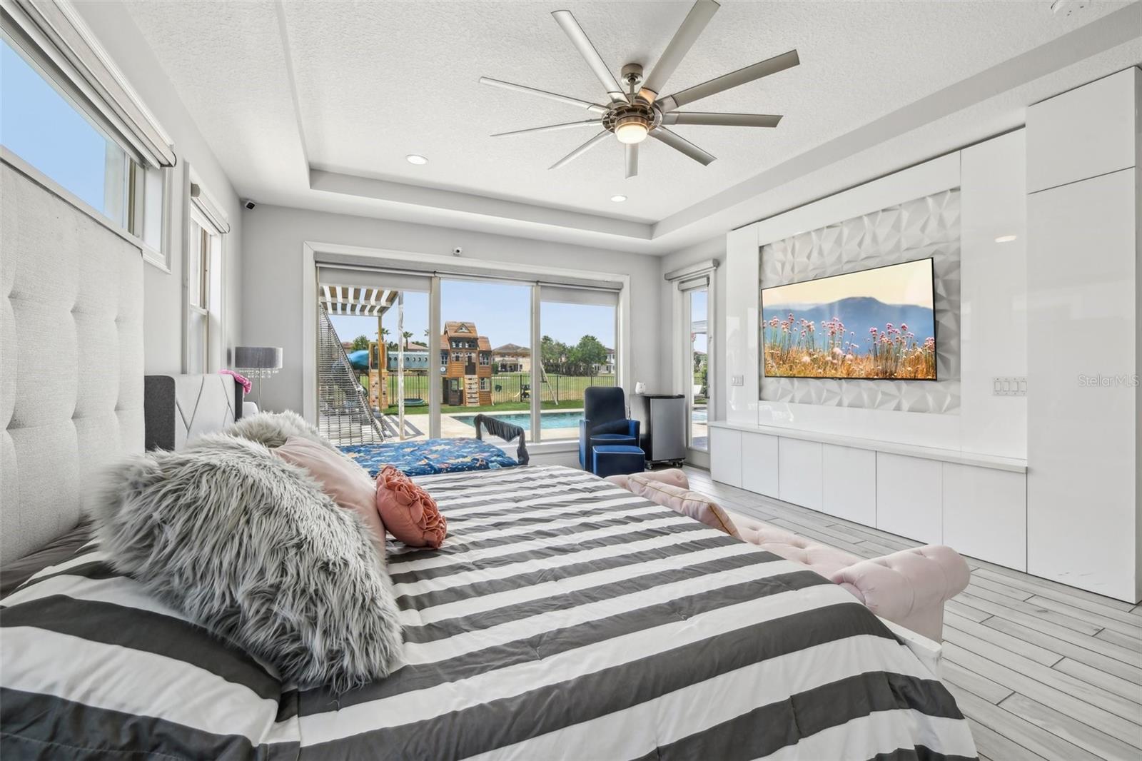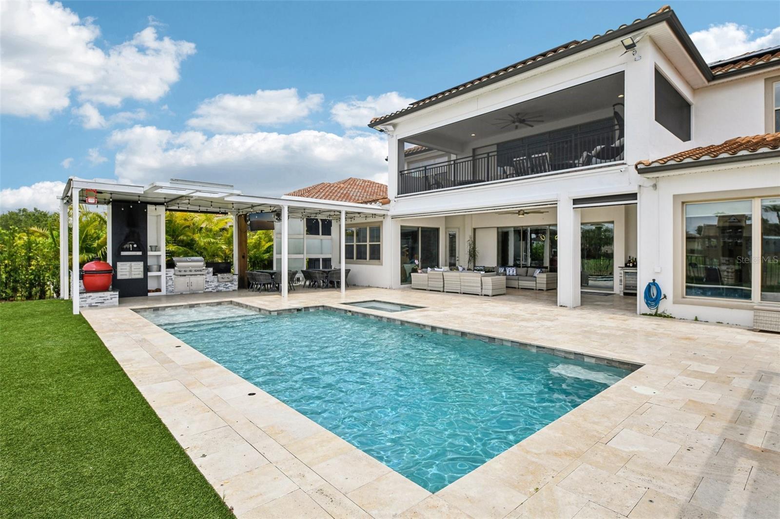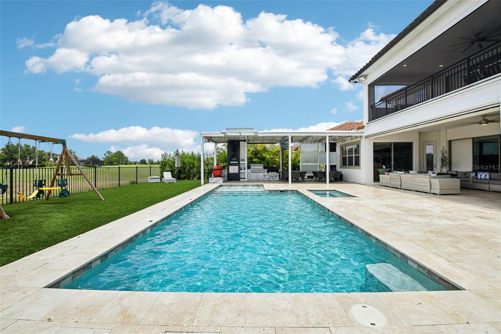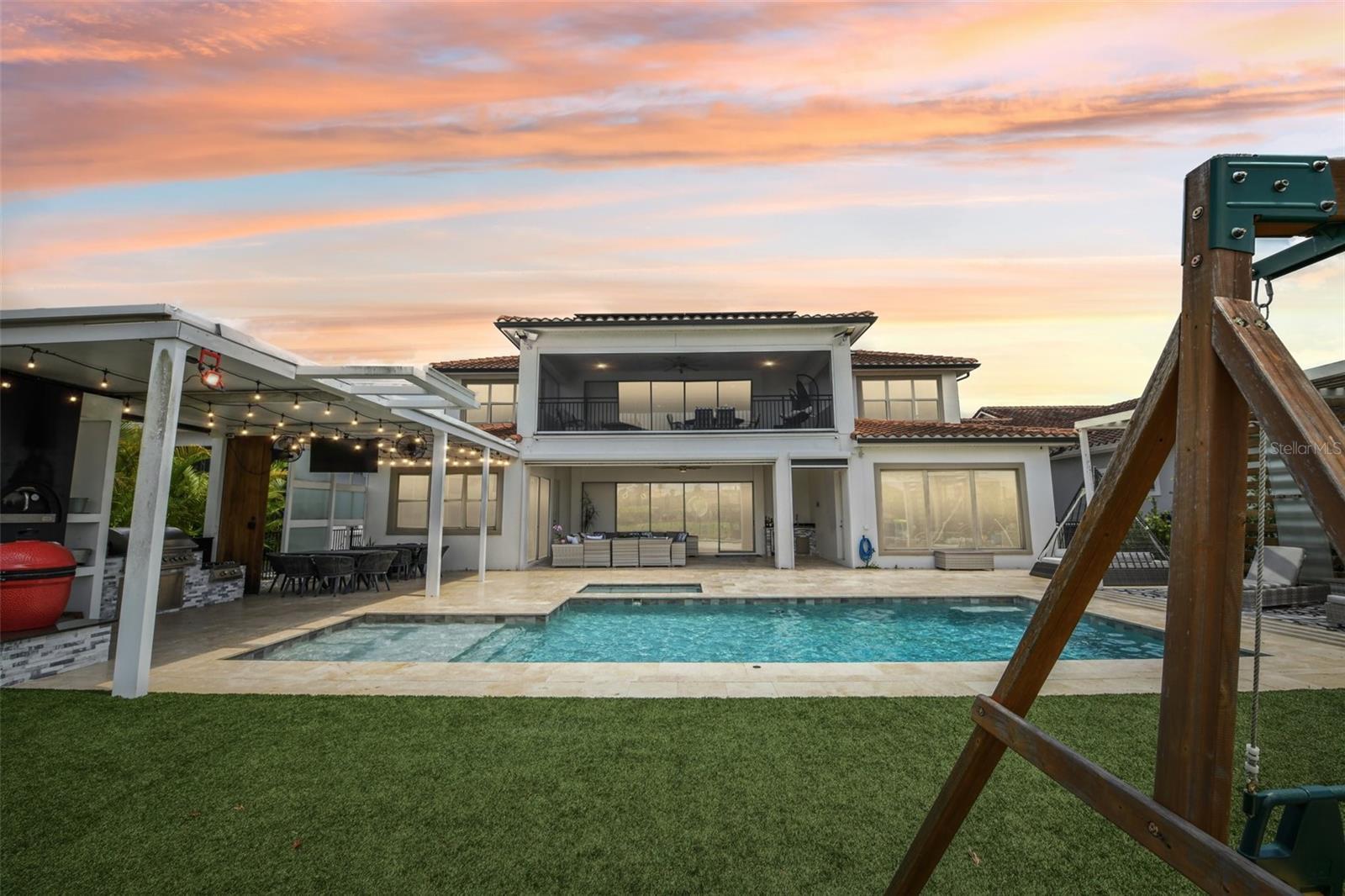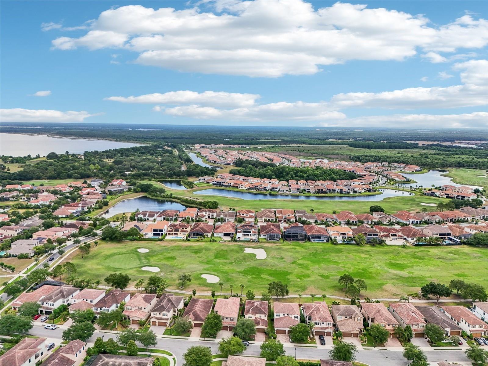 PRICE IMPROVEMENT AND SELLER IS OFFERING $30,000 BUYER CONCESSION! Welcome to 13136 Alderley Drive – a luxurious 5-bedroom, 5-bath estate offering over 5,400 heated sq ft of exquisitely designed living space in one of Orlando's most sought-after gated golf course communities, Eagle Creek. Situated on an oversized lot with sweeping views of the 16th hole, this home defines Orlando Florida luxury living featuring a heated waterfall pool and spa, expansive sunbathing areas, an outdoor kitchen with pizza oven, a private playground and the back porch which is an entertainers dream. Inside, a grand entryway with a dramatic staircase sets the tone for the open-concept layout connecting the living and dining rooms to a gourmet kitchen with high-end appliances and elegant two-tone quartz waterfall countertops. The primary suite is a serene retreat with private pool access, a spa-inspired en-suite featuring a dual waterfall walk-in shower, soaking tub, dual vanities, and a custom walk-in closet with built-ins.Upstairs, enjoy a spacious loft with a wet bar and direct access to an expansive balcony – the perfect place to unwind and watch the beautiful sunsets over the golf course. Additional features include a wine room, dual laundry rooms, a drop zone, built-in storage, a 3-car garage with extra storage, retractable screens and solar panels which provide lower utilities. With a golf cart drop-off to the on-site elementary school, this home blends elegance, convenience, and family-friendly amenities like a resort style pool area in the heart of Lake Nona.Don’t miss your opportunity to own this one-of-a-kind dream home in the gated community of Eagle Creek! Close to Disney, Medical City, Orlando International Airport, Medical City (Nemours, VA Hospital), Beaches and USTA. Zoned for Florida Dept of Education A rated schools.