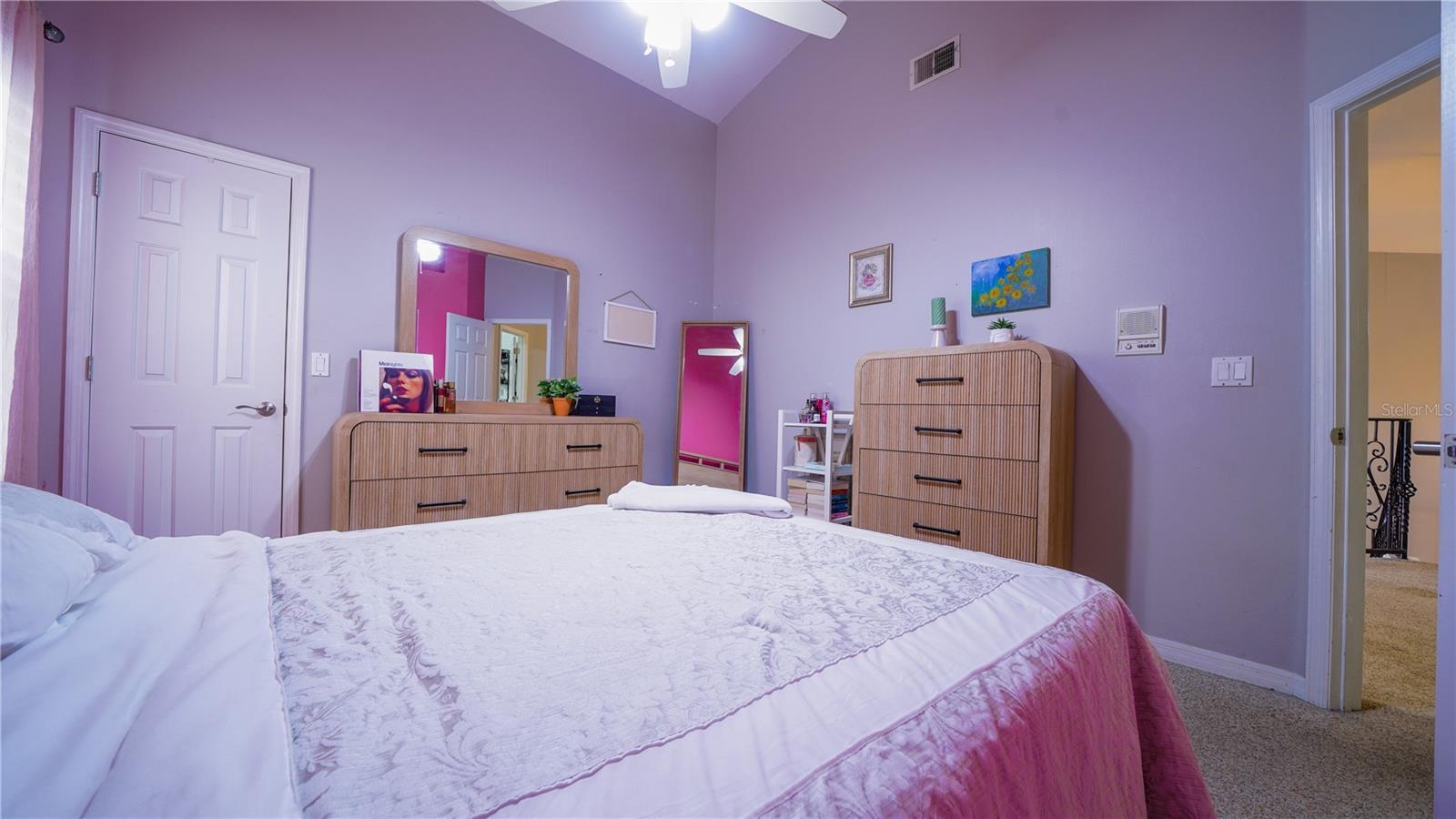 - Cathedral Ceiling(s), Ceiling Fans(s), Primary Bedroom Main Floor, Solid Surface Counters, Solid Wood Cabinets, Thermostat, Walk-In Closet(s)