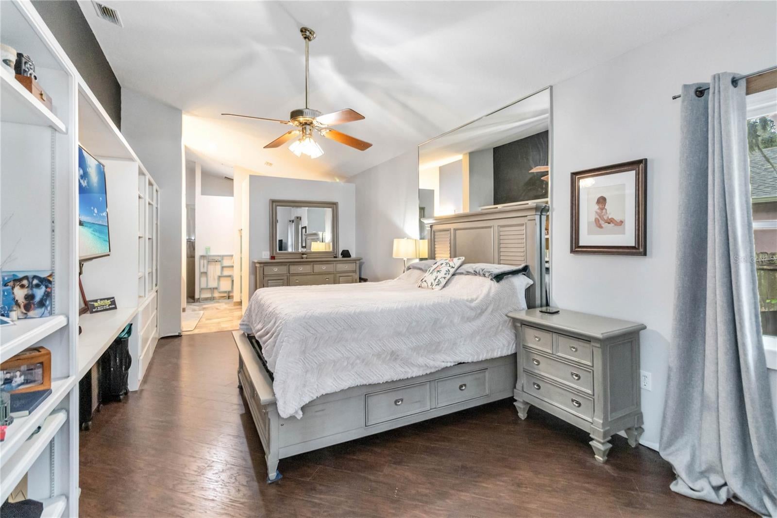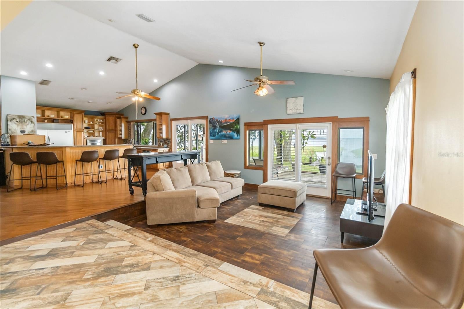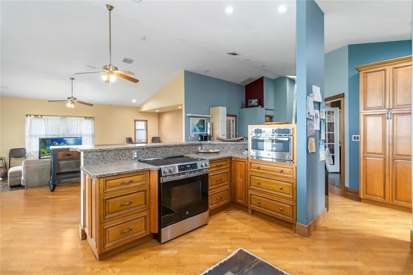 - Ceiling Fans(s), Central Vaccum, Living Room/Dining Room Combo, Open Floorplan, Solid Wood Cabinets
