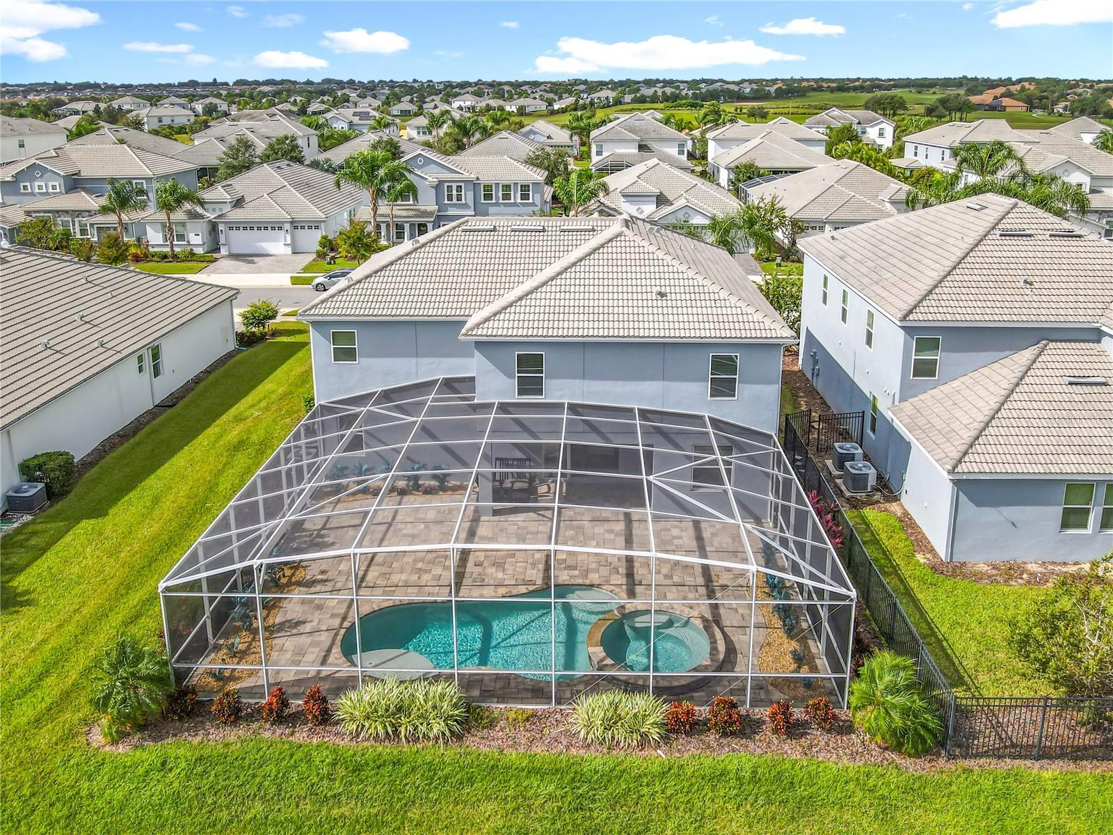 Beautifully UPGRADED and impeccably maintained by current owners, this stunning 6 bed 4.5 bath POOL HOME with IN LAW SUITE, boasts pretty pond views with impressive water fountain! Located in the quiet, residential Country Club section with access to its own exclusive clubhouse and amenities. The recent upgrades include NEW screened, heated, saltwater pool and 8 person spa with sun shelf, water features, oversized paved deck and covered lanai - perfect for entertaining and relaxing. NEW exterior and interior paint, including kitchen cabinets. Upgraded lighting and ceiling fans. NEW built in feature wall and entertainment center. NEW built in banquet bench seating in breakfast nook. The floor plan flows beautifully throughout this bright and airy home - the In Law suite not only has separate access, but also its own 1 car garage. As a resident of this highly sought after Championsgate resort-style, gated community, you’ll have access to the Oasis Club, a 14,000 sq ft clubhouse featuring a restaurant, movie theater, fitness center, game room, tiki bar, lazy river, cabanas, and more. The exclusive "Plaza" offers a second restaurant, bar, fitness center, game room, pickle ball courts, and two pools, while the newly opened Retreat Club boasts a full waterpark. The HOA includes access to all these amenities, FULL GOLF AND TENNIS memberships, pickle ball, a $75 food credit at The Plaza, gated entries, complete lawn care, security monitoring, cable, phone, and internet. CDD and trash services are included in the taxes. ChampionsGate Country Club offers the ultimate resort lifestyle, perfectly situated near Orlando’s theme parks, world-class golf, shopping, and fine dining. Don’t miss your chance to live this elite Florida lifestyle in this fabulous home!
