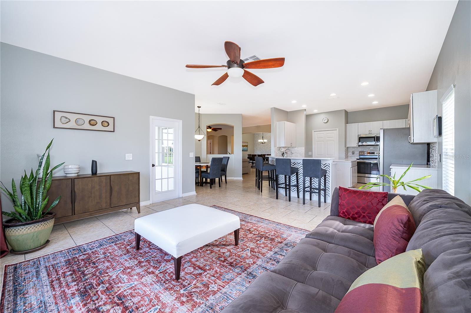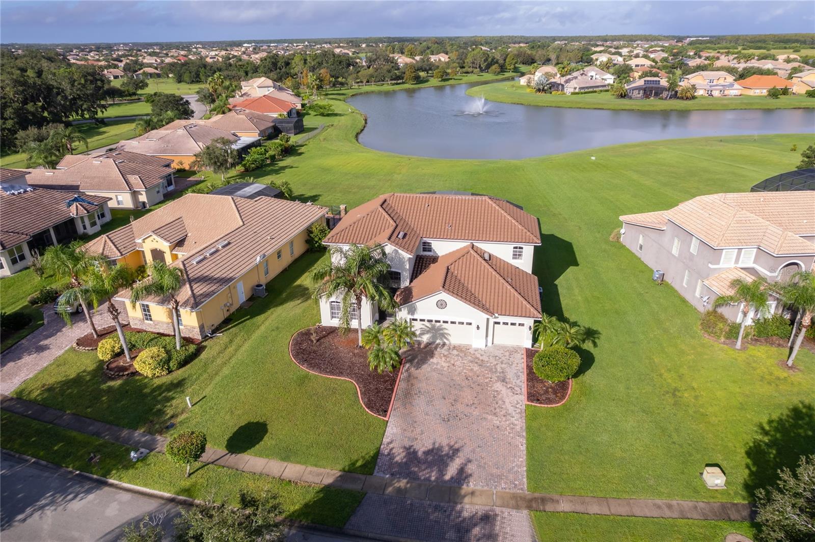Are you looking for the perfect family home in a prime location? Look no further welcome home! This stunning 3,600-square-foot residence combines elegance and comfort with beautiful hardwood and tile floors throughout. The primary suite, located on the main floor, offers serene lake views and a luxurious ensuite with double vanities topped with marble, a soaking tub, and a separate shower. Also on the main floor, you'll find an additional bedroom with its own full bathroom perfect for guests or multigenerational living. Upstairs, there's plenty of space for everyone. A spacious loft with wood floors offers an additional living area. You'll also find four generously sized bedrooms, each with large closets, along with two well-appointed bathrooms to ensure comfort and privacy for both family and guests. The kitchen is a true showstopper with granite countertops, with brand-new appliances. Additional this home includes a newer roof, hot water heater, and AC system, as well as a three-car garage and an extended covered lanai perfect for entertaining where you can relax and enjoy breathtaking lake views and vibrant sunsets.