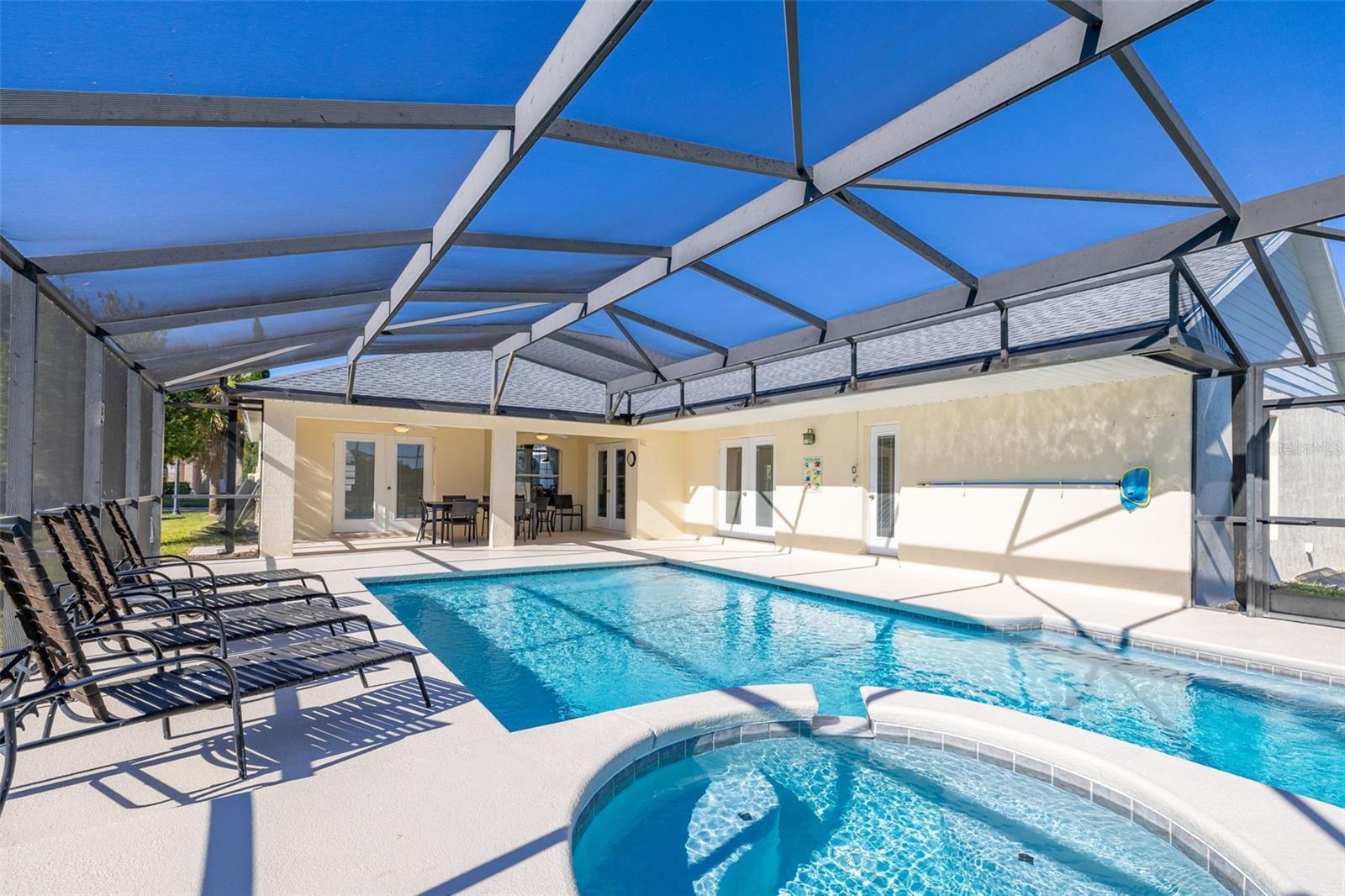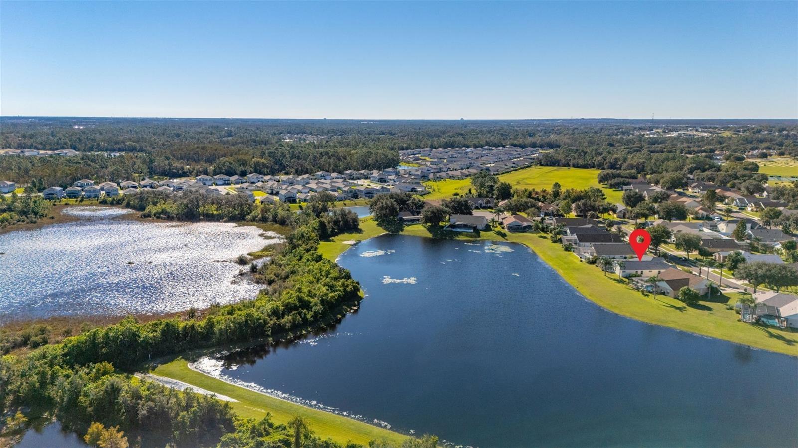 Welcome to 16313 Egret Hill Street, a stunning 5-bedroom, 4-bathroom home in the popular Orange Tree community, known for its generous lot sizes and one of the lowest HOA fees in the area. This exceptional single-story residence sits on an impressive 75' x 116' WATERVIEW LOT, offering breathtaking, wide-open water views that stretch across the entire back of the property and create a truly picturesque setting to enjoy from your private deck area. A NEW ROOF (2023) crowns this spacious 3,176 sq ft (2,324 heated) home, which includes THREE ENSUITE BEDROOMS. Custom stained-glass windows lend distinctive charm as you approach the deep covered porch and glass entry door. The moment you step inside, you’re greeted by an immediate view of the sparkling pool and tranquil lake beyond, a quintessential Florida “welcome home.” Warm-toned luxury vinyl plank flooring flows gracefully through the open-plan living and dining spaces and continues into the primary suite, where upgraded French doors with built-in blinds lead directly to the pool deck. The ensuite bath features an arched entry, dual vanity, garden tub, separate shower, private water closet, and beautiful natural light through a decorative custom window. The kitchen, truly the heart of the home, is equipped with a Samsung refrigerator (2021), Samsung microwave (2023), Bosch dishwasher, and electric range. It conveniently serves both the formal dining room and a breakfast nook, which also opens to the lanai through another set of French doors. The adjoining family room, with yet another set of doors leading outside, provides a bright, inviting space for family gatherings or entertaining guests. Heading down the hallway, you’ll find two additional ensuite bedrooms, one with its own lake view and pool access door, offering guests a private retreat, as well as two twin bedrooms that share a full bathroom. The dedicated laundry room includes a washer and dryer replaced in 2025, with access to the two-car garage, currently set up as a games room but easily convertible back. Inside the garage, you’ll find the NEW A/C UNIT (2023) and GAS WATER HEATER (2021). Step outside and experience a truly exceptional outdoor living space. The FRESHLY PAINTED (Nov 2025) extended deck and double lanai with ceiling fans create the perfect setting to relax, dine, or entertain. The GAS POOL HEATER (Dec 2024) and POOL PUMP (2024) ensure year-round enjoyment in warm, sparkling water, while the RESURFACED POOL AND SPA (2022) with elegant mosaic step accents adds a refined touch of luxury. With breathtaking LAKE VIEWS, this outdoor oasis offers an unmatched sense of peace and privacy, the kind of space that makes every moment feel like a vacation. The home’s freshly PAINTED EXTERIOR (Nov 2025) truly shines with pride of ownership. This home also includes a 5-year termite treatment warranty and a 1-year home warranty, providing added peace of mind. Whether you’re seeking a high-performing vacation retreat that captivates guests or a serene Florida sanctuary to call your own, 16313 Egret Hill Street is a rare gem that truly offers it all — from enchanting views of the Disney fireworks lighting up the evening sky to the spectacular rocket launches from Cape Canaveral, all visible from the comfort of your private deck