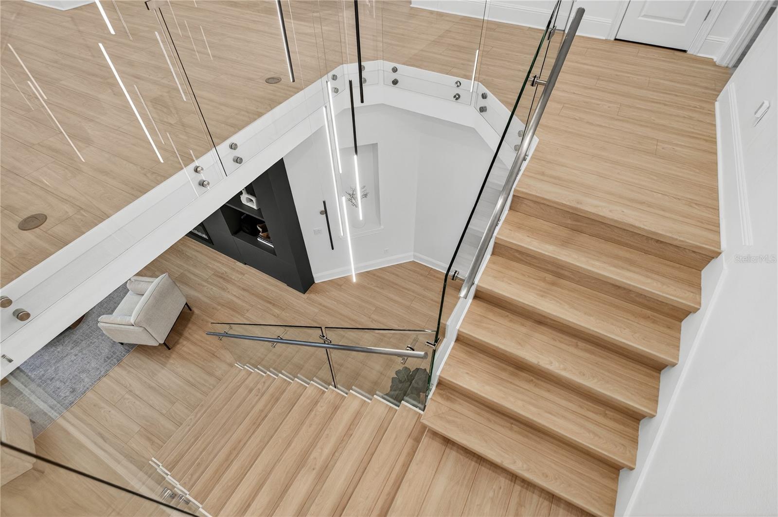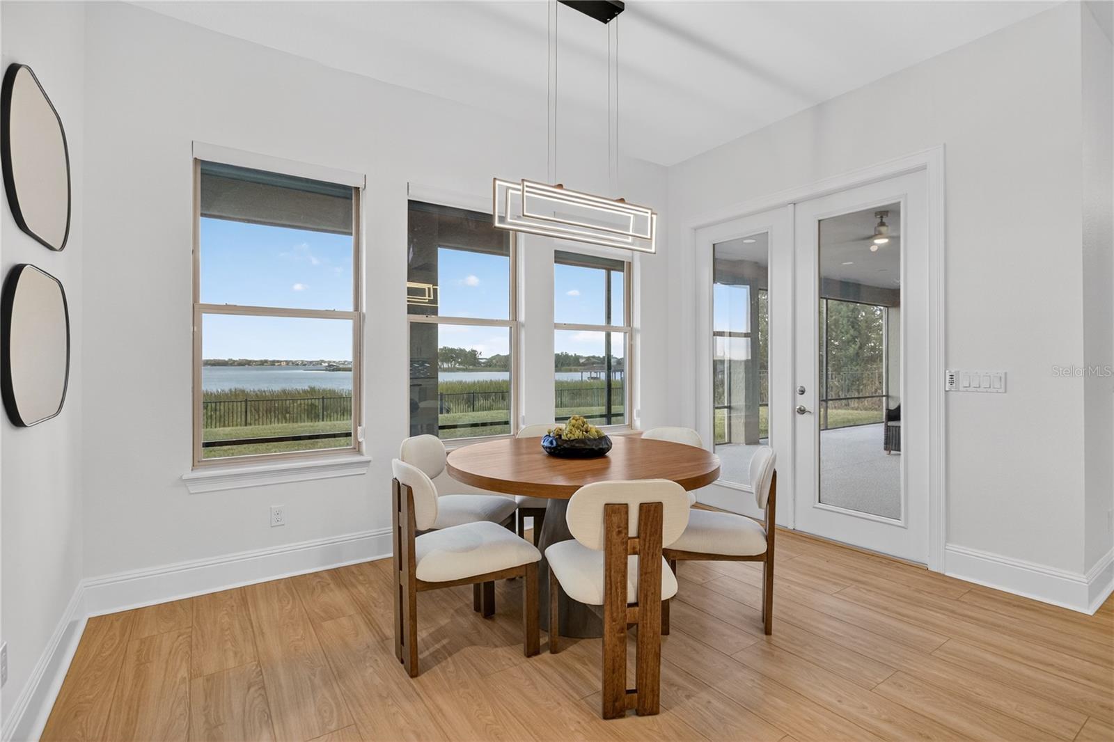 Perfectly positioned within Twinwaters, one of Winter Garden’s most sought-after communities, this remarkable 7-bedroom, 6.5-bath residence captures the essence of refined Florida living. Built in 2016 and extensively upgraded, it now combines modern sophistication with timeless design — offering over 5,200 square feet of thoughtfully curated space designed for both relaxation and entertaining. The home enjoys access to private, motorized Johns Lake, offering opportunities for boating, paddleboarding, and lakefront leisure, with ample room for a future dock and a resort-style pool to complete the lakeside lifestyle. Step inside a transformed space. Newly installed luxury vinyl plank flooring extends throughout the home, while new tempered-glass stair railings and upgraded LED lighting add a bright, contemporary edge. Every bathroom has been reimagined with custom cabinetry, quartz surfaces, frameless glass showers, and elegant fixtures. The primary suite, located on the main level, has been completely redefined into a private retreat featuring a custom-built headboard wall, floating side tables with integrated lighting, and a spa-like bath with slate tile, a freestanding tub, quartz counters, and a modern smart bidet toilet. A second ensuite bedroom on the lower level offers flexibility for multi-generational living or guest accommodations. The heart of the home centers around a grand living area, anchored by a custom-designed feature wall with an 85-inch built-in television, Samsung sound bar, and a Touchstone 84-inch recessed electric fireplace — blending architectural statement with warmth and comfort. The living area opens to an elegant dining space and a well-appointed kitchen featuring under-cabinet lighting, upgraded fixtures, and repainted cabinetry for a fresh, polished aesthetic. Smart-home features such as Schlage Encode smart locks, Ecowater purification system, Ring doorbell, and remotely controlled thermostats enhance everyday convenience. Upstairs, the entertainment experience continues with a dedicated home theater — a professionally designed space with a 120-inch built-in screen, projector, and surround sound system — See full description