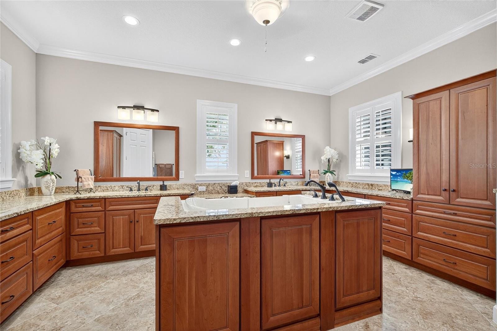 - Ceiling Fans(s), Crown Molding, Eat-in Kitchen, Kitchen/Family Room Combo, Living Room/Dining Room Combo, Primary Bedroom Main Floor, Solid Wood Cabinets, Stone Counters, Walk-In Closet(s)