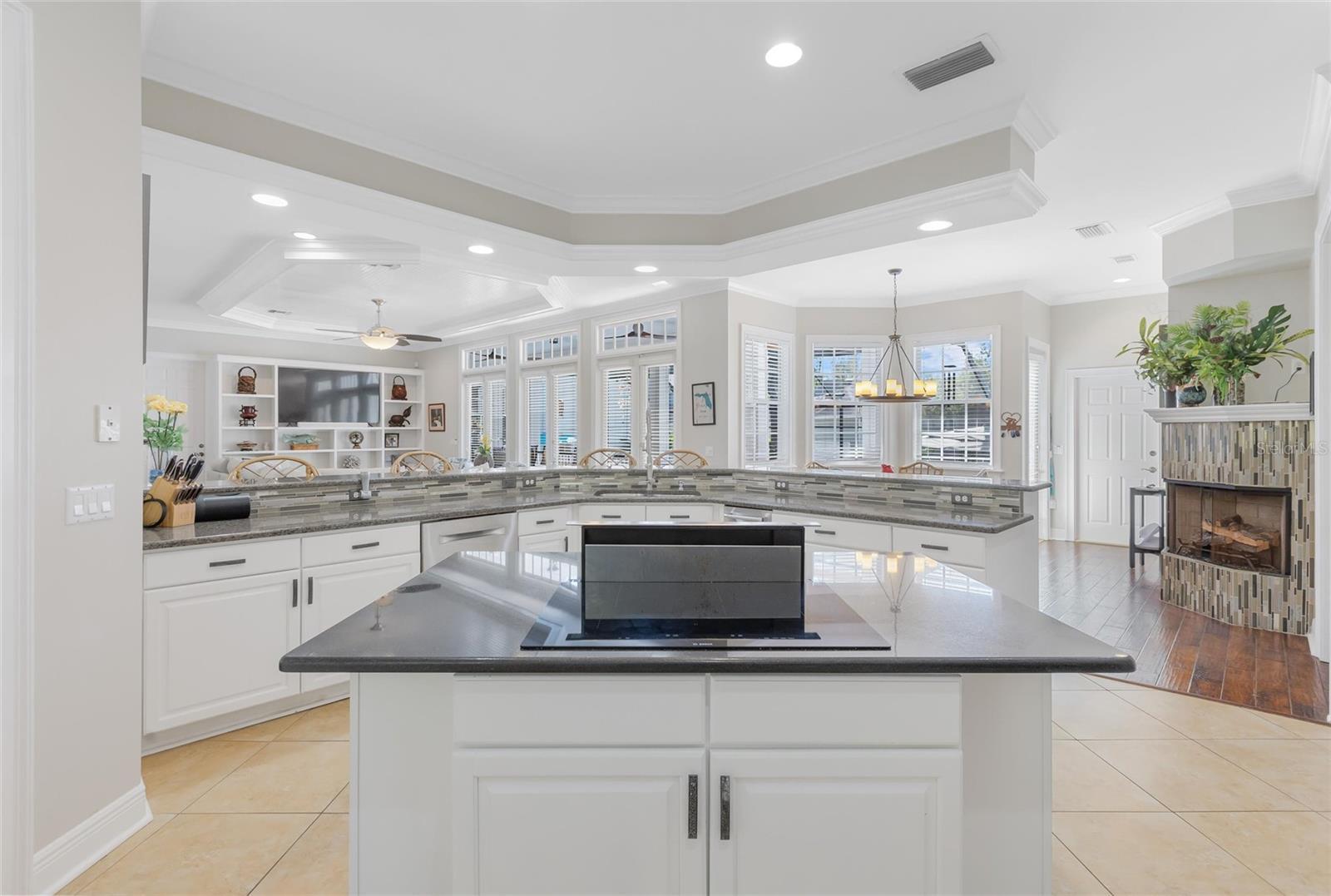 - Built-in Features, Ceiling Fans(s), Central Vaccum, Coffered Ceiling(s), Crown Molding, Eat-in Kitchen, High Ceilings, Kitchen/Family Room Combo, Open Floorplan, Primary Bedroom Main Floor, Solid Wood Cabinets, Stone Counters, Thermostat, Walk-In Closet(s), Window Treatments