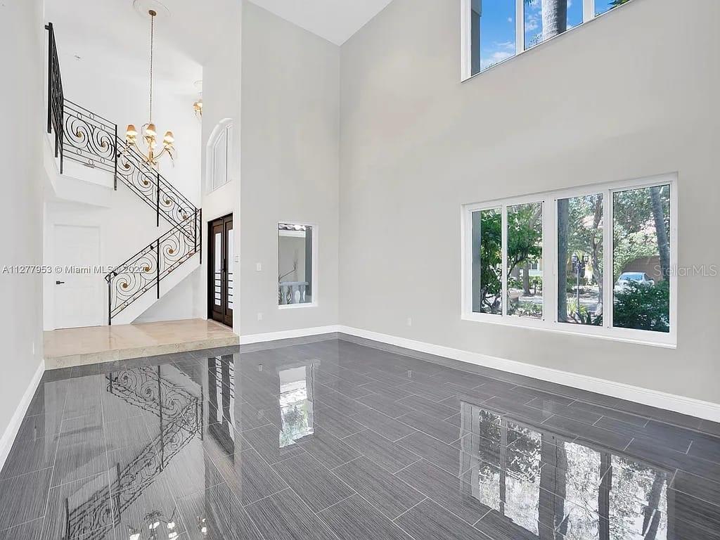 This exceptional luxury residence in Miami Lakes offers 6 bedrooms and 3.5 bathrooms, including two generous primary suites—one on the main level and another upstairs. The home welcomes you with a dramatic double-height foyer, sleek modern double doors, and elegant finishes such as marble floors, rich wood flooring, and custom wrought-iron railings. The interior layout features expansive living spaces filled with natural light, a beautifully redesigned open-concept family area, and a contemporary gourmet kitchen with stone-accented breakfast bar, premium appliances, and abundant windows overlooking the pool. The main-level primary suite offers direct access to the outdoor area and includes a spa-like bathroom featuring dual vanities, a soaking tub, and an oversized shower—designed to evoke a serene retreat. The upper-level primary suite offers exceptional space, abundant windows with plantation shutters, and a custom walk-in dressing room with extensive built-ins. Additional bedrooms are spacious and bright, each with modern fixtures and updated finishes. A stylish upstairs loft area overlooks the grand foyer, enhancing the home's sense of openness. Outside, the property offers a private swimming pool surrounded by lush landscaping and plenty of natural greenery, creating a calm and inviting environment perfect for relaxation or entertaining. Situated within an exclusive, highly secure gated community in Miami Lakes, this residence provides exceptional privacy and convenience. It is ideally located near the prestigious Don Shula Golf Club, the boutiques and restaurants of Main Street Miami Lakes, and top-rated schools.