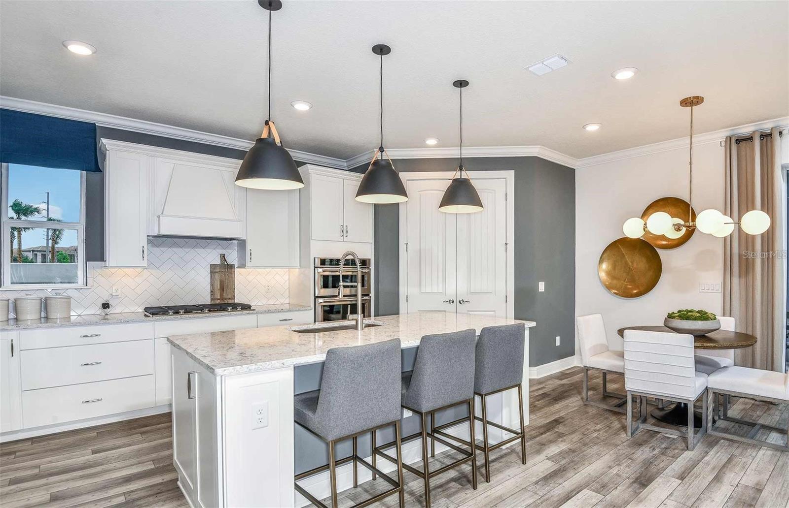 One or more photo(s) has been virtually staged. Isles of Lake Nona is an exclusive, gated, resort style community offering a premier waterfront lifestyle just minutes from Lake Nona Town Center, Medical City, and the USTA. With convenient access to Highway 417, residents enjoy quick commutes to downtown Orlando, Disney, and nearby beaches. Community amenities include a resort style pool with splash pad, full fitness center, sports courts, playgrounds, and HOA services covering landscaping, internet, gated entry, and amenity access. This spacious residence features 5 bedrooms, 4 bathrooms, a home office, a large open concept kitchen, café, and gathering room, a formal dining room, a covered lanai, a 3 car tandem garage, plus an upstairs loft and media room. Two additional upstairs bedrooms include walk in closets and share a full bathroom with dual sinks. High end finishes include white cabinetry, Pietra quartz countertops, a herringbone backsplash, KitchenAid appliances, a wood canopy hood, upgraded fixtures, pocket sliding doors to the lanai, luxury vinyl plank flooring in main areas, designer bathroom tile, and stain resistant carpet in bedrooms. The owner’s suite offers a spacious ensuite with dual sinks, glass enclosed shower, private water closet, and split walk in closets. Located on a homesite with no direct rear neighbors and part of the community’s final sales phase, this professionally designed home delivers both luxury and convenience an exceptional opportunity in highly sought after Lake Nona.
