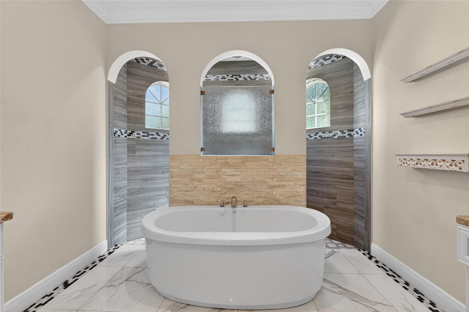 - Ceiling Fans(s), Crown Molding, High Ceilings, Primary Bedroom Main Floor, Stone Counters, Walk-In Closet(s)