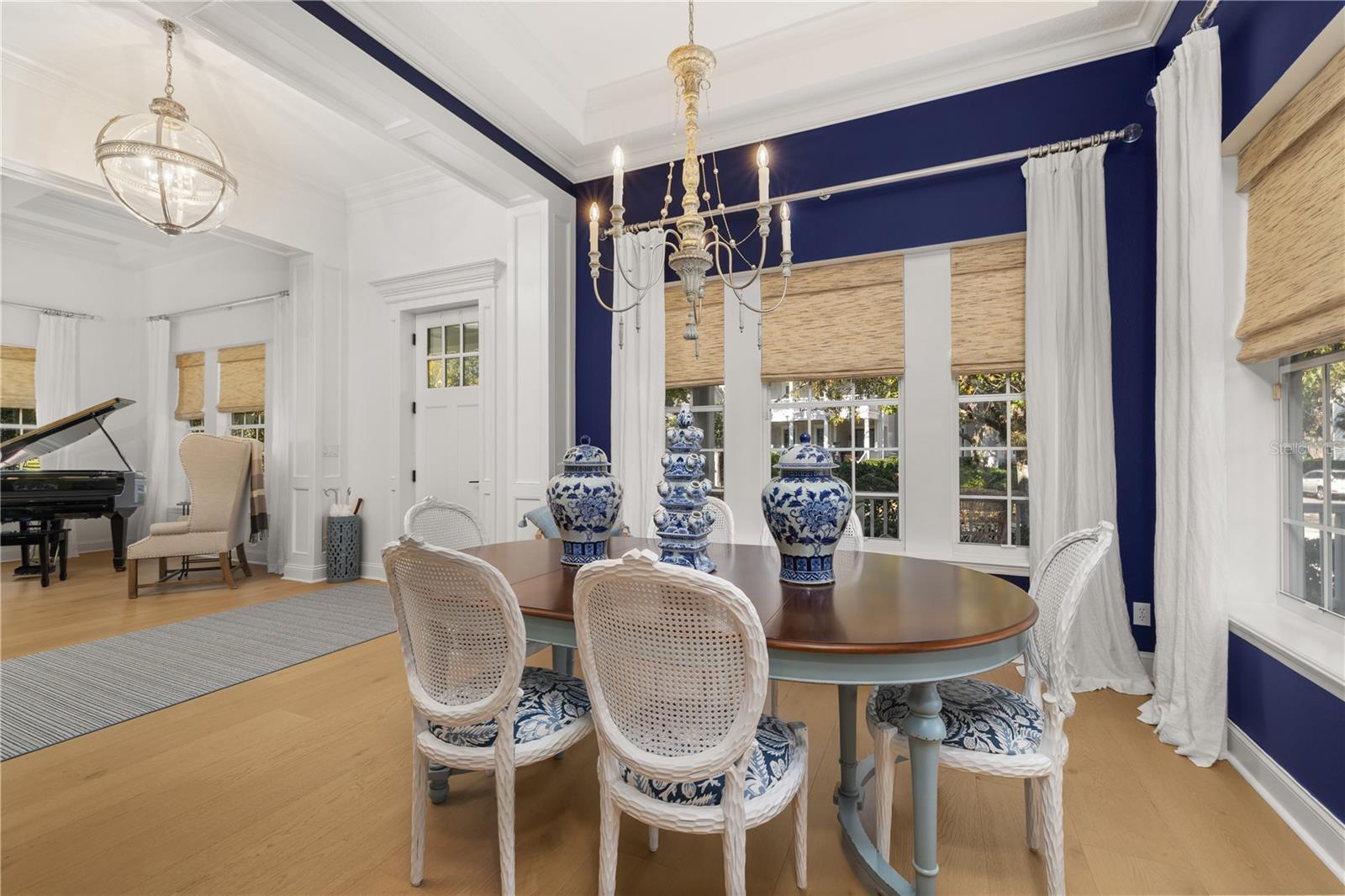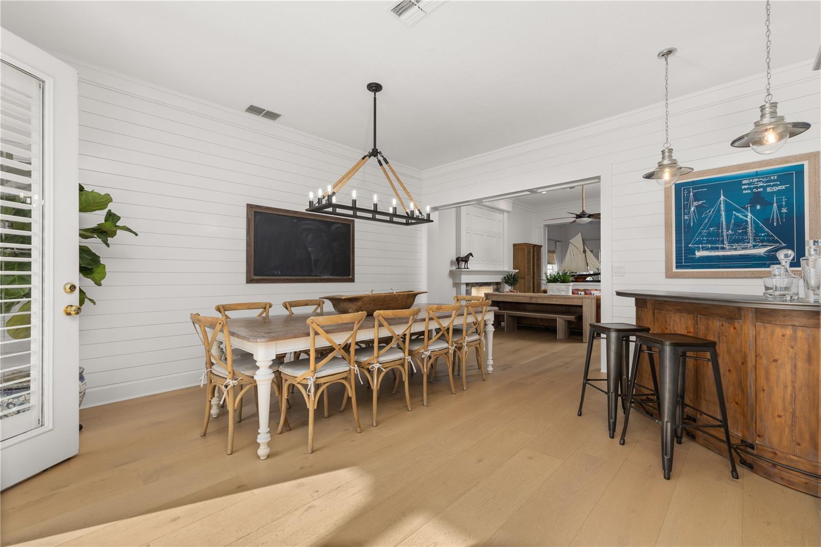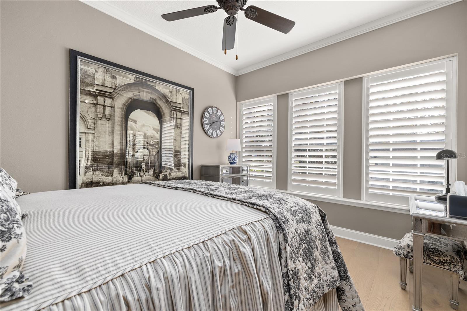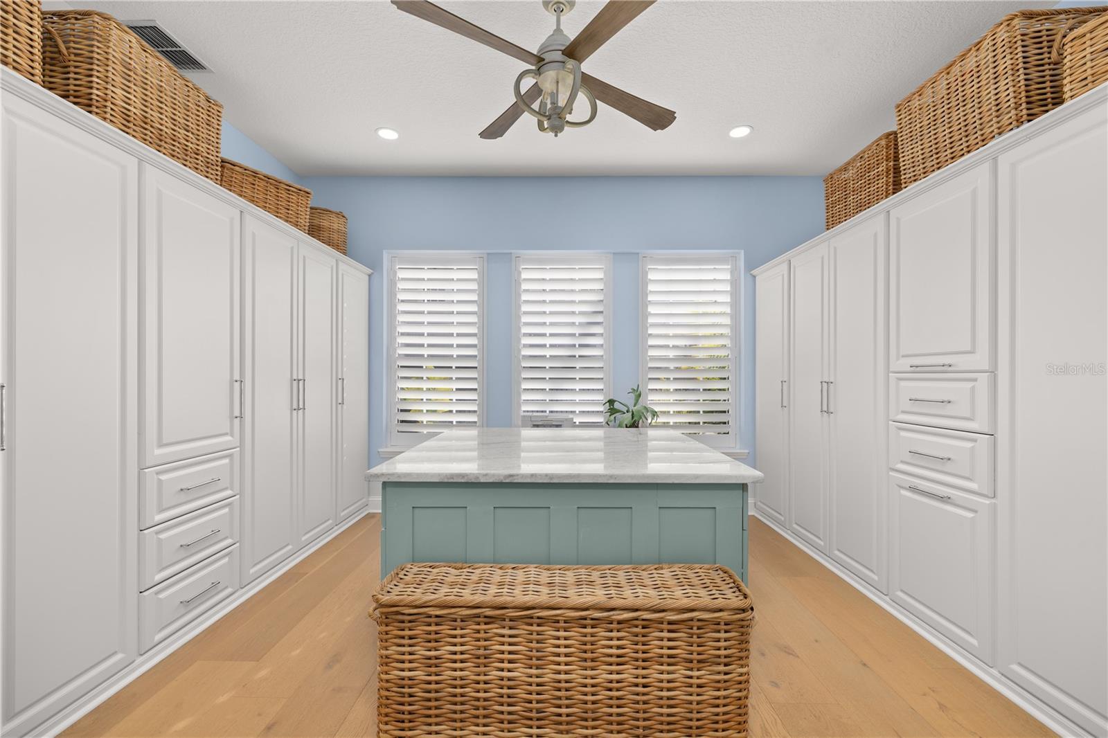 - Attic Ventilator, Ceiling Fans(s), Coffered Ceiling(s), Crown Molding, Eat-in Kitchen, High Ceilings, Open Floorplan, Primary Bedroom Main Floor, Solid Wood Cabinets, Stone Counters, Thermostat, Walk-In Closet(s), Window Treatments