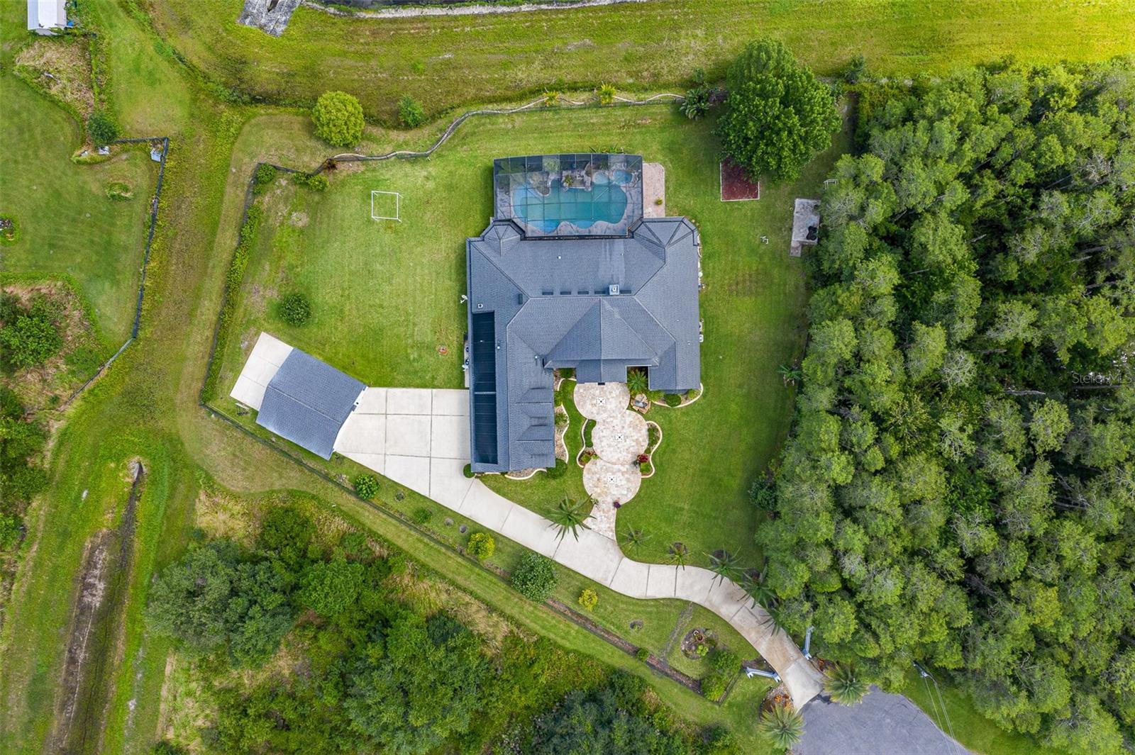 One or more photo(s) has been virtually staged. One or more photo's was virtually staged. Welcome to a private luxury retreat where refined design meets resort-style living. The home features formal living and dining rooms and a private office, all accented by custom built-ins, detailed moldings, and architectural finishes throughout. The chef’s kitchen is designed to impress with a large granite island, 6-burner gas cooktop, stainless steel appliances, custom range hood, and pot filler, opening seamlessly to an inviting family room with a custom cherry wood entertainment wall and bay window seating. Indoor-outdoor living shines in the enclosed lanai with a full summer kitchen overlooking a resort-style pool complete with waterfalls, lush tropical landscaping, and programmable lighting. The primary suite offers tranquil lake views and a spa-inspired bath featuring a sunken soaking tub with rich stone finishes and a spacious walk-in shower. The second floor boasts a large bonus room with a full wet bar and refrigerator, with an attached bedroom and full bathroom. All located on the second level making it ideal for guests or a private retreat. All additional bedrooms feature en-suite bathrooms for maximum comfort and privacy. Recent upgrades include a new roof and gutter system completed in 2024. The property also includes an oversized three-car attached garage, plus a detached 30’ x 30’ garage/workshop with a basketball court behind it. Pictures are staged. An adjacent CLEAN lot is available for sale offering an additional 1.26 acres to add privacy or future potential. No solar pannels as they were removed after installing new roof.