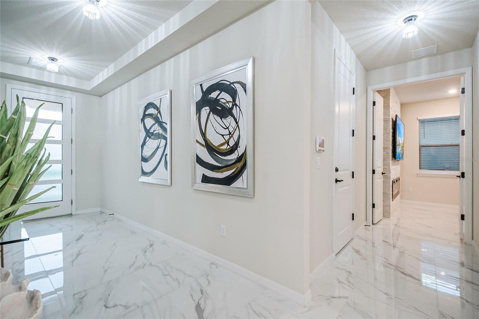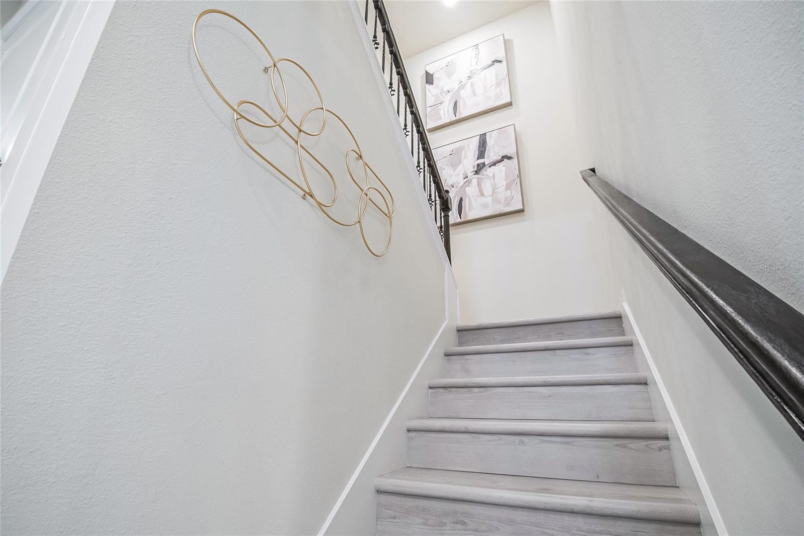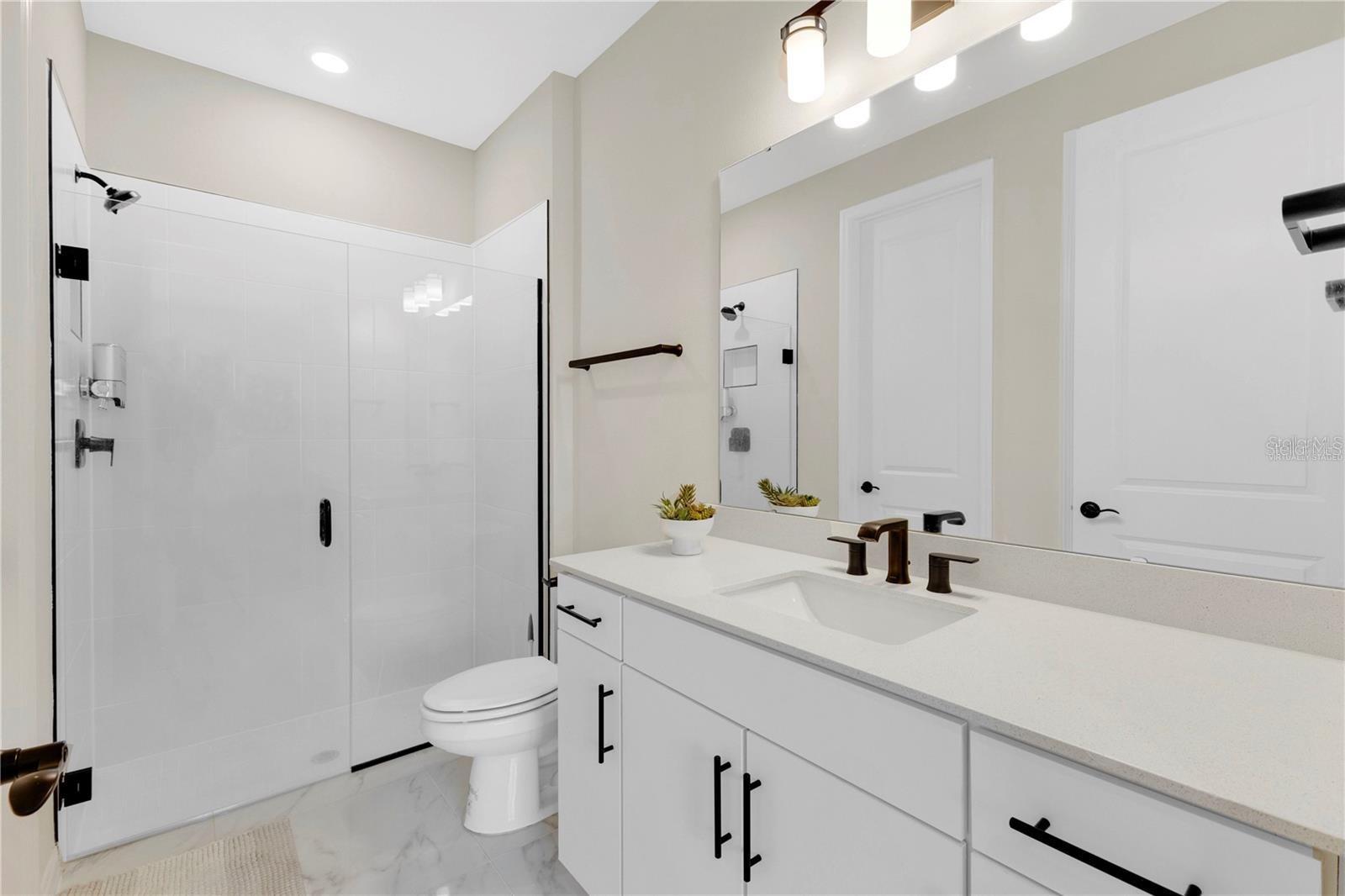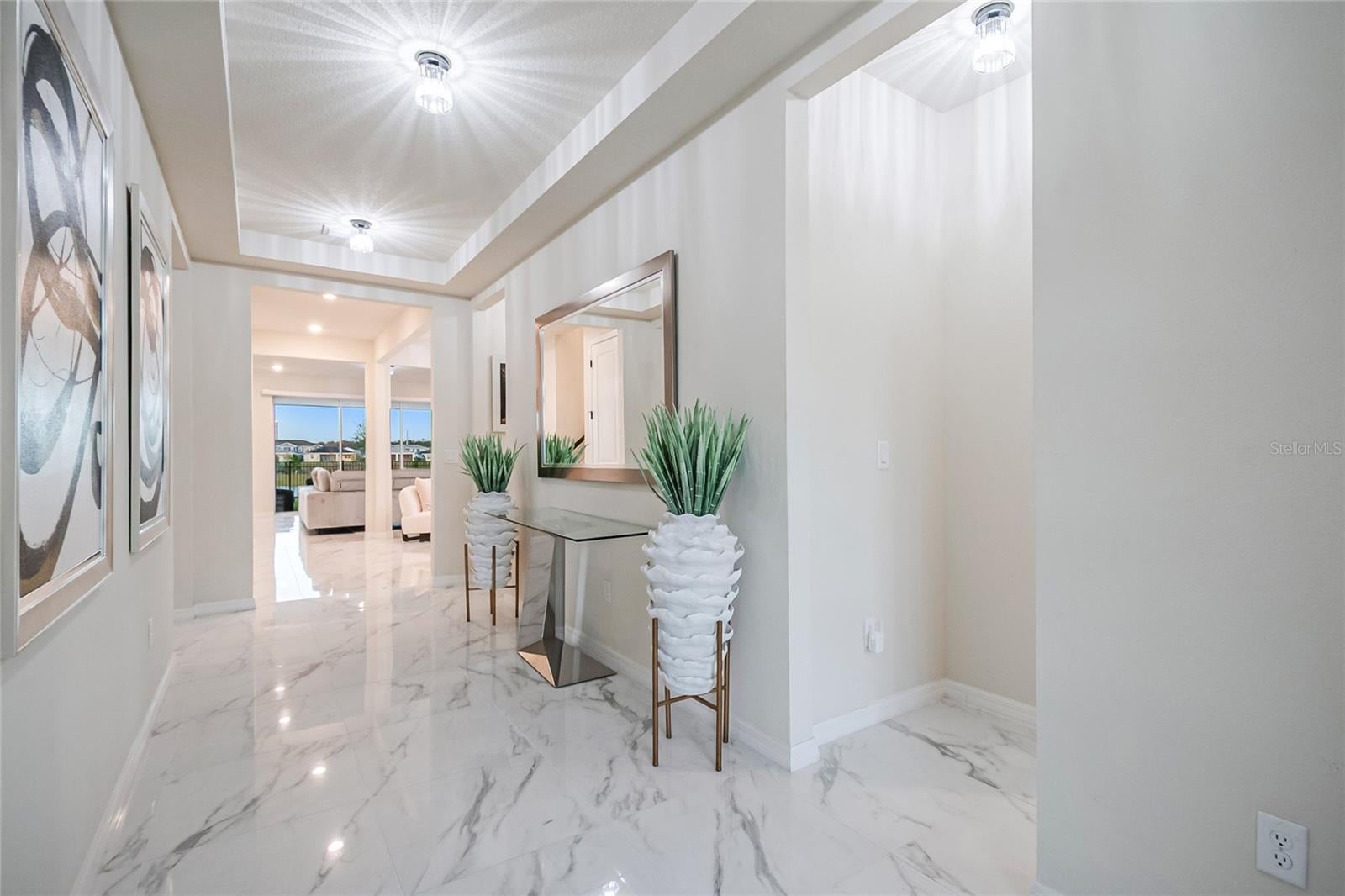 Impeccably upgraded with luxury finishes throughout, this exceptional lake-view residence is located in Ever Be, Orlando’s newest and most coveted master-planned community. The home offers 5 bedrooms, including 3 en-suite bedrooms, with one en-suite conveniently located on the first floor, one private office, 4.5 baths, and 3,777 square feet of thoughtfully designed living space. A striking sense of arrival begins with double doors leading into a spacious private study, featuring custom built-in bookshelves, a dramatic stone accent wall, and a sleek fireplace—an inspiring space for work or quiet retreat. The main level showcases large-format porcelain tile flooring and refined architectural details. The upgraded gourmet kitchen is a true centerpiece, with an oversized quartz island, quartz countertops, custom tile backsplash, under-cabinet lighting, and high-end KitchenAid appliances, offering both beauty and functionality for entertaining or everyday living. The main sitting room is enhanced by an additional stone accent wall and modern electric fireplace, where expansive windows invite you to enjoy breathtaking sunsets and a tranquil water view, creating a warm and sophisticated gathering space. Upstairs, the entire second level features luxury vinyl plank flooring in the elegant “Vintage Pearl” finish, complemented by upgraded lighting throughout, faux wood blinds, and California Custom Closets with built-in organizers in every bedroom. The staircase showcases upgraded wrought-iron spindles, adding refined architectural detail. A spacious second-floor loft with beautiful views provides flexible living space, perfect for a media lounge, game room, or family retreat. The owner’s suite is a serene sanctuary, boasting a spa-inspired bath with glass-enclosed shower, dual vanities, and a custom walk-in closet. Situated on a tranquil water-view lot, the expansive backyard is ready for your dream outdoor living and patio design. Additional premium upgrades include a 240V, 50-amp NEMA electric vehicle charging outlet, whole-home water softener, and an epoxy-finished garage with space for two vehicles plus additional driveway parking. Just steps from the clubhouse, this home offers access to Ever Be’s resort-style amenities, including a beach-entry pool, state-of-the-art fitness center, splash zones, sports courts, scenic trails, and a vibrant waterfront town center—all conveniently located near Orlando International Airport, Brightline, Lake Nona, and major highways. This is luxury living—impeccably designed, richly detailed, and set on a tranquil water-view lot.