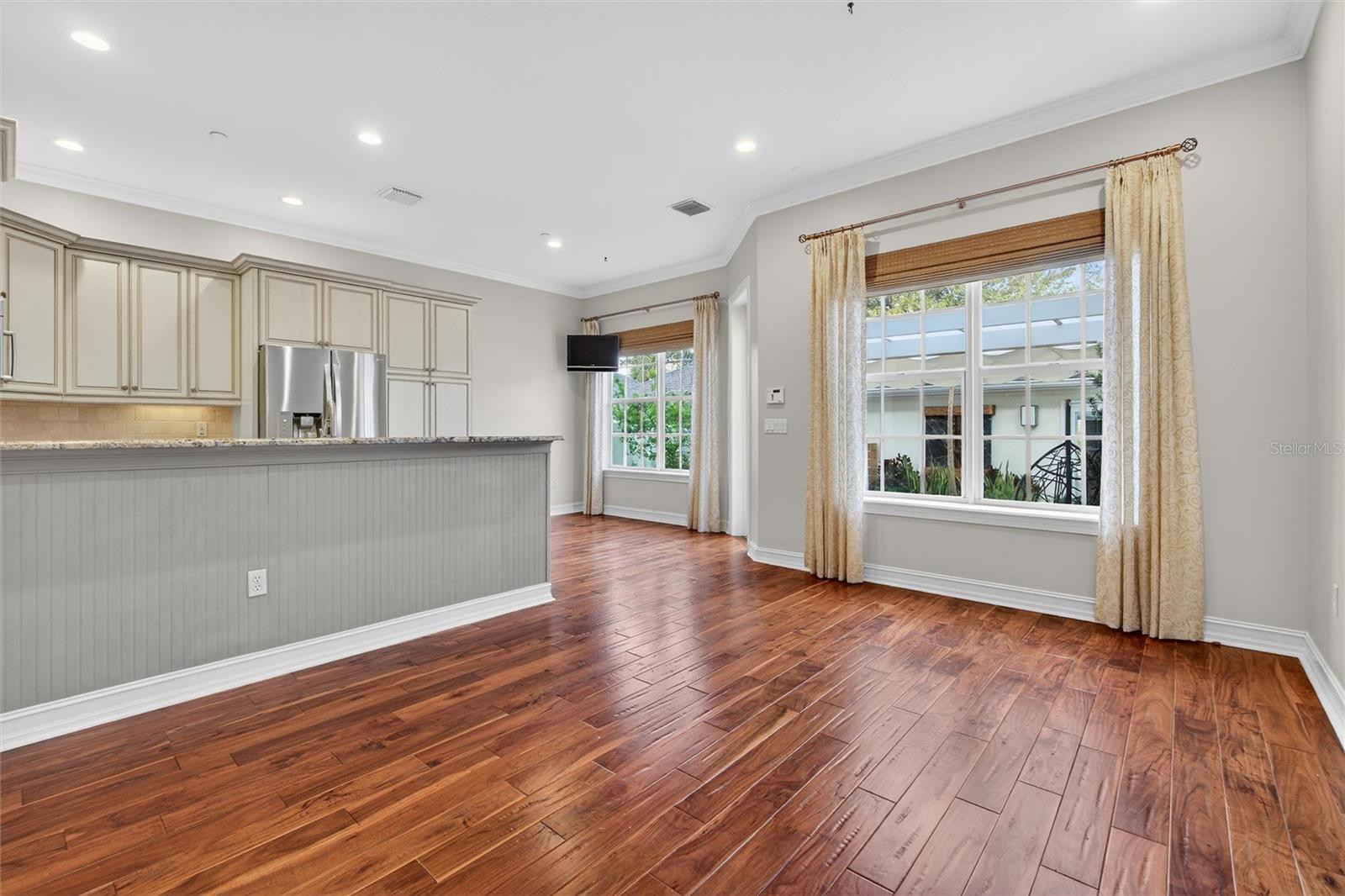 - Crown Molding, Eat-in Kitchen, Kitchen/Family Room Combo, Living Room/Dining Room Combo, PrimaryBedroom Upstairs, Solid Wood Cabinets, Stone Counters, Walk-In Closet(s), Window Treatments