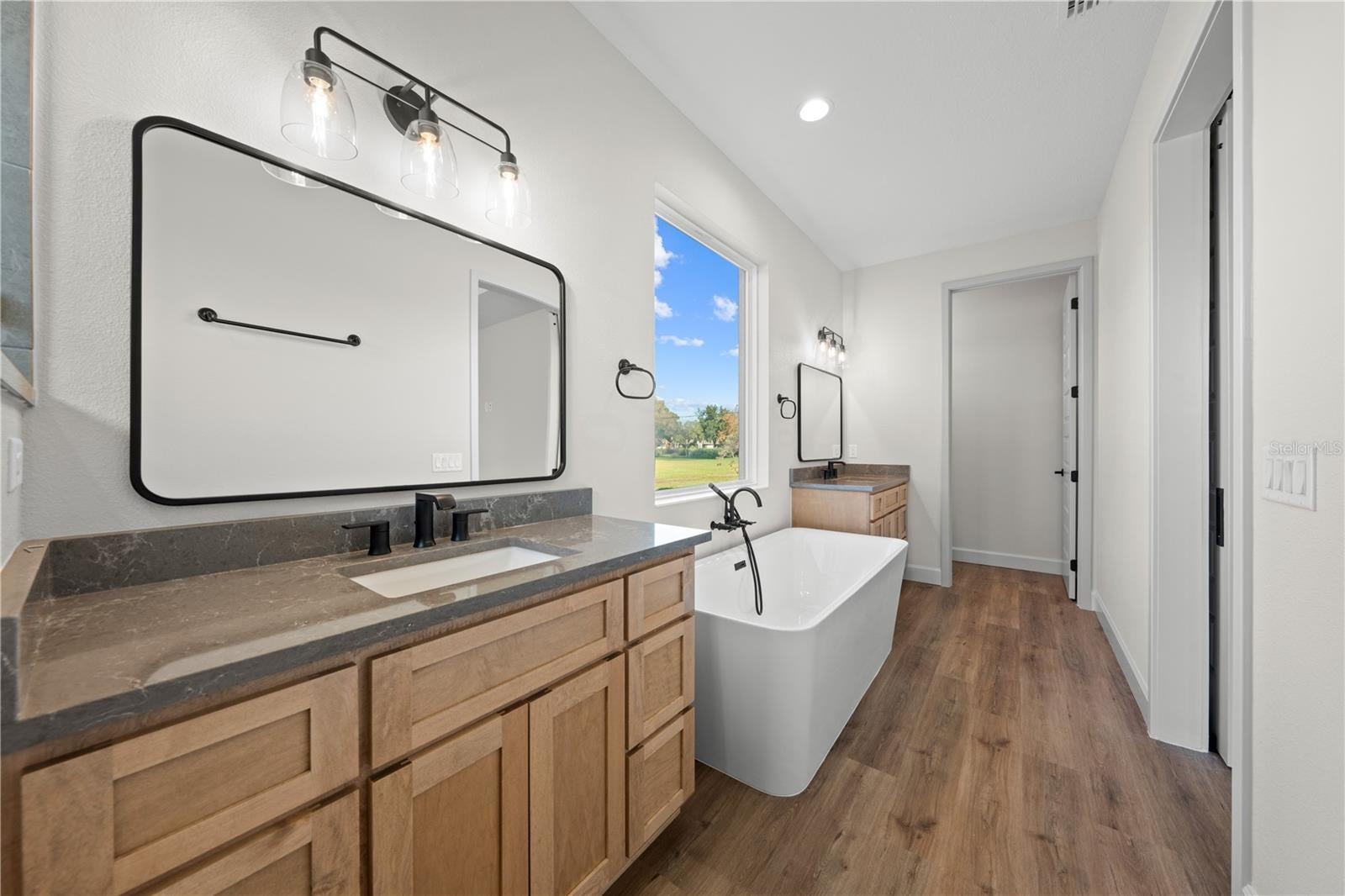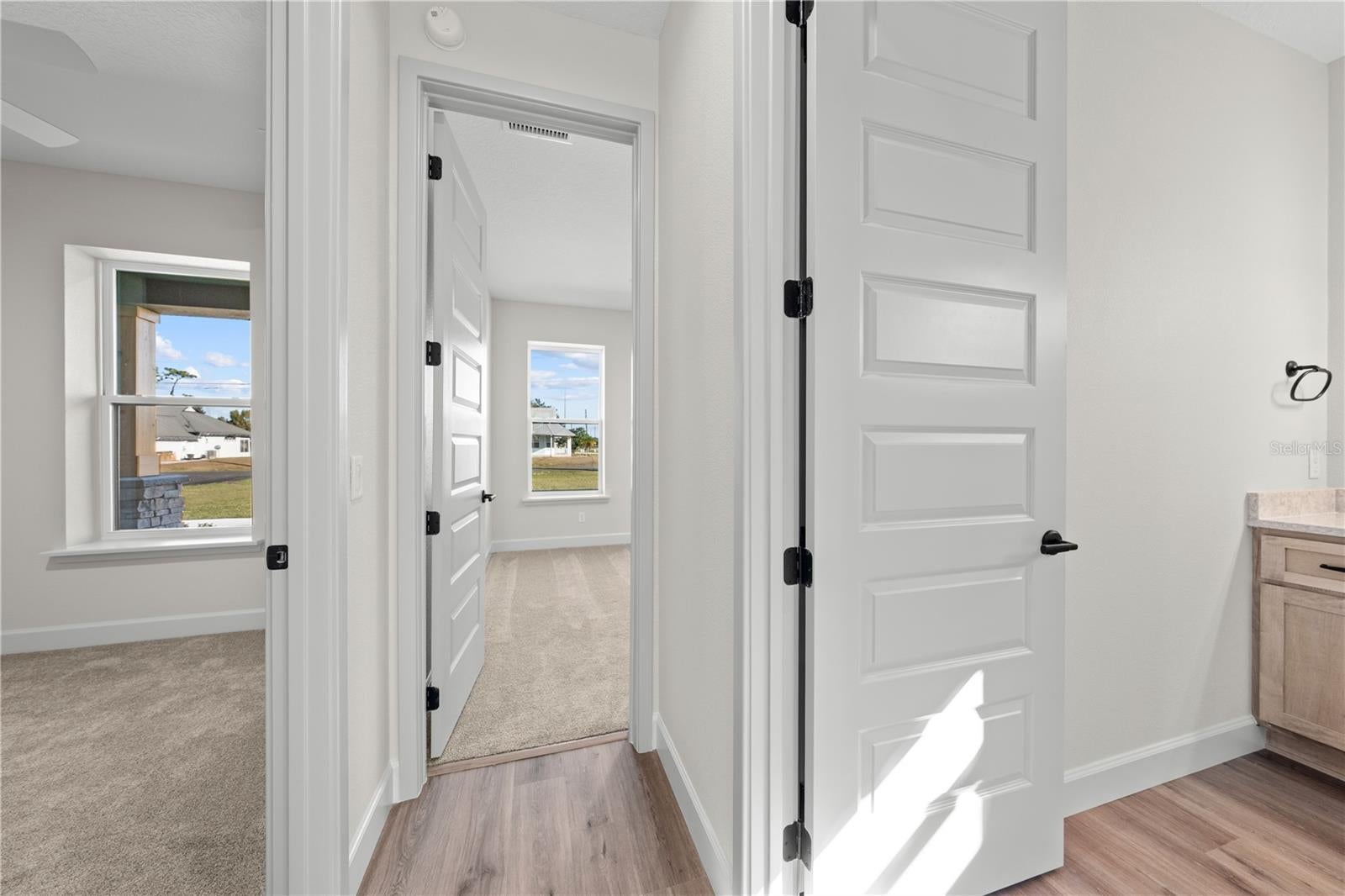 - Ceiling Fans(s), Eat-in Kitchen, Kitchen/Family Room Combo, Pest Guard System, Primary Bedroom Main Floor, Solid Wood Cabinets, Split Bedroom, Stone Counters, Thermostat
