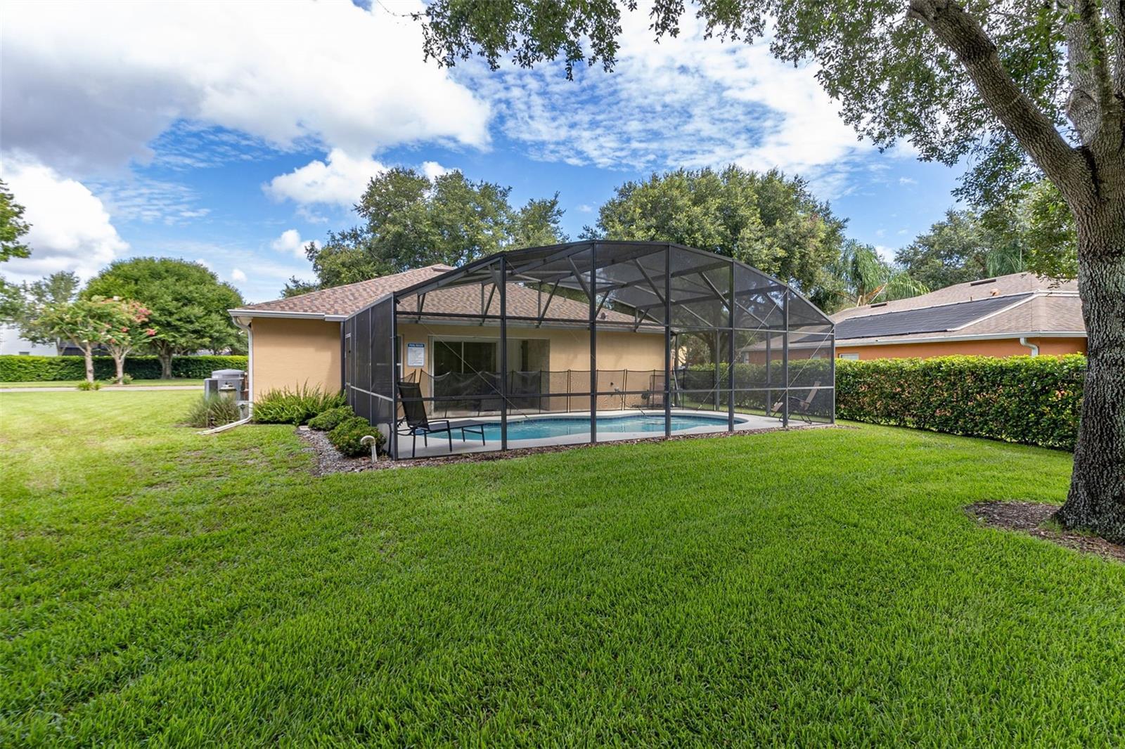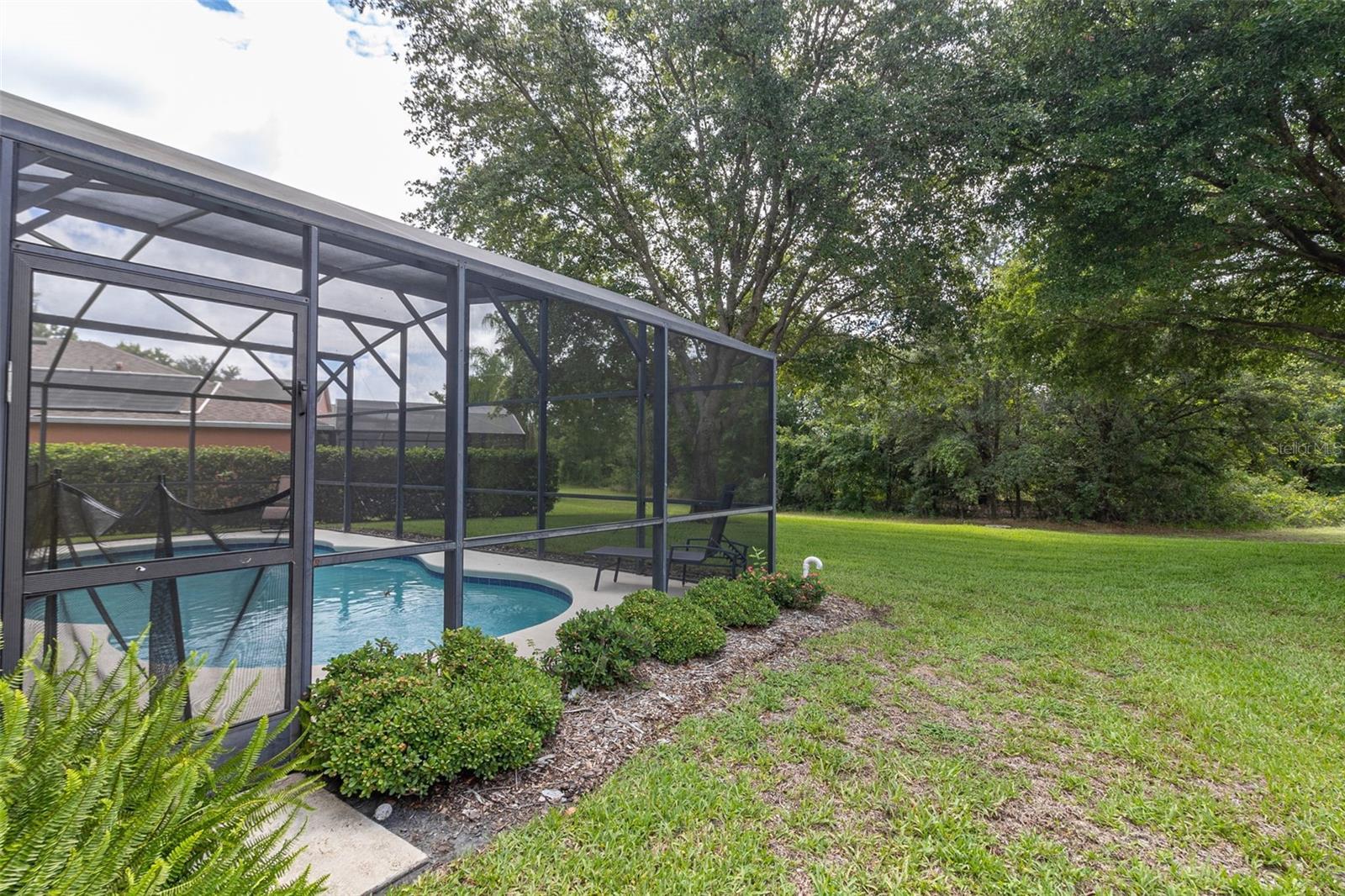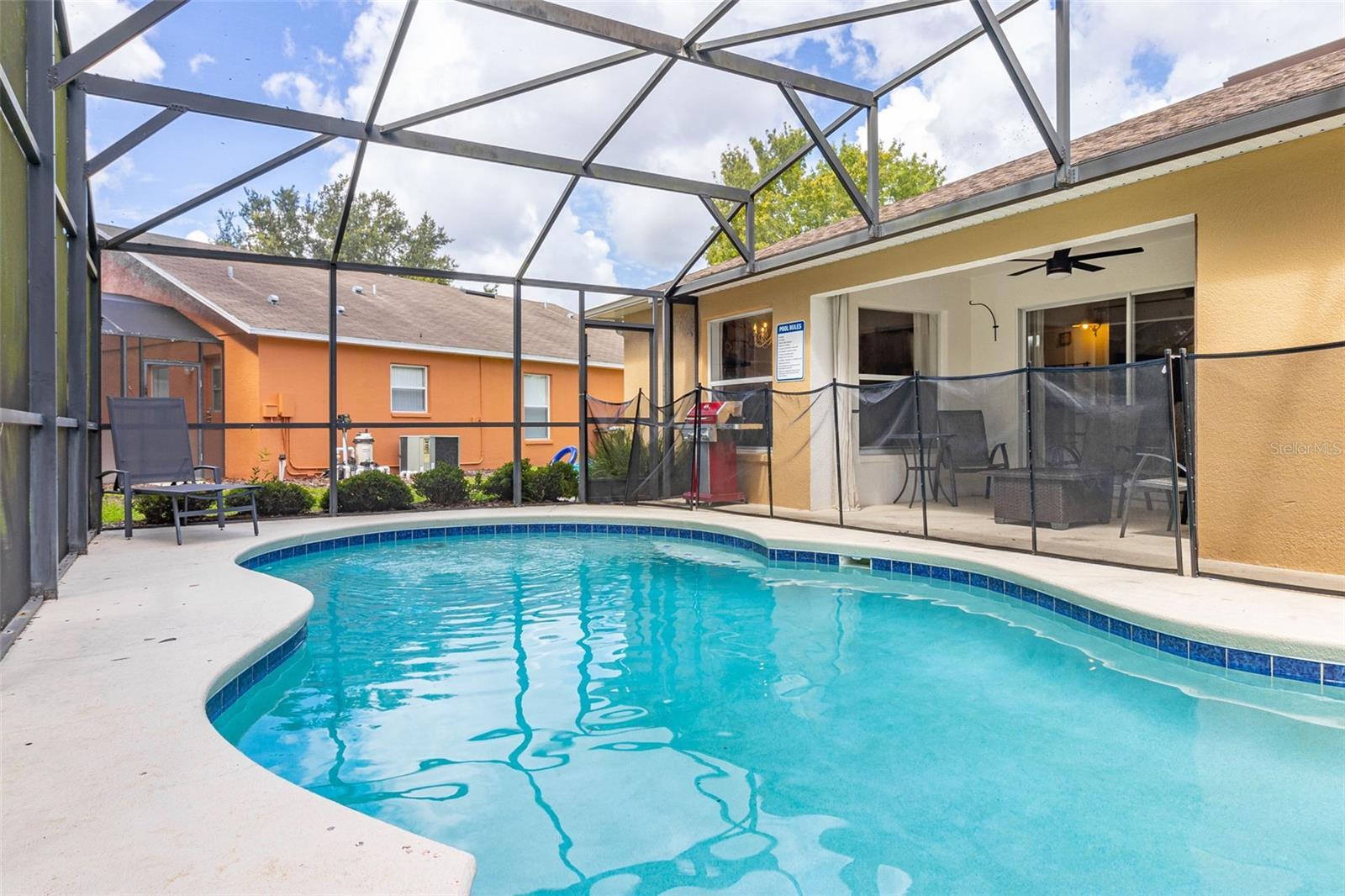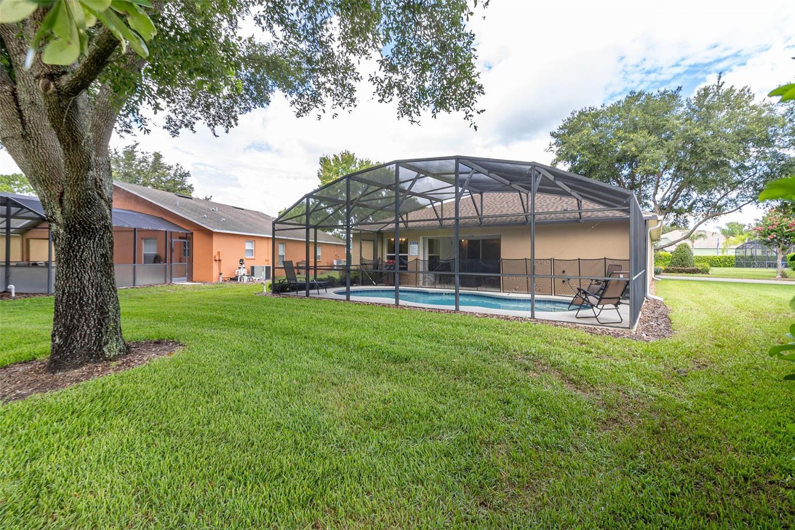 Welcome to tropical Paradise in this UPGRADED TURNKEY POOL HOME located on the PREMIUM OVERSIZED LOT (0.24 Acres) with LUSH CONSERVATION VIEWS! This home is ideally designed for family entertainment & relaxing living and showcases fantastic spacious POOL DECK with SCREENED ENCLOSURE and COVERED LANAI where family and friends come together to enjoy the outdoors. Sought after SINGLE STORY floor plan features beautiful CUSTOM DESIGNED RENOVATIONS as seen in the best home design magazines! QUALITY HOME IMPROVEMENTS include: NEWER ROOF (2021) with GUTTERS (2021), highly efficient variable speed 20 Seer Carrier HVAC SYSTEM (2019) for guaranteed comfort and the most savings. This favored layout features deep VAULTED CEILINGS and CERAMIC TILE FLOORING throughout (no carpet!); desirable OPEN FLOOR PLAN. Fall in love with impressive DESIGNER KITCHEN featuring beautiful custom pull out cabinetry complimented by stylish tile backsplash, upgraded STAINLESS STEEL APPLIANCES, RANGE HOOD venting outside for pleasant cooking experience, upgraded custom made countertops. The cozy BREAKFAST NOOK overlooks a sparkling pool area and opens up into a bright and roomy family room. TWO PRIVATE DELUXE MASTER SUITES featuring OWNER BATHROOMS - both recently remodeled. Guest bedroom with separate full bathroom featuring recent renovations as well. Custom painted door frames and doors with matching upgraded hinges & door handles; replaced ceiling grille covers, upgraded light fixtures and custom tile accent walls in the bathrooms and the lanai. Pie shaped lot allows extra space between the neighbors; privacy hedges planted outside complementing peaceful views. One car garage features custom shelving for extra storage, WASHER & DRYER included in the sale; 2-car tandem driveway. The Silver Creek HOA fees include cable TV, internet and lawn care; exterior re-paint every 5 years and NO CDD! Desirable location in the well established yet still growing Four Corners area conveniently located within only a short drive to the Town Center at Cagan Crossings, Disney parks, premium shopping & dining, minutes away from a beautiful Lake Louisa State Park, close to the best Florida beaches and all major roads. This is a lovely home perfect for a first-time home Buyer or a small family primary residency, second home or a profitable investment property. Zoning allows the flexibility of short term vacation rentals or long term leases. We welcome you to schedule a private showing and check it out!