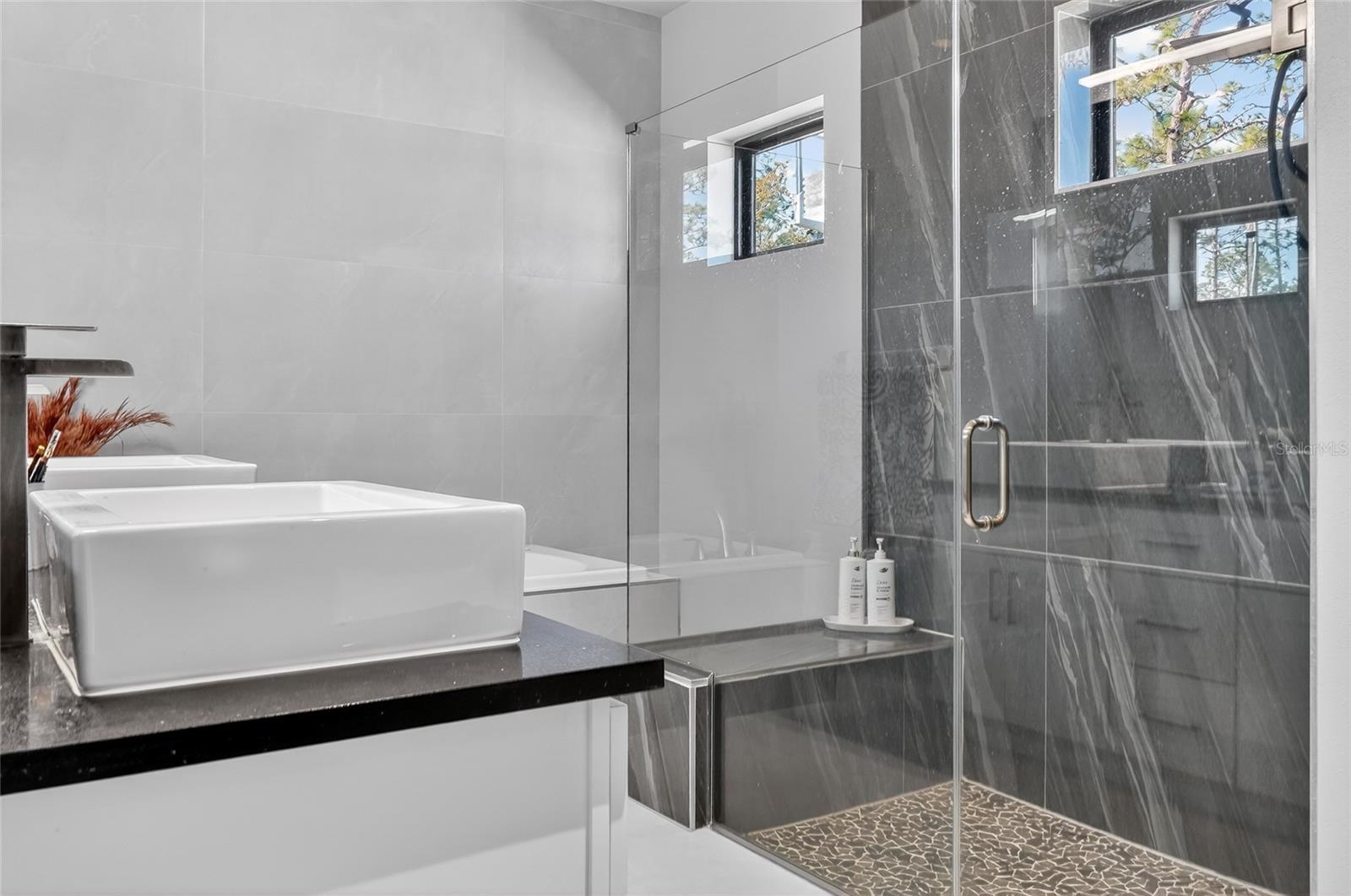 - Ceiling Fans(s), Eat-in Kitchen, High Ceilings, Open Floorplan, Solid Surface Counters, Solid Wood Cabinets, Stone Counters, Thermostat, Tray Ceiling(s), Walk-In Closet(s)
